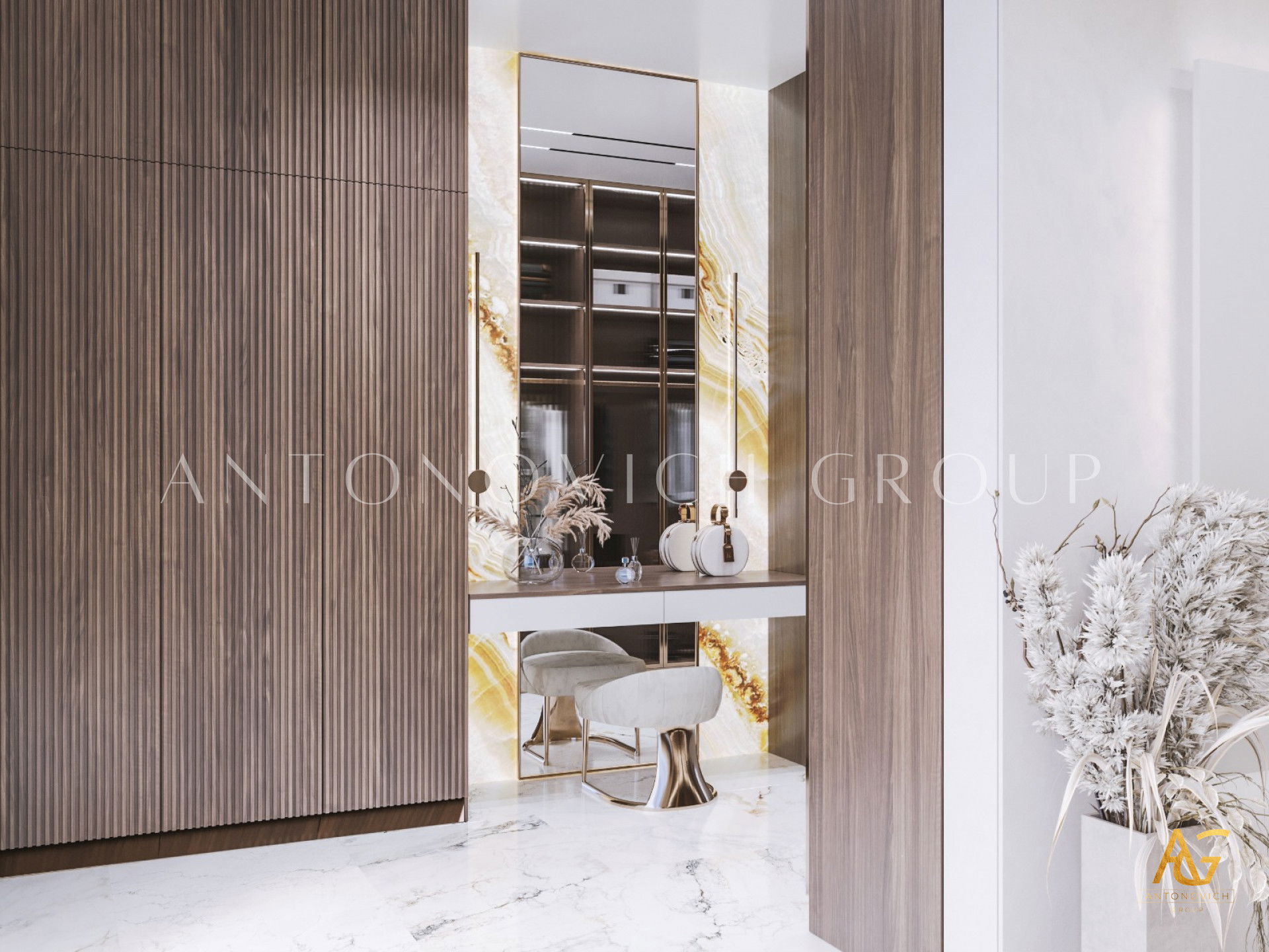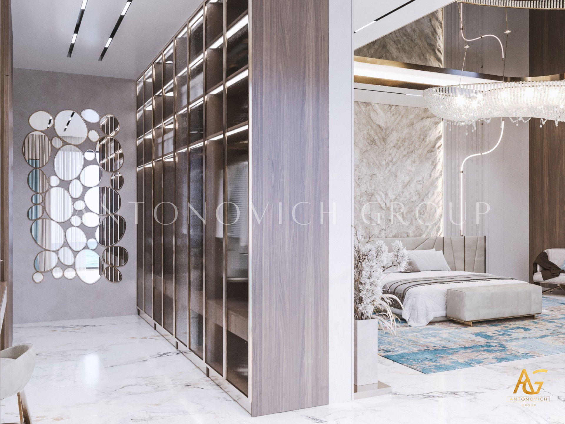 Создание просторной главной спальни с интегрированной ванной — подтверждение мастерства Антонович Групп в области премиальных интерьеров. Это не просто жилое пространство; это ансамбль элегантности, где каждая деталь усиливает общую идею комфорта и роскоши.