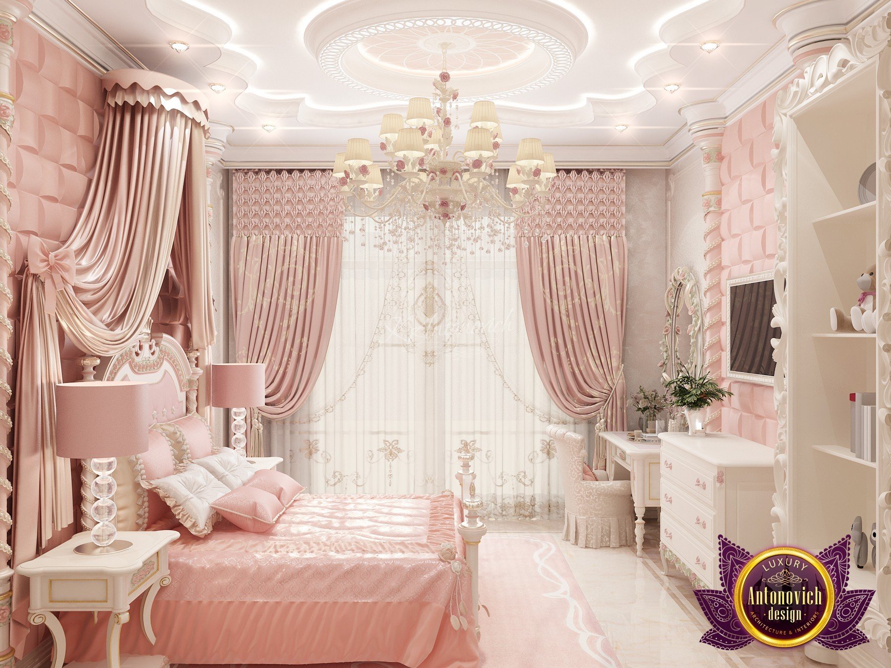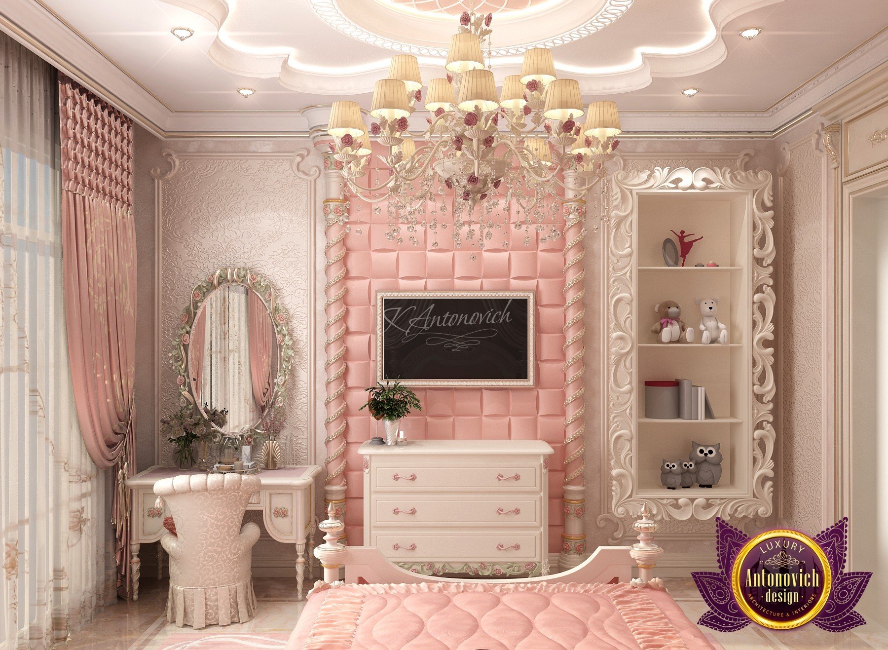 Как и в других проектах Катрины Антонович, здесь использован изящный потолочный дизайн для детской и необычная бабочья хрустальная люстра, которая создаёт волшебное, праздничное настроение.