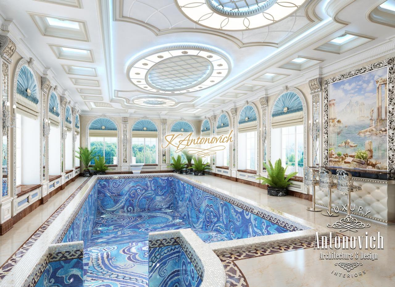 Грандиозный по масштабу проект дома в Абу-Даби включает дизайн большого бассейна. Дизайнеры создали интерьер роскошной квартиры, впечатляющий своим видом — это роскошный дизайн виллы Абу-Даби, подчёркивающий престиж дома. Главную роль в этой композиции играет большой роскошный бассейн — бассейн с авторской мозаикой, отделка бассейна мозаикой выполнена из изысканных узоров, что позволяет рассматривать бассейн как произведение дизайна. арочные окна у бассейна окружают зону отдыха практически со всех сторон. Использованы римские шторы для бассейна и навесы из синего шелка. такой интерьер бассейна в вилле подчёркивает утончённый вкус владельцев и их любовь к искусству: художественные скульптуры и картины выглядят особенно изысканно. этот проект роскошной виллы привлекает внимание своей гармонией и эстетикой.