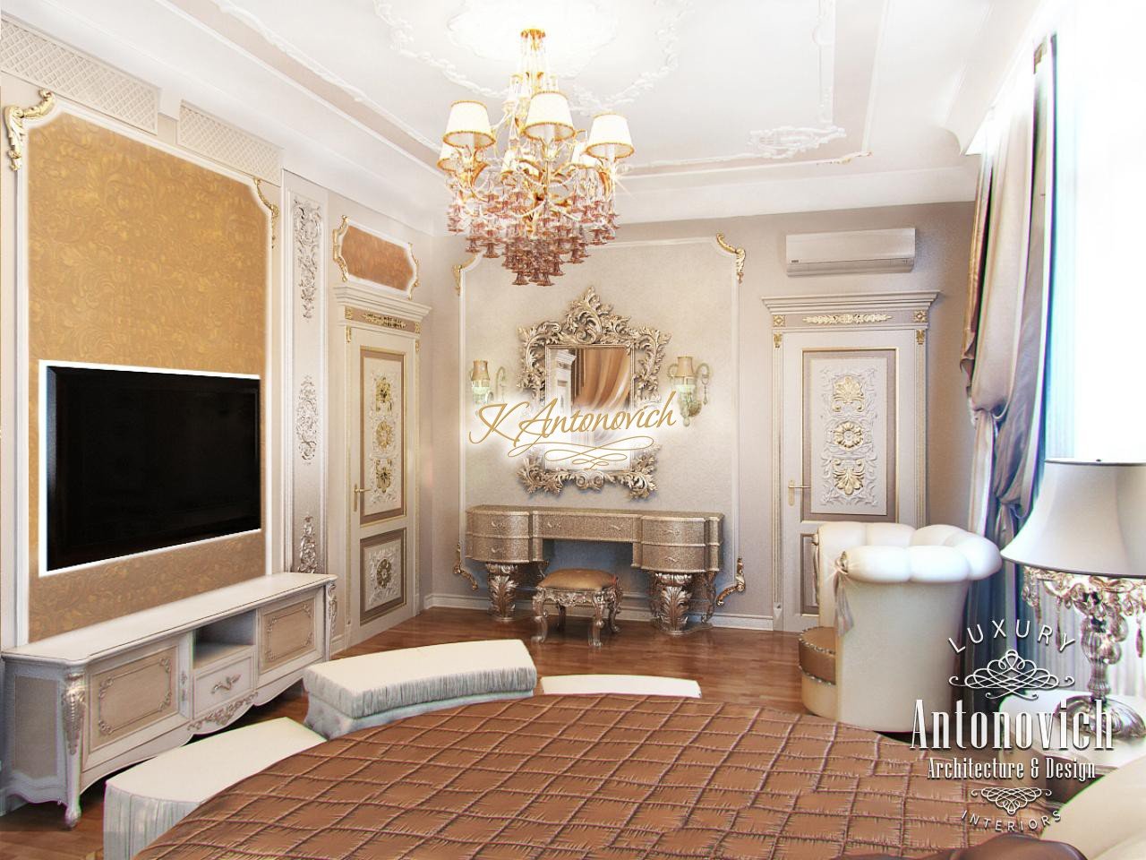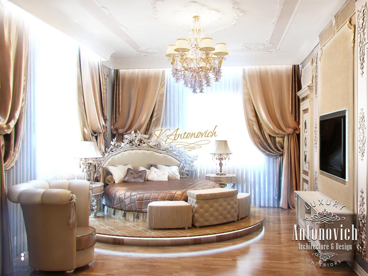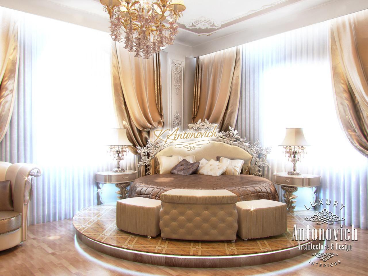 Экстраординарный по своей красоте дизайн спальни предложен люксовой студией Антонович Дизайн (Antonovich Design) в роскошной квартире. Элегантный и изысканный, стильный и светлый интерьер с особенно романтичным шармом тонко отражает характер и индивидуальность владельца квартиры. В этом проекте дизайн спальни в Дубае учитывает архитектурную планировку квартиры и подчёркивает, что в углу комнаты расположены два больших окна. Чтобы довести образ интерьера до завершённости, дизайнеры разместили большую удобную круглую кровать на низком подиуме в углу между двумя окнами — круглая кровать на подиуме стала ярким элементом индивидуальности. Подиум в спальне, как и пол, оформлен деревянными половыми досками из ценных пород. Деревянные половые доски из ценных пород покрывают подиум и пол, придавая пространству тёплую фактуру. LED-подсветка подиума по периметру пола смотрится эффектно. Конфигурация кровати полностью вписывается в этот образ: у кровати также есть высокое мягкое изголовье с резьбой, обитое тканью. Жалюзи из шелка двух оттенков наполняют уютную спальню настроением и подчёркивают её респектабельность. В интерьере присутствует мягкая мебель кремового бархата, а настроение нежности и грации дополняют декор со снежно-белыми завитками потолочных молдингов и изысканные люстры. Дизайн спальни изящно повторяет все мотивы интерьера квартиры и при этом сохраняет собственную уютную и соблазнительную атмосферу.