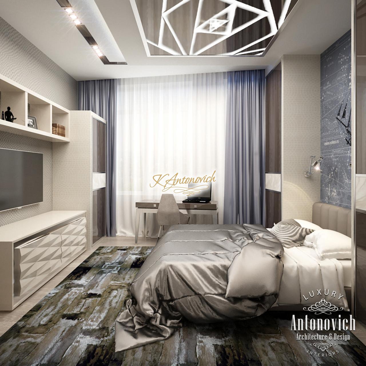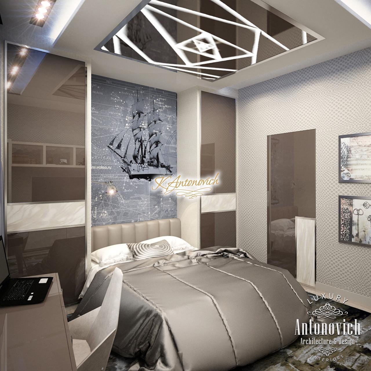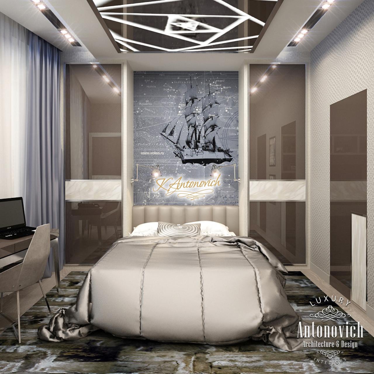 Современный стиль с ноткой хай-тек идеально подошёл для реализации этого проекта: спальня для подростка. Комната создана для старшего сына владельцев квартиры. Если весь интерьер квартиры выполнен в роскошной и изящной манере ар-деко, то в спальне для подростка в современном стиле дизайнеры предложили полностью отойти от общей концепции и учесть мечты и желания владельца комнаты. Интерьер получился выразительным и динамичным — динамичный интерьер подростковой спальни задаётся оригинальным дизайном потолка. В проекте показана спальня в стиле хай-тек для подростка. Потолок с оригинальным дизайном спальни представляет собой глянцевую панель с абстрактным рисунком, окружённую дополнительной подсветкой. Очертания декоративного элемента визуально повторяют периметр зоны сна. Удобная кровать в оттенке шёлкового стального цвета выглядит стильно на фоне художественной росписи со стилизованным изображением корабля через звёздную карту. В интерьере доминирует приятная гамма холодных тонов. Чтобы смягчить ощущение прохлады и добавить тепла, для отделки выбран натуральный деревянный пол в спальне подростка и большой пушистый ковёр, что формирует уютная спальня для подростка с ковром. Эти утончённые детали авторского проекта подчёркивают респектабельность квартиры, сохраняя стилистическую направленность. В проекте — дизайн спальни для подростка сочетает отличную функциональность и эргономику: функциональная мебель для спальни подростка в кремовых оттенках с глянцевыми и объёмными фасадами дополняет интерьер яркими акцентами. Яркие цвета в отделке стен обеспечивают визуальное расширение пространства в спальне, создавая ощущение лёгкости и простора. В проекте отражён также интерьер спальни для мальчика подростка — сбалансированный, комфортный и современный.