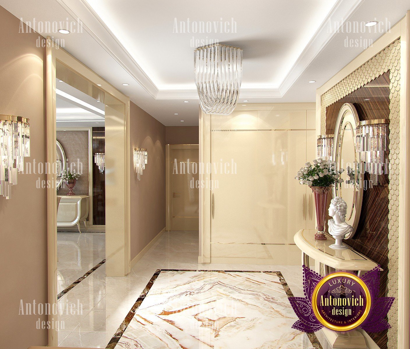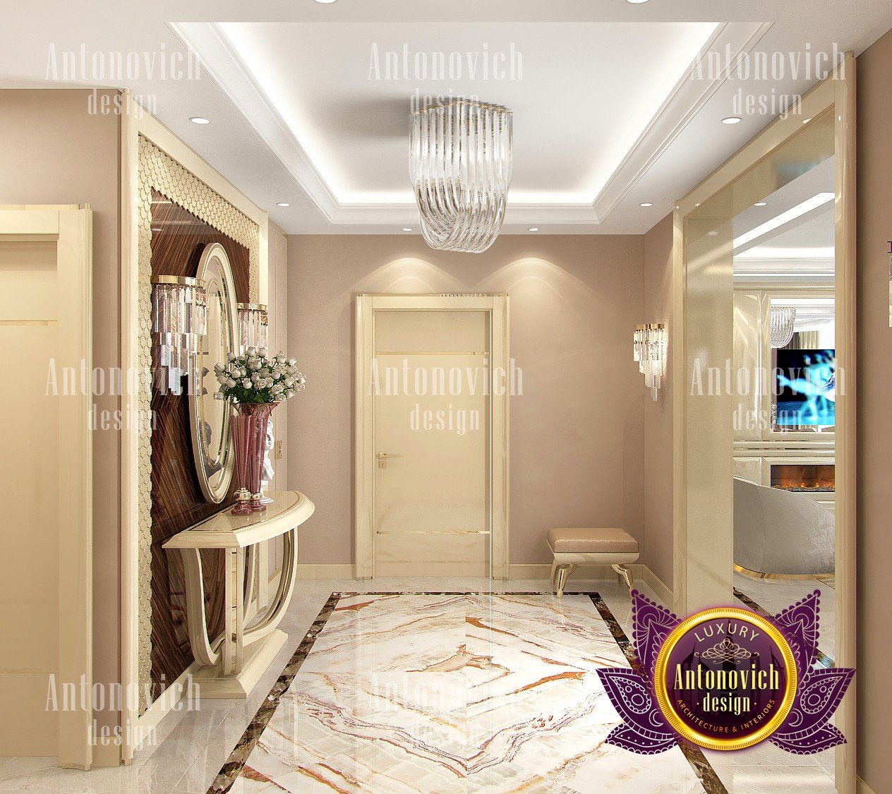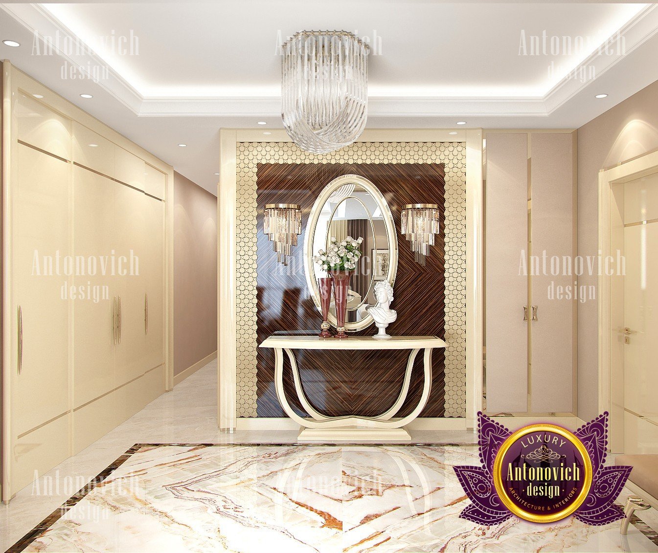 Дизайн дома в Абу-Даби сочетает восточный колорит и традиции классического стиля. Роскошный дизайн гостиной выражается в богатом декоре и изящных деталях. Интерьер гостиной в классическом стиле формирует единый образ холла и нескольких зон отдыха. В гостиной — мраморная лестница с кованым ограждением, это создаёт эффект гостиная с мраморной лестницей и впечатление гостиная с кованым ограждением. Интерьер гостиной с мрамором подчёркивает благородство материалов. Мраморные полы украшены причудливыми резными узорами нескольких оттенков мрамора. Витки резных узоров повторяются в декоре потолка. Потолки заполнены пышными завитками лепнины, покрытой сусальным золотом — это декор гостиной с позолотой, который подчёркивает торжественность интерьера. В этом сияющем пространстве мебель с резной отделкой и бархатная обивка рубинового цвета выглядит идеально. В оформлении стен полупилястры с капителями из лепнины выглядят изысканно. Такие решения создают богато украшенный интерьер гостиной. Буазери оформлено резным декором и дополнено шелковыми обоями с принтованными узорами, при этом шелковые обои в гостиной придают интерьеру благородство. Блеск и сияние роскошной гостиной усиливает хрустальная люстра в гостиной с множеством подвесов. Дизайн гостиной полон тонких деталей и стильных акцентов. Двери, ведущие в другие комнаты, инкрустированы резным декором и дополнены мягкими обивочными элементами. Центральную часть интерьера занимает портал с высокими потолками, тянущимися на всю высоту дома. В этой части расположен мраморный фонтан в гостиной с мягкой голубой подсветкой. Дизайн виллы в Абу-Даби воплощает дворцовую современную роскошь, где восточный колорит и классические мотивы переплетены с возможностями современных технологий.