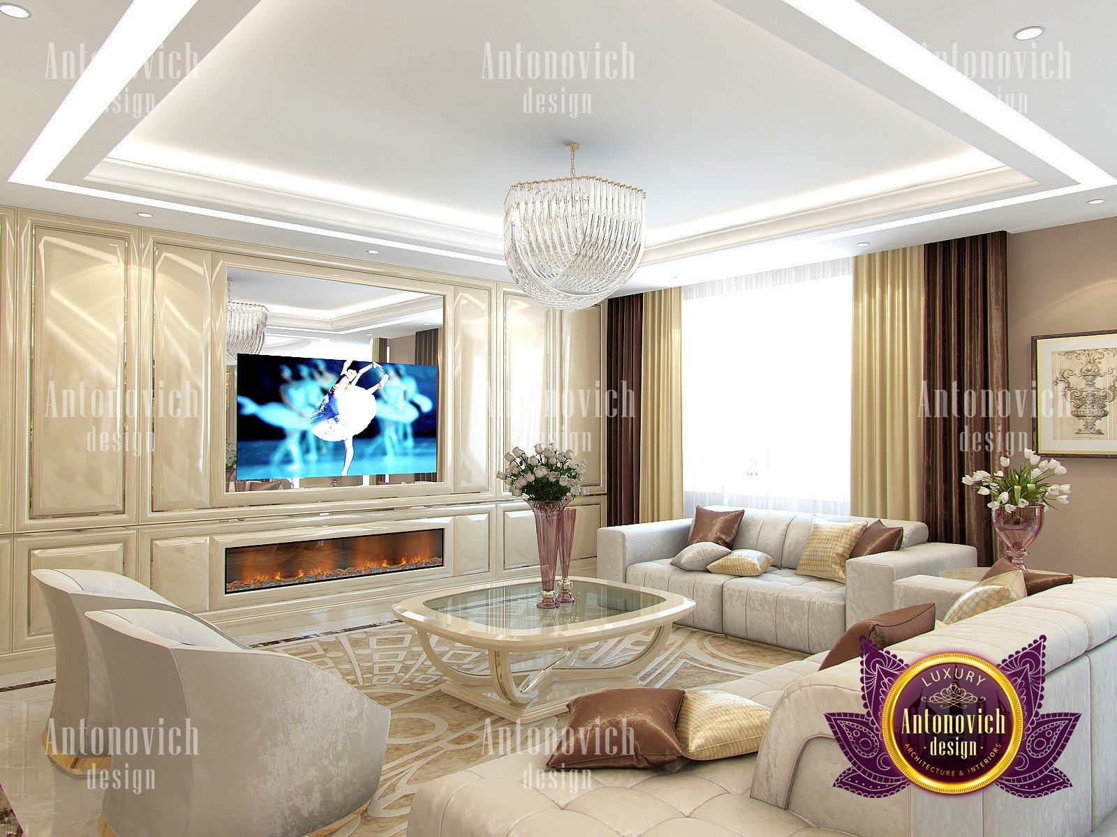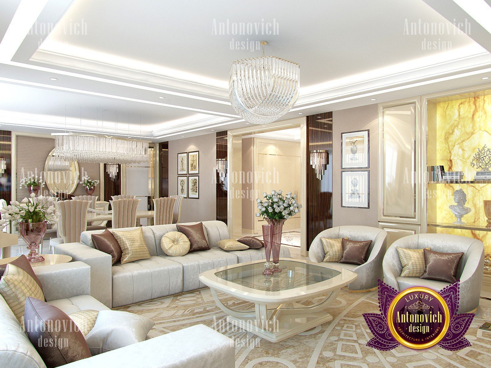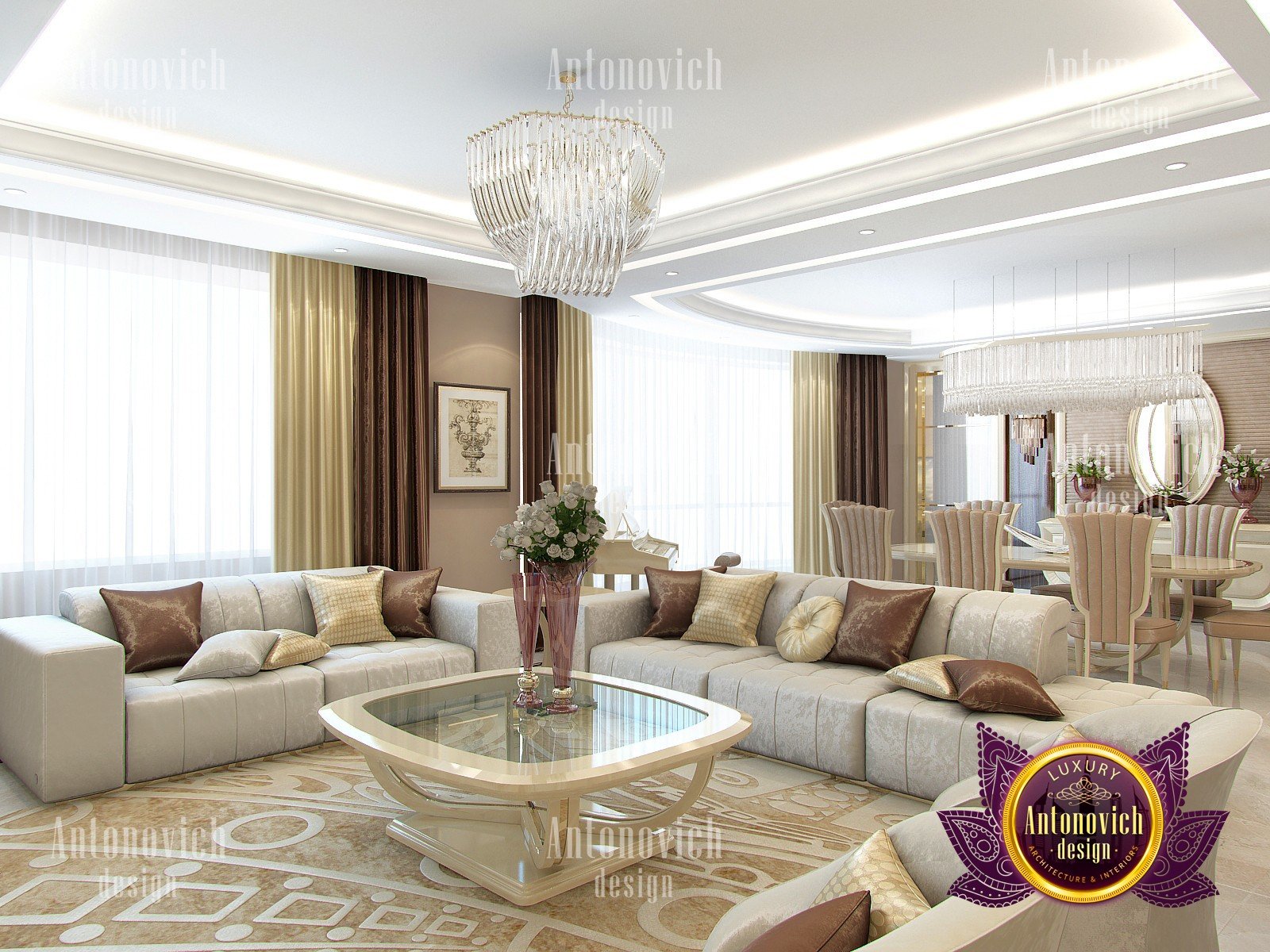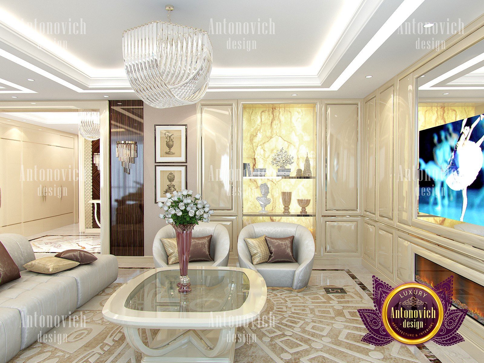 Дизайн дома в Абу-Даби сочетает восточный колорит и традиции классического стиля. Роскошный дизайн гостиной выражается в богатом декоре и изящных деталях. Интерьер гостиной в классическом стиле формирует единый образ холла и нескольких зон отдыха. В гостиной — мраморная лестница с кованым ограждением, это создаёт эффект гостиная с мраморной лестницей и впечатление гостиная с кованым ограждением. Интерьер гостиной с мрамором подчёркивает благородство материалов. Мраморные полы украшены причудливыми резными узорами нескольких оттенков мрамора. Витки резных узоров повторяются в декоре потолка. Потолки заполнены пышными завитками лепнины, покрытой сусальным золотом — это декор гостиной с позолотой, который подчёркивает торжественность интерьера. В этом сияющем пространстве мебель с резной отделкой и бархатная обивка рубинового цвета выглядит идеально. В оформлении стен полупилястры с капителями из лепнины выглядят изысканно. Такие решения создают богато украшенный интерьер гостиной. Буазери оформлено резным декором и дополнено шелковыми обоями с принтованными узорами, при этом шелковые обои в гостиной придают интерьеру благородство. Блеск и сияние роскошной гостиной усиливает хрустальная люстра в гостиной с множеством подвесов. Дизайн гостиной полон тонких деталей и стильных акцентов. Двери, ведущие в другие комнаты, инкрустированы резным декором и дополнены мягкими обивочными элементами. Центральную часть интерьера занимает портал с высокими потолками, тянущимися на всю высоту дома. В этой части расположен мраморный фонтан в гостиной с мягкой голубой подсветкой. Дизайн виллы в Абу-Даби воплощает дворцовую современную роскошь, где восточный колорит и классические мотивы переплетены с возможностями современных технологий.