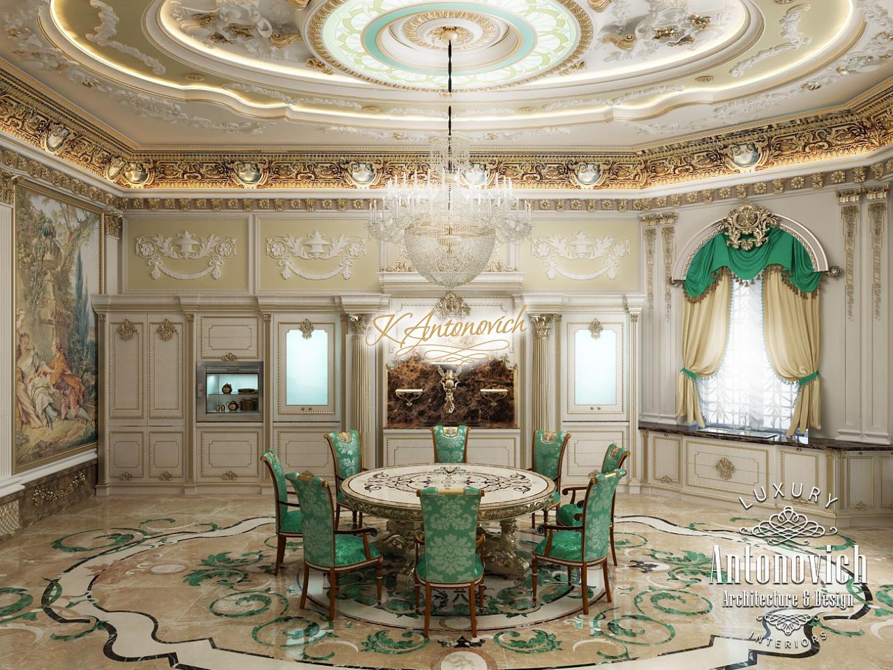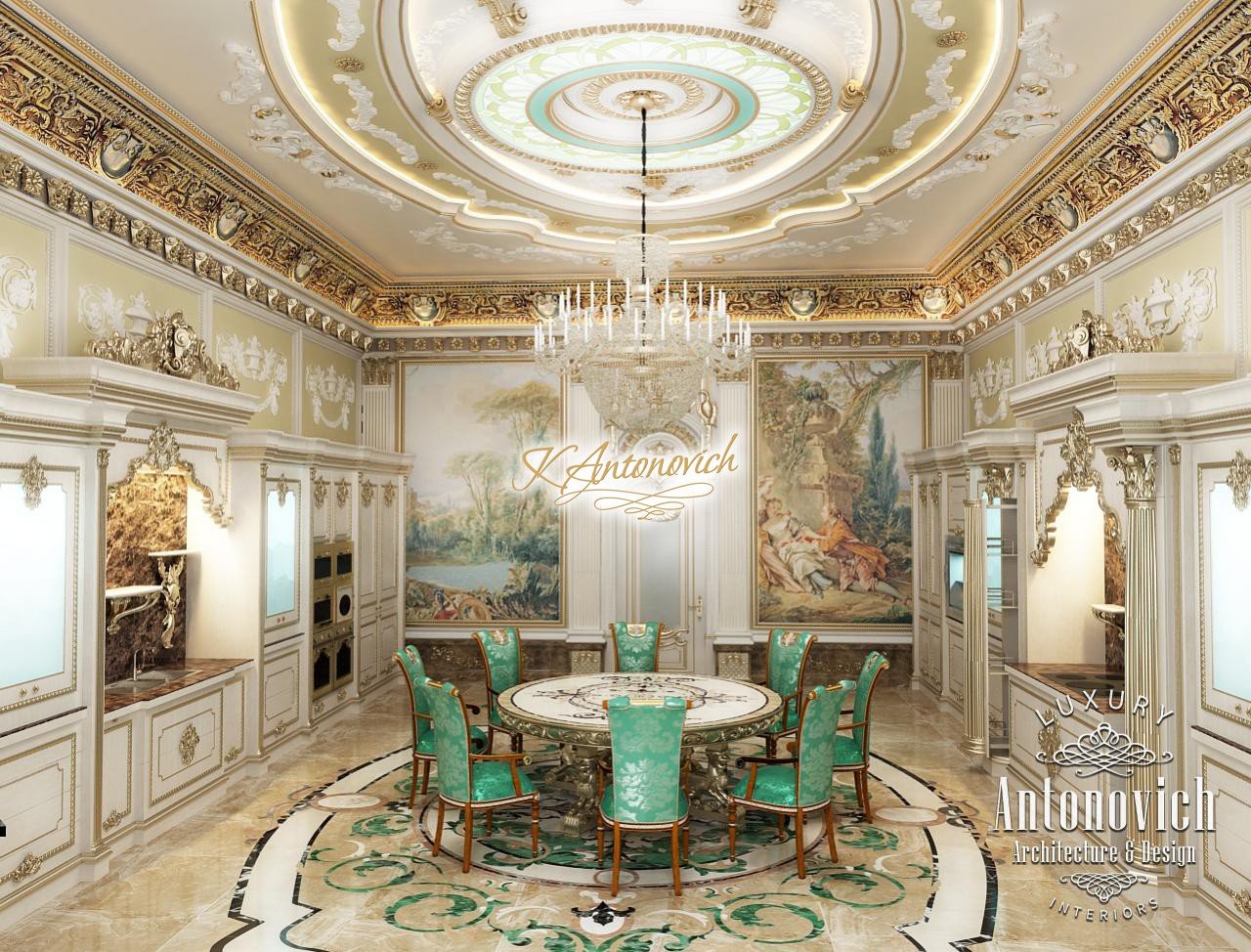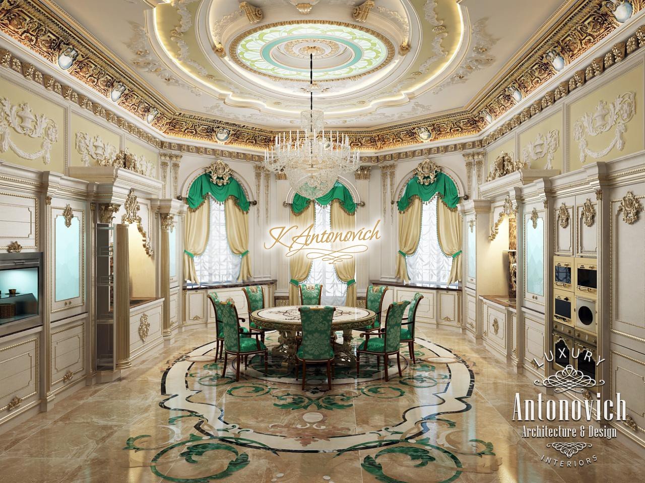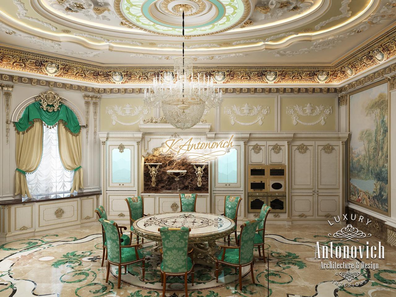На пике популярности сегодня — роскошь и блеск. Благородная классика в работах дизайн‑студии в Дубае приобретает особый глянец благодаря уникальным авторским дизайнерским решениям и умению применять новые технологии для создания таких выразительных образов. Этот кухонный интерьер оформлен в одной из роскошных вилл в Абу-Даби. Интерьер в Абу-Даби от Антонович Дизайн (Antonovich Design) — идеальная возможность получить роскошный, уникальный и комфортный интерьер. Архитектурный проект предполагает большое пространство с высокими окнами для кухонного интерьера, а дизайн кухни в Дубае впечатляет масштабом и размахом. Дизайнеры визуально разделили квартиру на две зоны с помощью зеркального эффекта, причём зеркальный эффект в интерьере кухни усиливает глубину пространства. Роскошная мебель с резной отделкой и ультрасовременные системы хранения задают основное настроение помещения: здесь заметен роскошный дизайн кухни и кухня с резной мебелью выступает центром образа. В центре кухонного интерьера расположена столовая зона, оформленная высокими стульями, и именно столовая зона с высокими стульями задаёт гостевой характер пространства. Дизайн кухни заполнен роскошной фурнитурой; стена напротив окна украшена художественными картинами, то есть это и кухня с художественными картинами на стене. Окна задрапированы классическими благородными шелковыми шторами двух насыщенных оттенков, поэтому присутствует и кухня с классическими шелковыми шторами. Высокий потолок выделен волной лепного декора с позолотой, что подчёркивает кухню с потолком из лепнины. Поразительной красоты благородный мраморный пол украшен фантазийными узорами, высеченными в мраморе ярких тонов: это наглядная демонстрация кухня с мраморным полом. Резюме проекта — гармония глянца, материалов и архитектуры, где интерьер кухни в Абу-Даби остаётся в фокусе внимания.