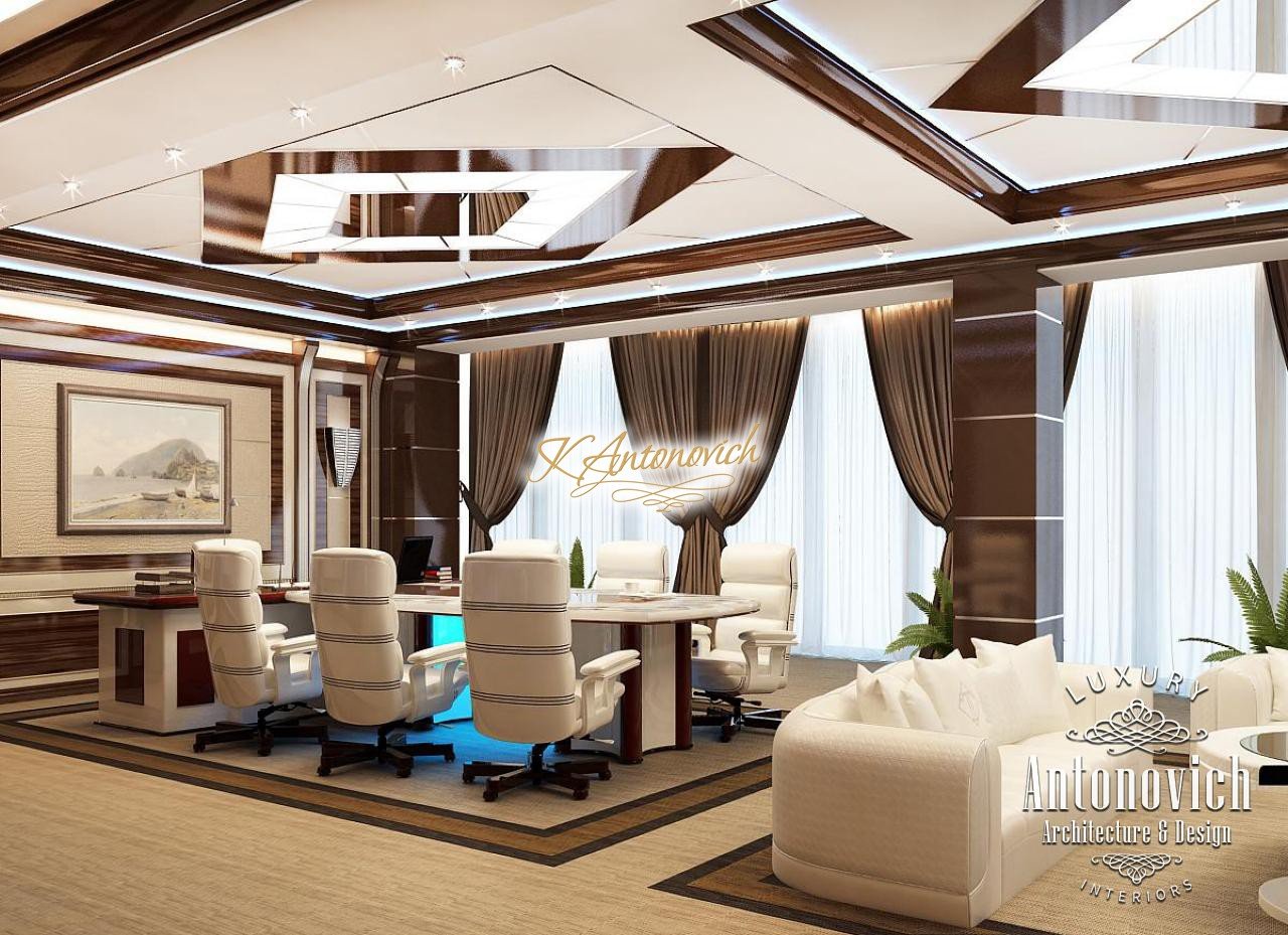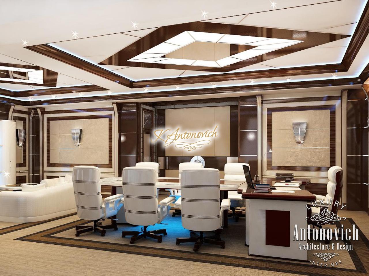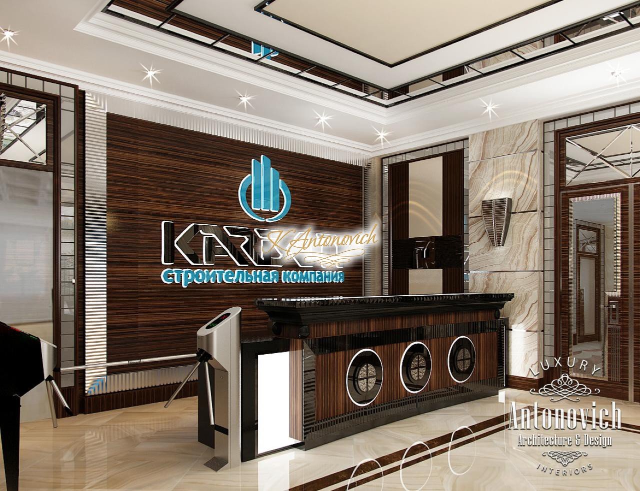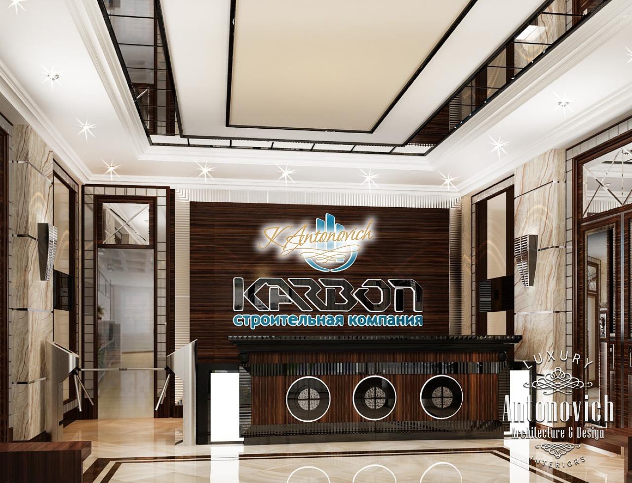 Для офиса крупной строительной компании в Дубае дизайнеры элитной студии «Антонович Дизайн (Antonovich Design)» предложили современный стиль. Этот дизайн офиса в Дубае подчёркивает успех компании, её статус и стремление предлагать клиентам лучшее, что есть сегодня. Мы реализовали современный дизайн офиса для строительной компании, который точно выражает назначение помещений. Наш дизайн общественных пространств Дубая от нашей студии идеально отражает миссию помещений: всё продумано для эффективной работы и комфортной, уютной атмосферы. Представленный интерьер офиса премиум класса отличается динамикой и подчёркивает рост успешной дубайской строительной компании. Образ интерьера остаётся элегантным с оттенком респектабельности. При входе вас встречает изысканный ресепшн — оформление ресепшн с лаконичной отделкой, декорированный лакированной древесиной ценных пород. В авторском офисном проекте дизайнеры активно использовали интерьер с деревянной облицовкой стен, что подчёркивает статус и создаёт тёплую атмосферу; пол из светлого натурального мрамора и геометрический узор из темного камня повторяют мотивы декора потолка. Интерьер полон гармонии и элегантности: элитная студия предлагает уникальные решения, придающие интерьеру эксклюзивность. Лаконичную образность дополняют зеркальные панели для визуального расширения пространства. В декоре потолка дизайнеры применили современные методы освещения — подсветка потолка светодиодными светильниками и потолочные светильники.