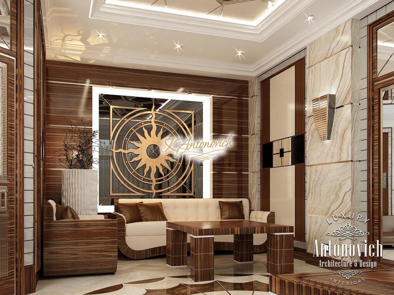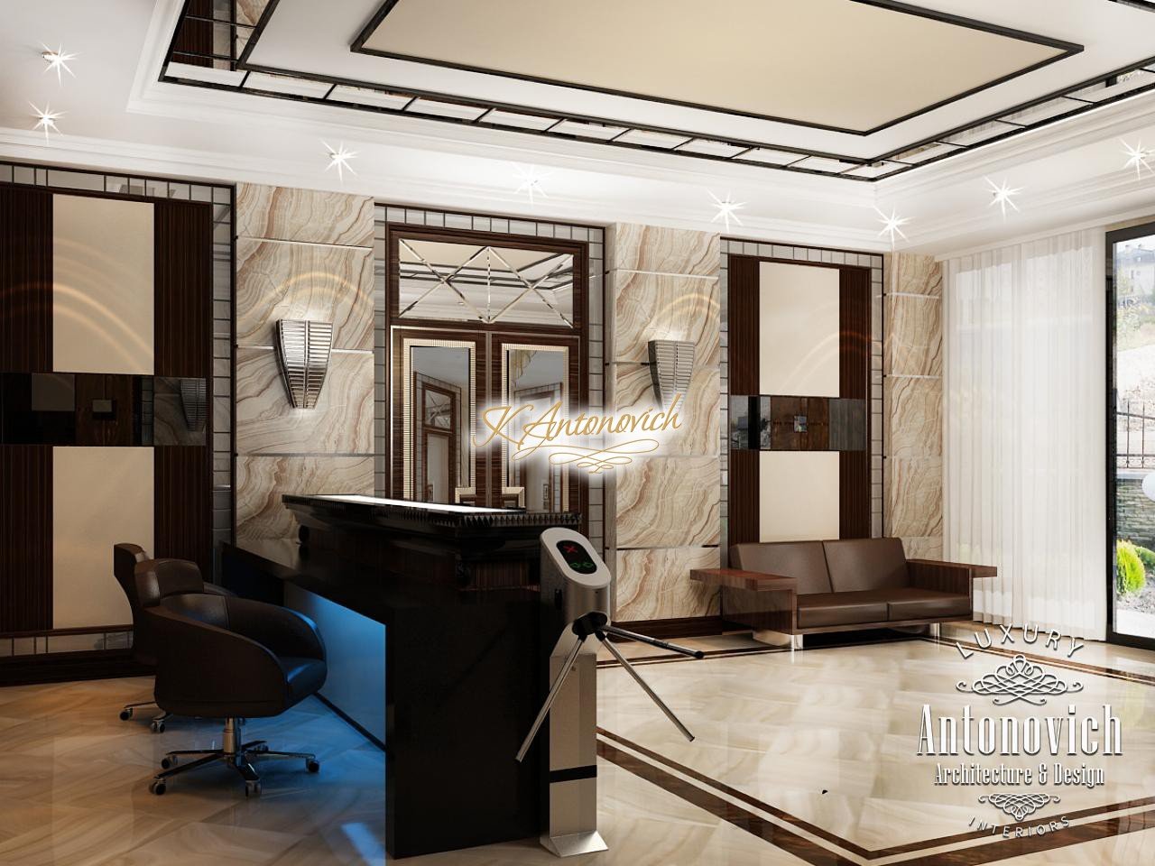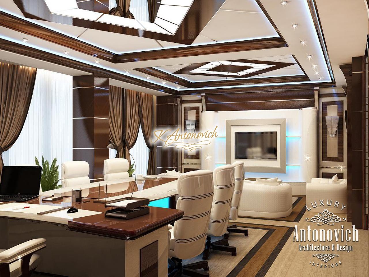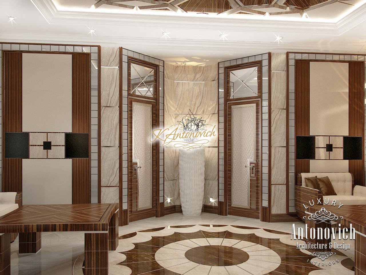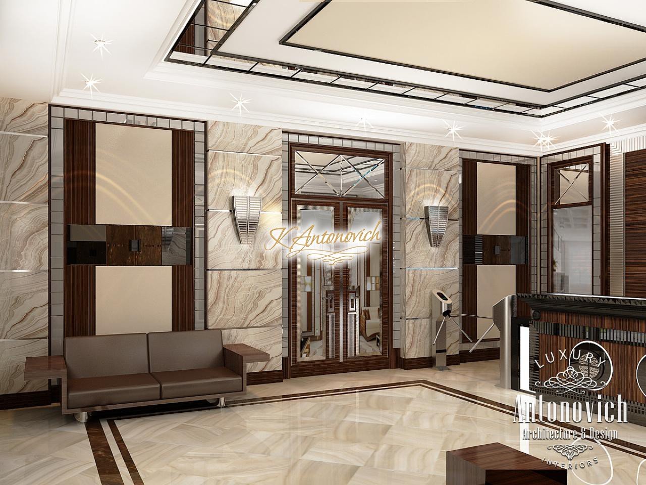 Для офиса крупной строительной компании в Дубае дизайнеры элитной студии «Антонович Дизайн (Antonovich Design)» предложили современный стиль. Этот дизайн офиса в Дубае подчёркивает успех компании, её статус и стремление предлагать клиентам лучшее, что есть сегодня. Мы реализовали современный дизайн офиса для строительной компании, который точно выражает назначение помещений. Наш дизайн общественных пространств Дубая от нашей студии идеально отражает миссию помещений: всё продумано для эффективной работы и комфортной, уютной атмосферы. Представленный интерьер офиса премиум класса отличается динамикой и подчёркивает рост успешной дубайской строительной компании. Образ интерьера остаётся элегантным с оттенком респектабельности. При входе вас встречает изысканный ресепшн — оформление ресепшн с лаконичной отделкой, декорированный лакированной древесиной ценных пород. В авторском офисном проекте дизайнеры активно использовали интерьер с деревянной облицовкой стен, что подчёркивает статус и создаёт тёплую атмосферу; пол из светлого натурального мрамора и геометрический узор из темного камня повторяют мотивы декора потолка. Интерьер полон гармонии и элегантности: элитная студия предлагает уникальные решения, придающие интерьеру эксклюзивность. Лаконичную образность дополняют зеркальные панели для визуального расширения пространства. В декоре потолка дизайнеры применили современные методы освещения — подсветка потолка светодиодными светильниками и потолочные светильники.