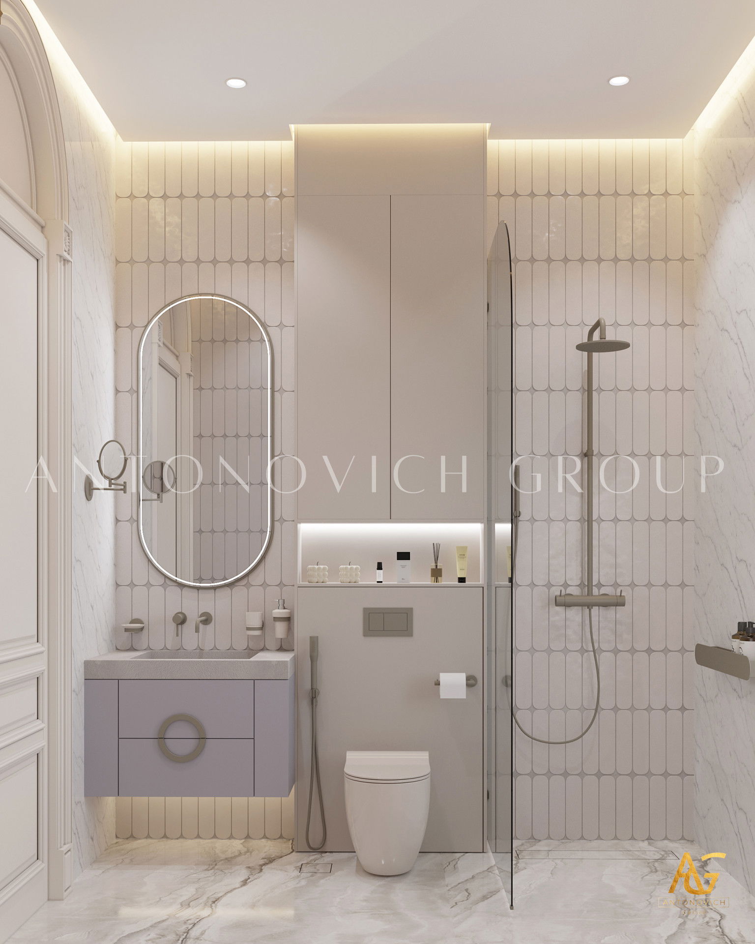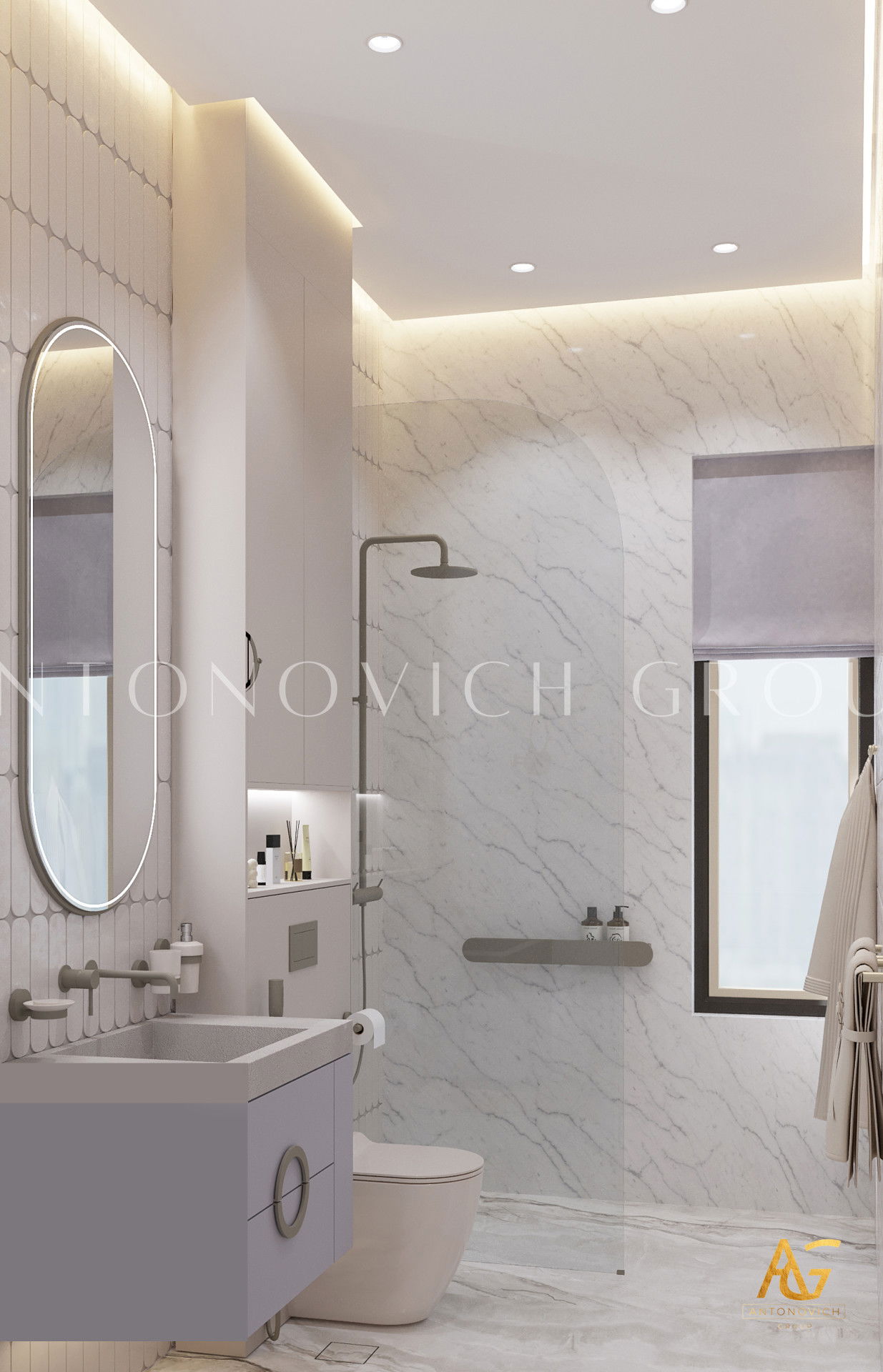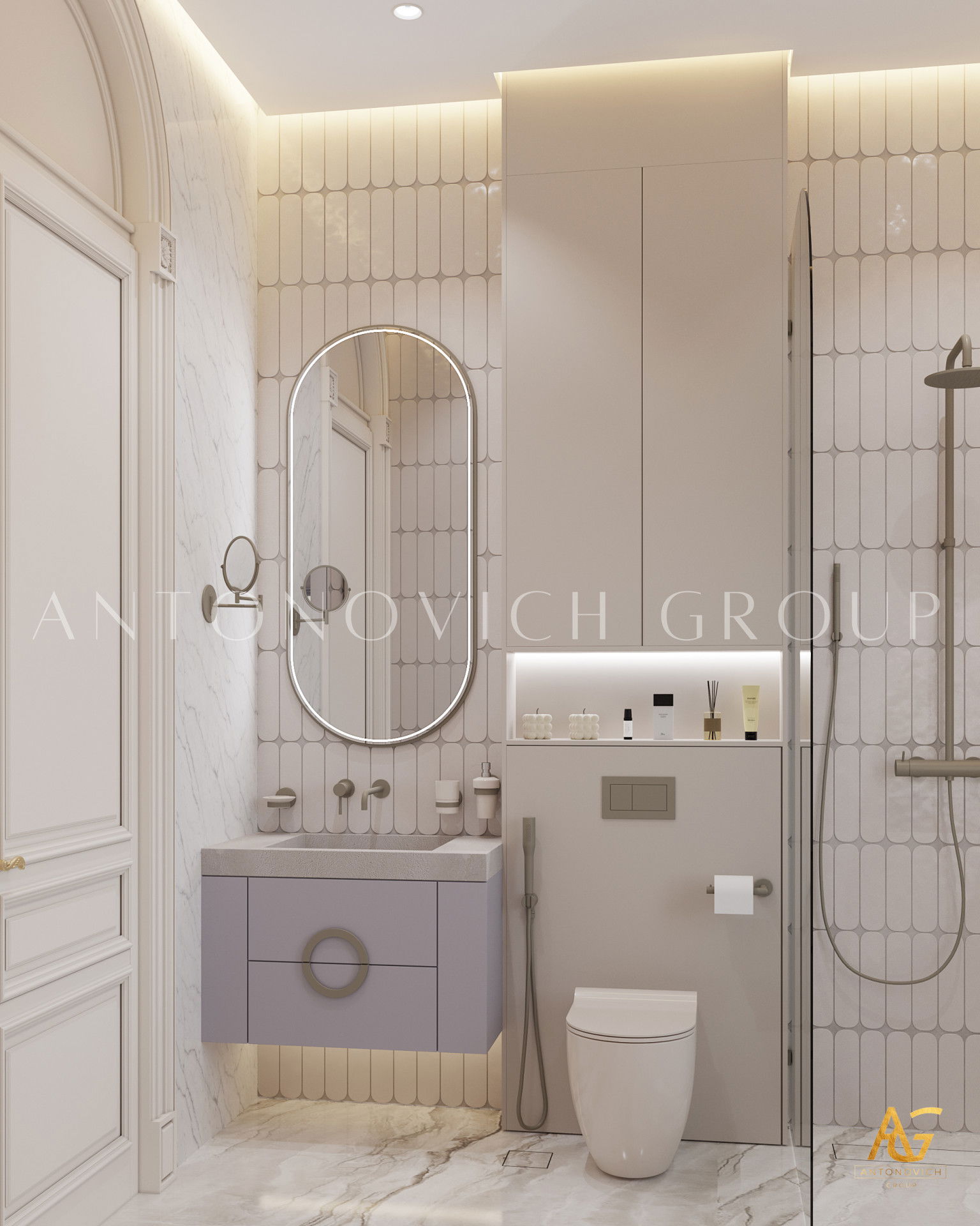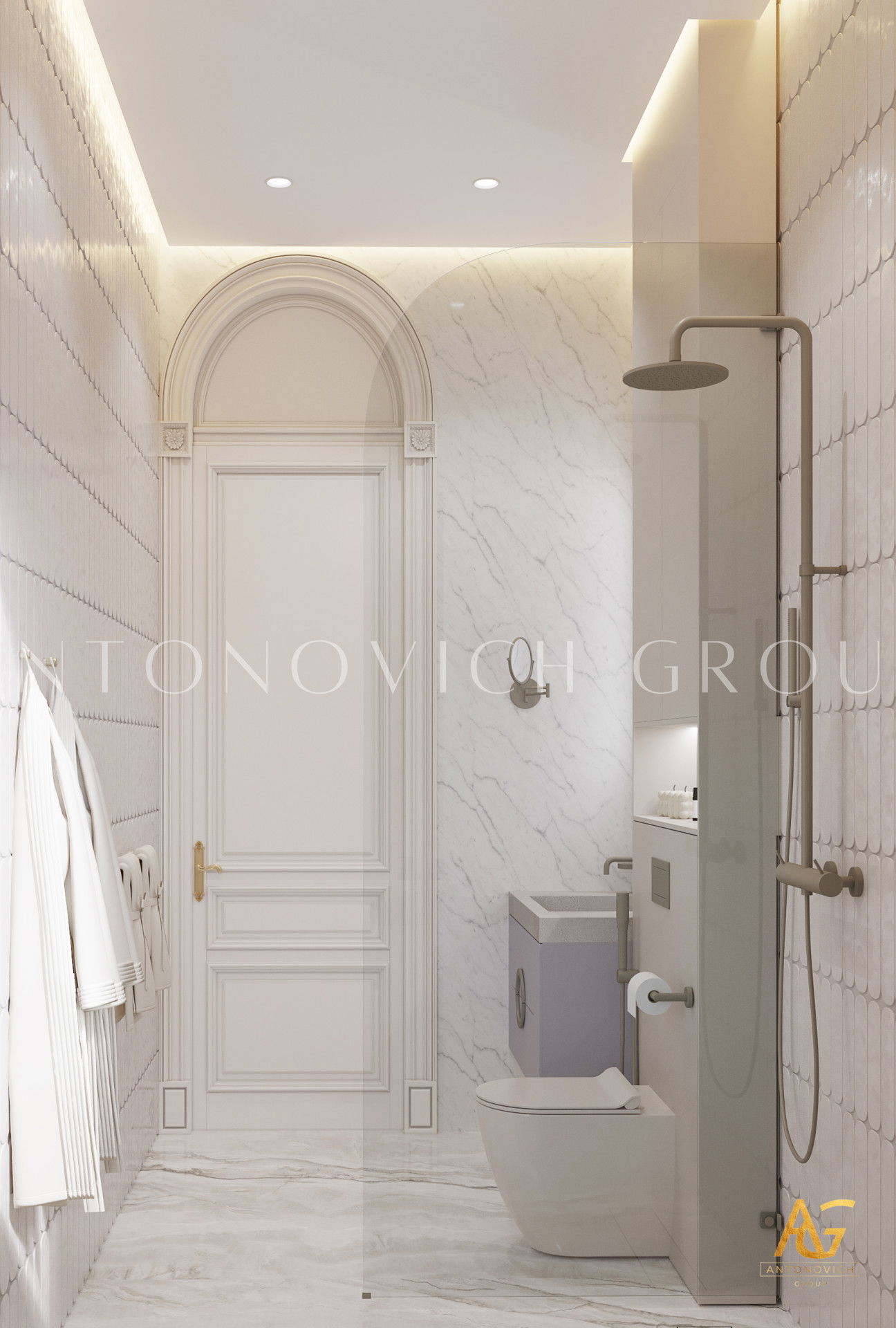 Роскошный интерьер ванной комнаты обусловлен особенностями архитектурной планировки квартиры в Дубае и эффективными решениями студии Антонович Дизайн. Этот роскошный интерьер ванной комнаты подчёркивают панорамные окна в ванной комнате. Большая круглая ванна — ванна на подиуме у окон, размещена у панорамных витражей. Ванная украшена мозаичной плиткой кремового оттенка, подсветка подчеркивает перламутровый блеск плитки. В декоре окон использованы роскошные шторы: штора из полупрозрачного шелка кремового оттенка. Потолок формирует идеальную геометрию пространства — потолок с декоративным медальоном, висит классическая люстра над ванной. Потолочная лепнина с позолотой подчёркивает элегантный дизайн современной классики. Душевая с золотой отделкой ограничена прозрачным стеклом с обкладкой из позолоченного металла. Студия из Дубая предложила вариант дизайна. Показан дизайн ванной комнаты в Дубае.