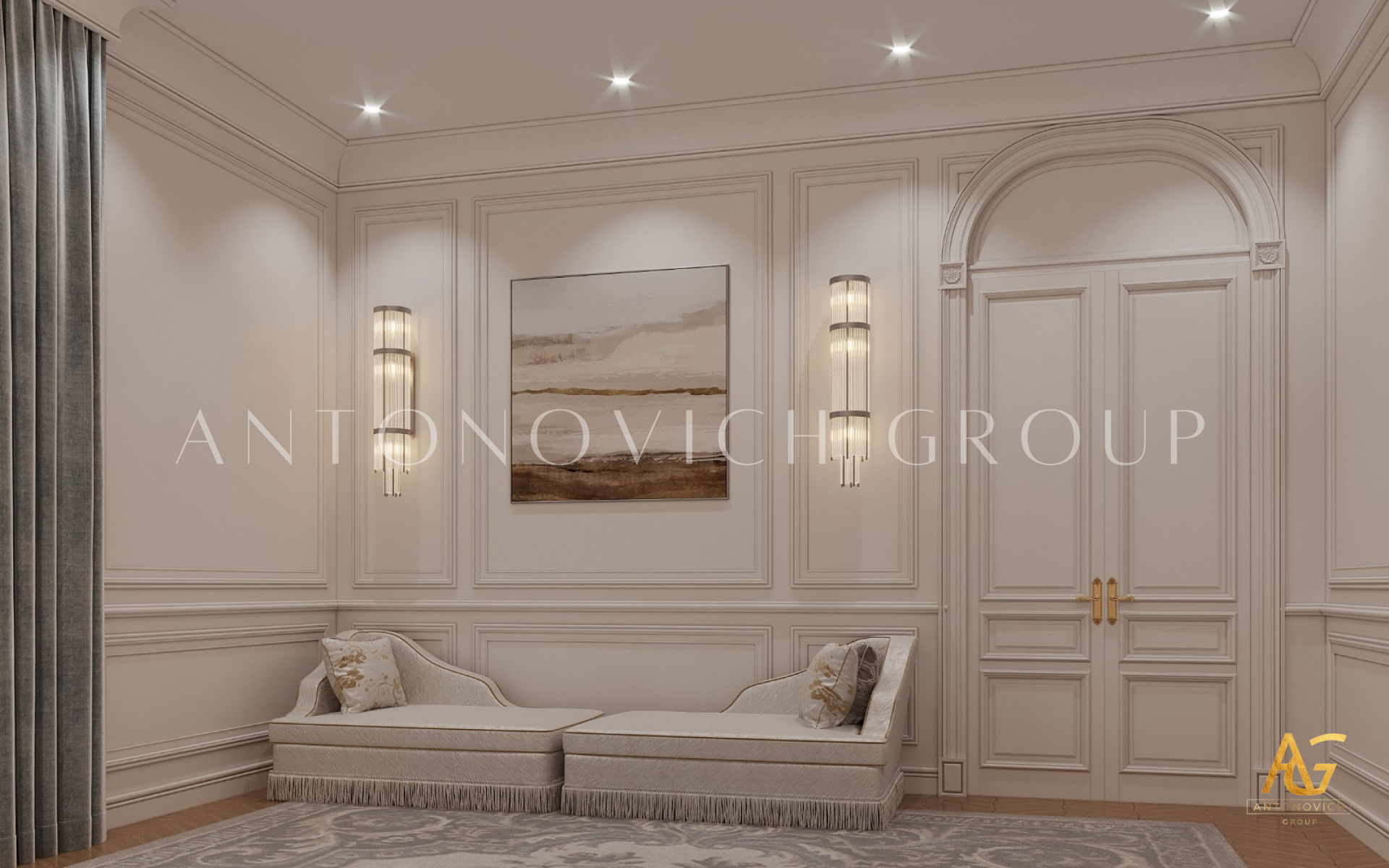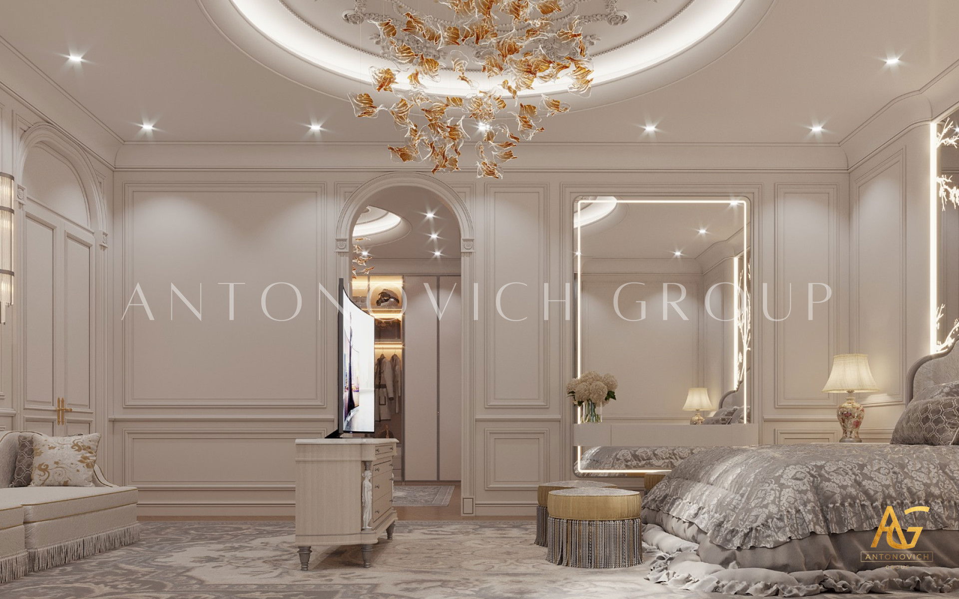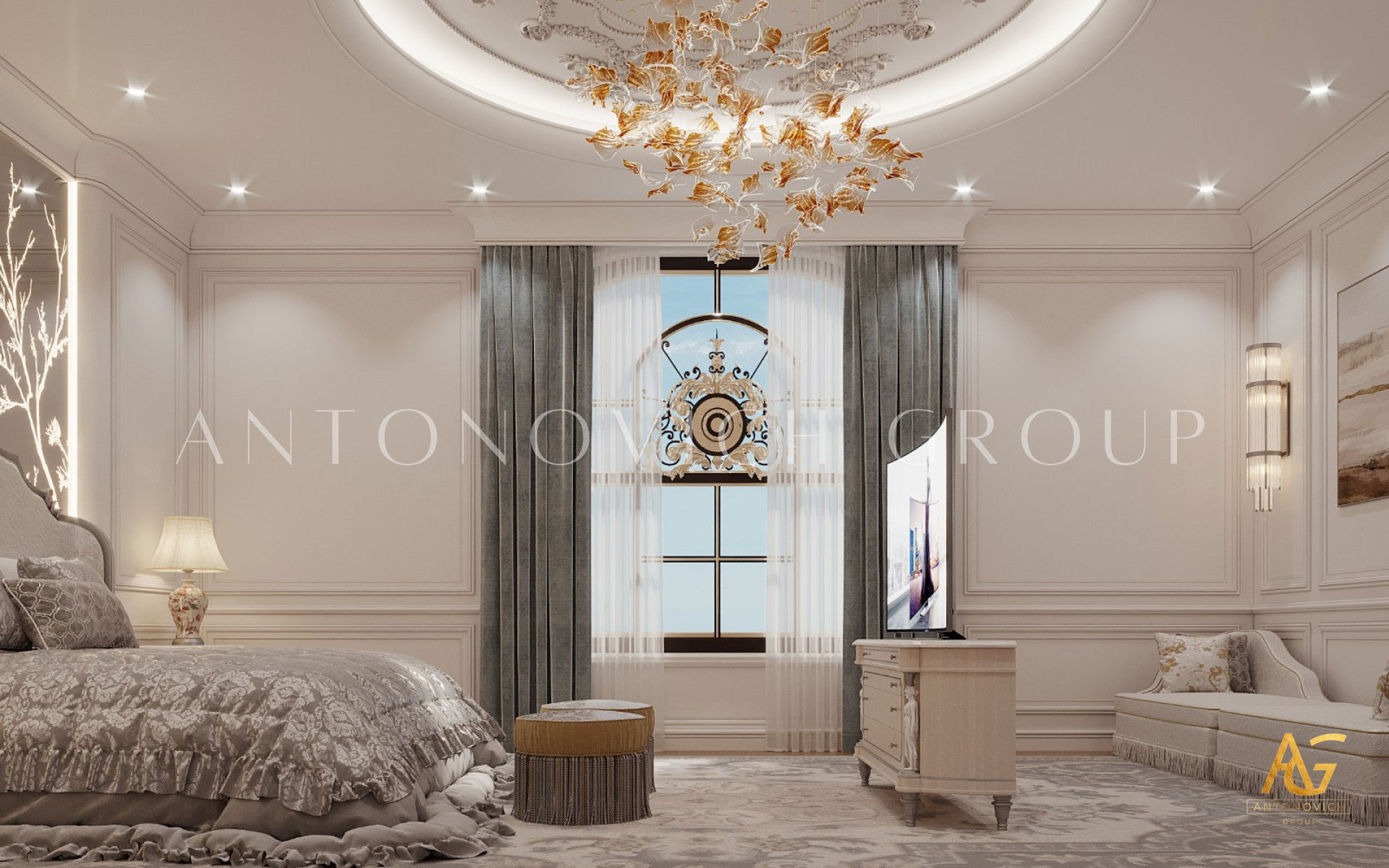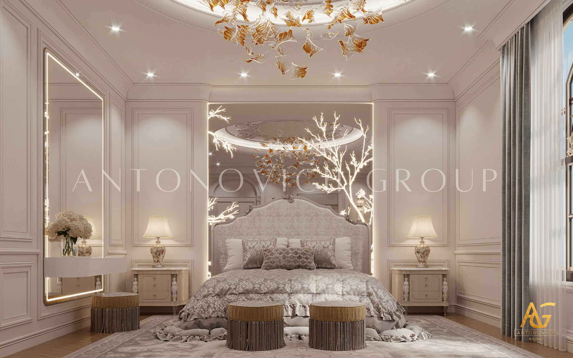 Другой цвет, применённый для создания роскошной атмосферы, — золото. Отдельные детали выполнены в золотом, и интерьер получает по-настоящему выразительную ауру, усиленную талантом Антонович Дизайн (Antonovich Design). Каждый элемент в этой большой роскошной спальне показывает свою роль в передаче роскоши. Детали заметны, и красивая комната обеспечивает комфортный сон каждую ночь. Это пример бирюзово-золотой интерьер спальни. В проекте подчёркнута цветовая палитра бирюзовый и золото. Мягкий текстиль для роскошной спальни гармонирует с декоративными элементами. Здесь подобрана мебель и детали для роскошной спальни, которые подчёркивают стиль и статус. Все элементы вместе создают атмосферу уюта и роскоши в спальне. Видна координация цветов в спальне класса люкс.