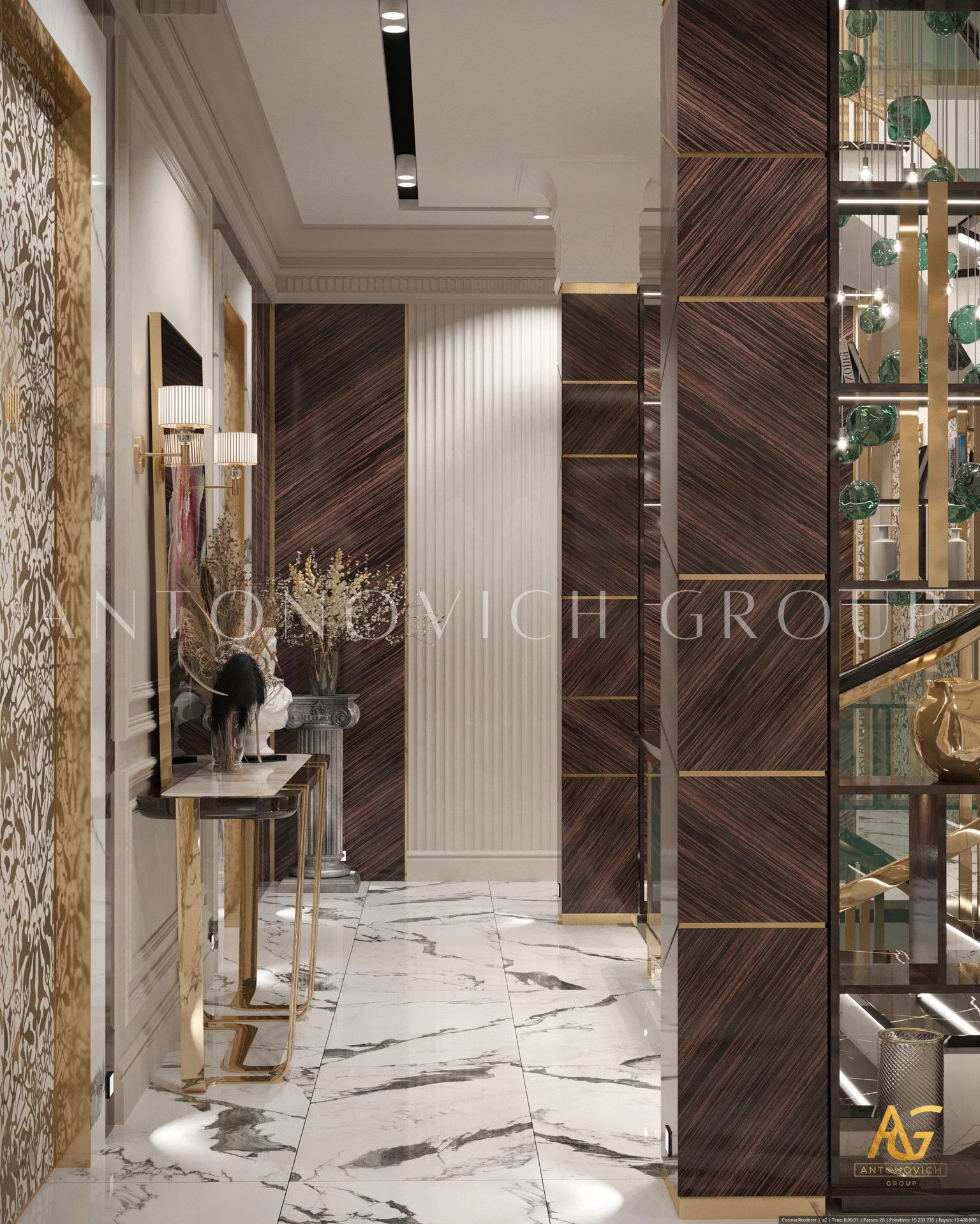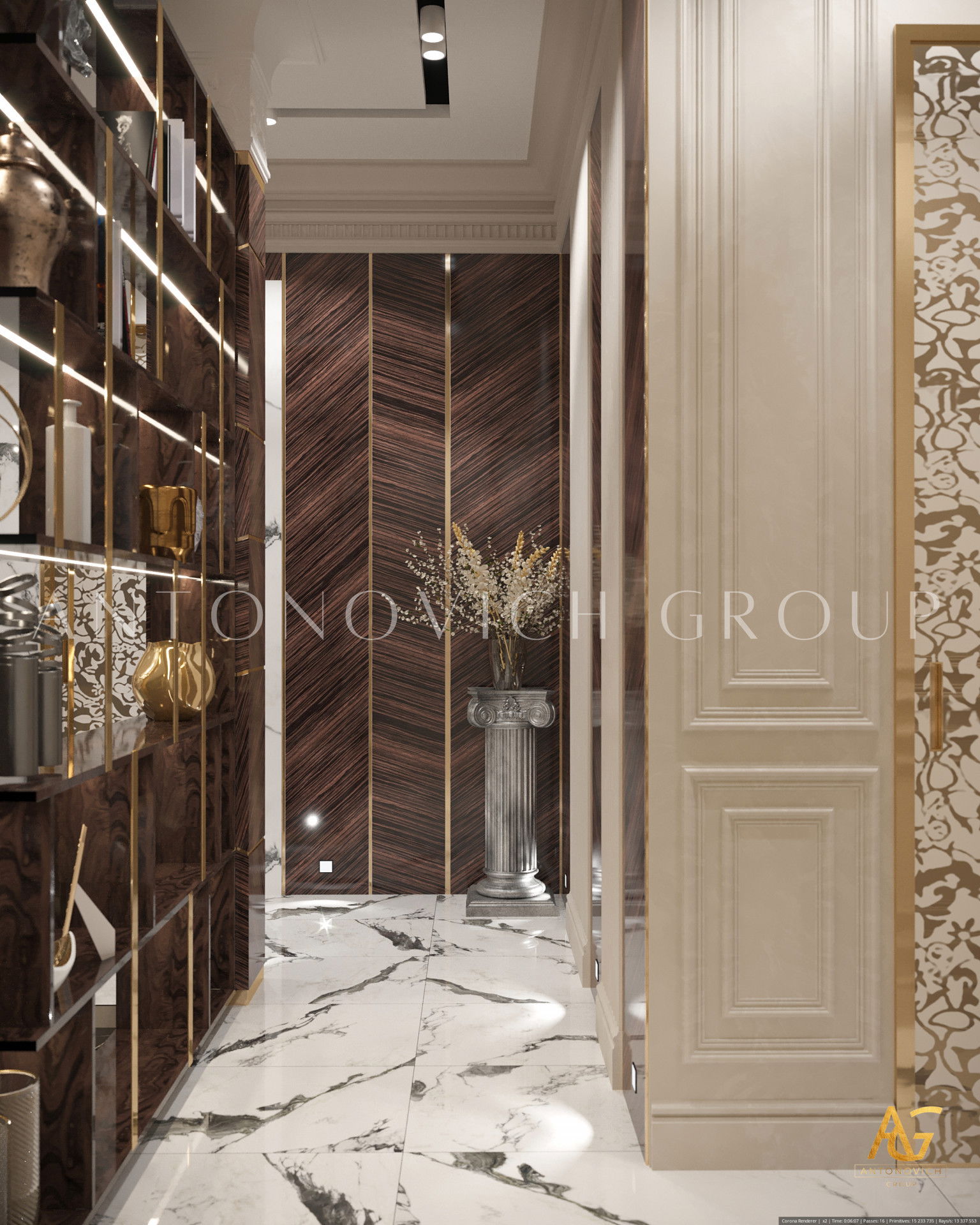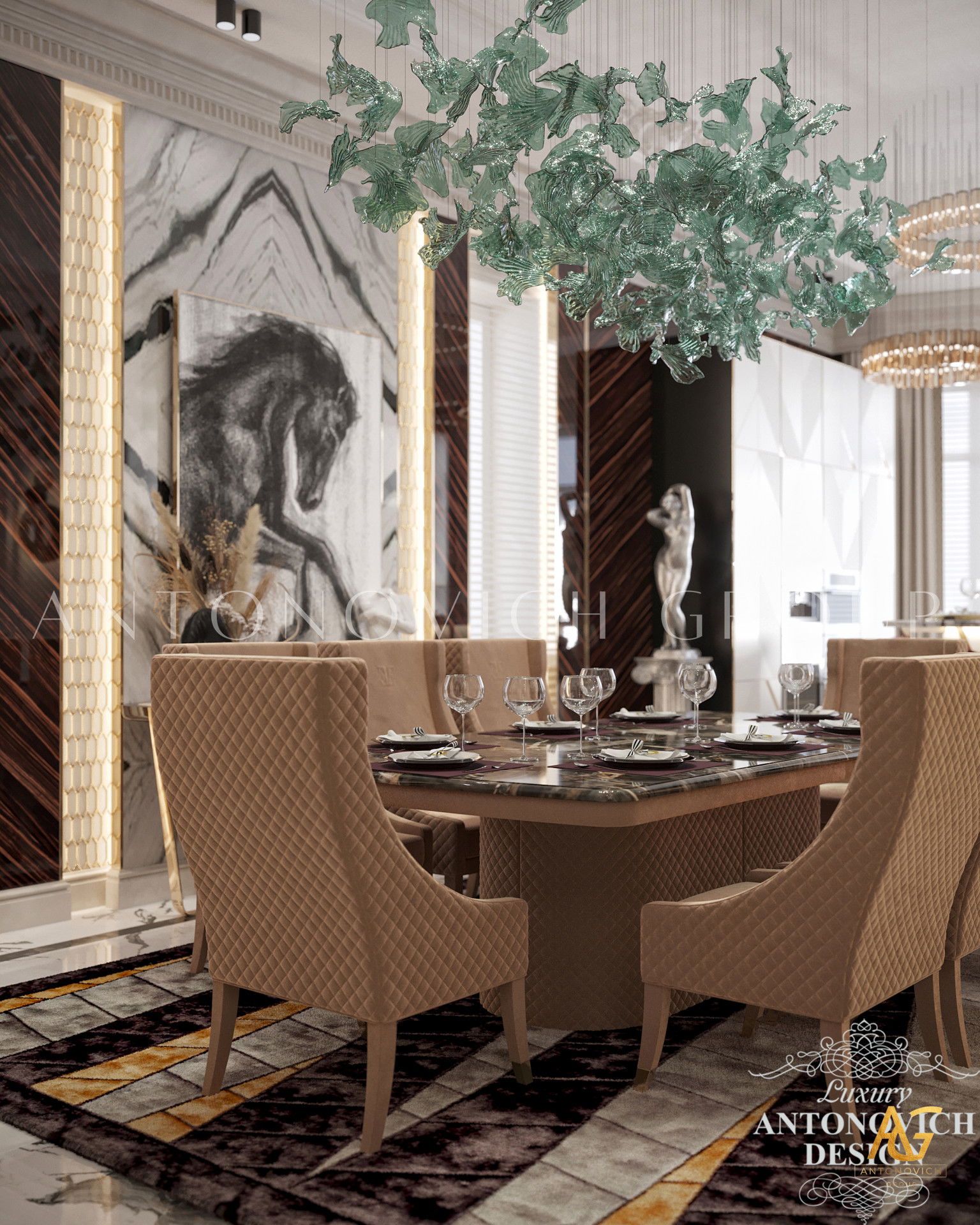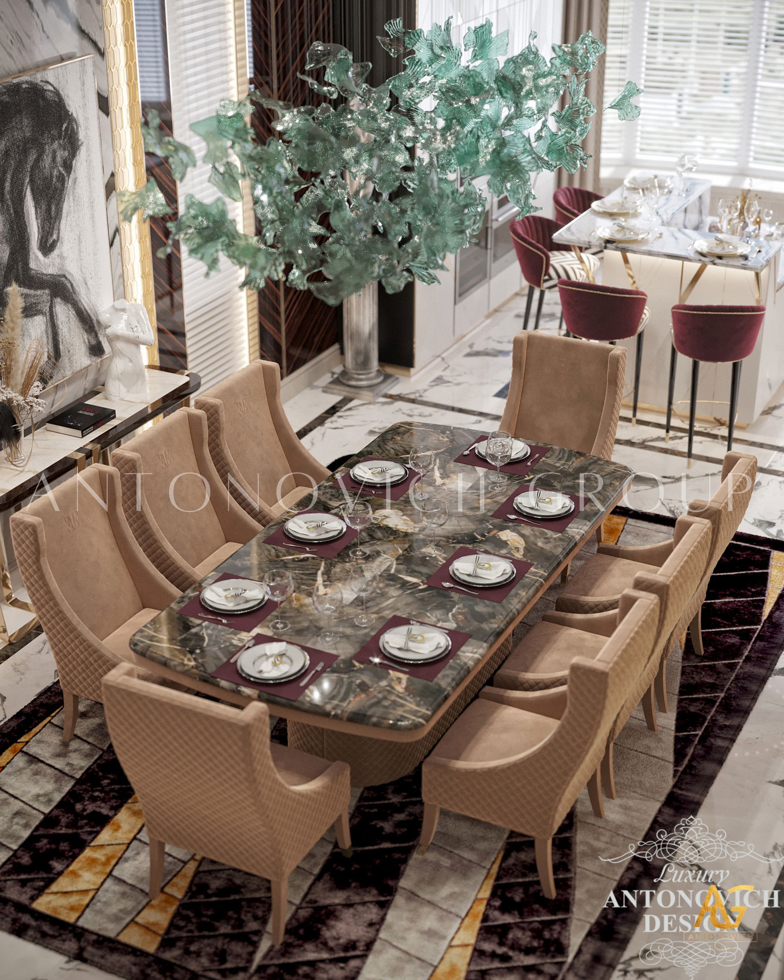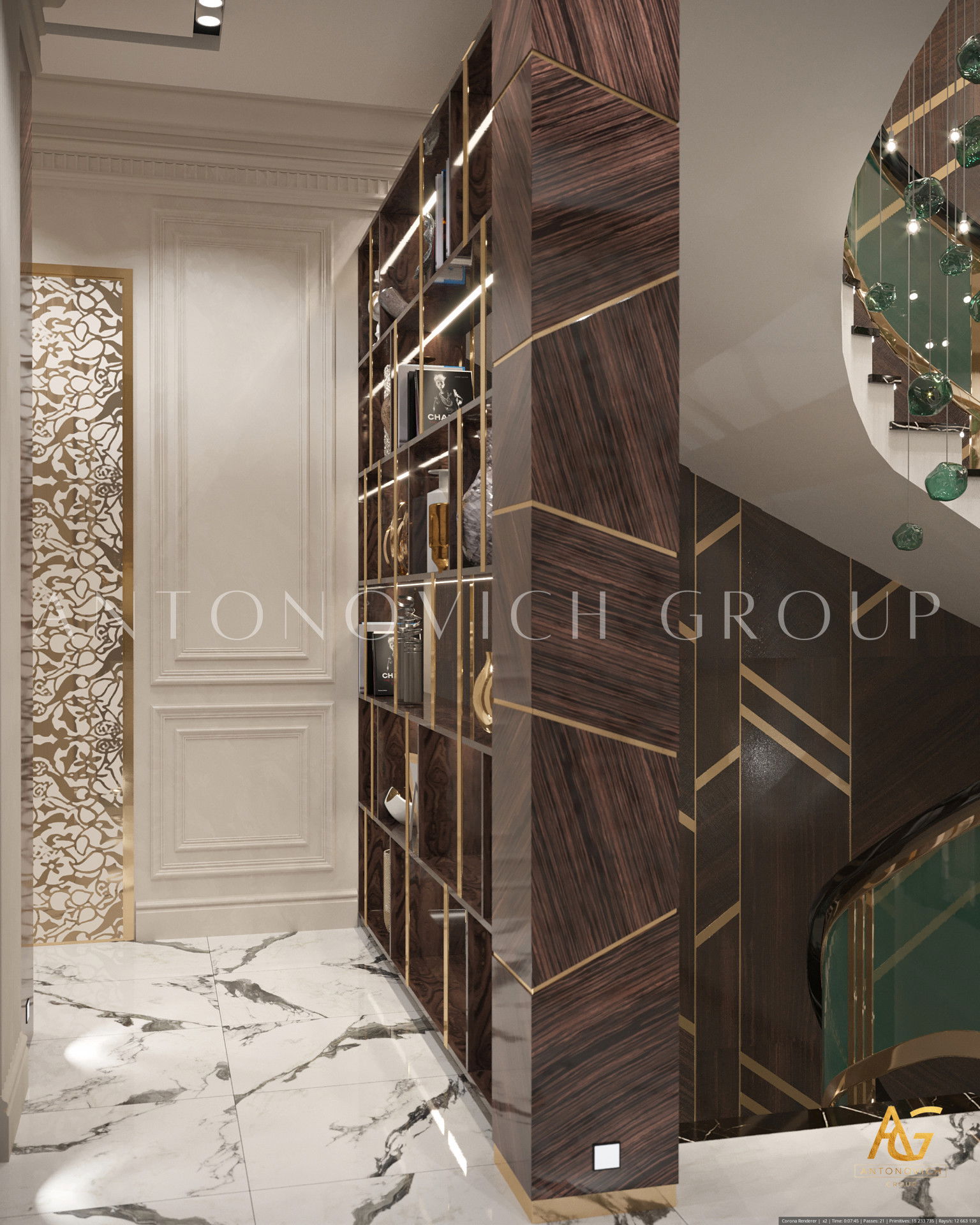 Комнаты подчеркивают тропические мотивы и мягкую палитру, создавая дружелюбную атмосферу: от зелёных растений с яркими акцентами до лаконичных деталей с выразительными узорами. Это пример тропического интерьера виллы. Антонович Дизайн (Antonovich Design) выбрал сочетание коричневого с тропическими акцентами, чтобы сохранить современность и теплоту. С этими тропическими деталями, придающими помещению ощущение уюта, Антонович Дизайн преобразовал дизайн интерьера виллы в выразительные композиции. Для создания приятной внешности и атмосферы команда тщательно отбирала мебель и декоративные материалы для интерьера.