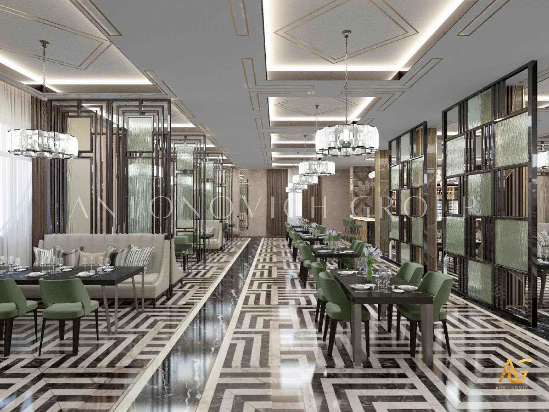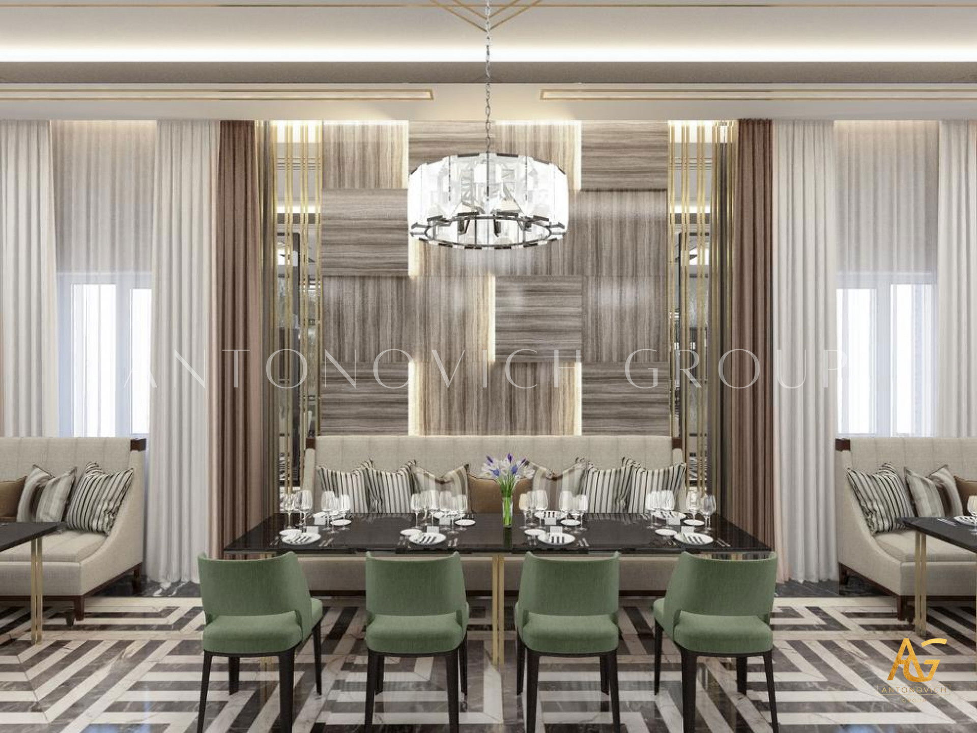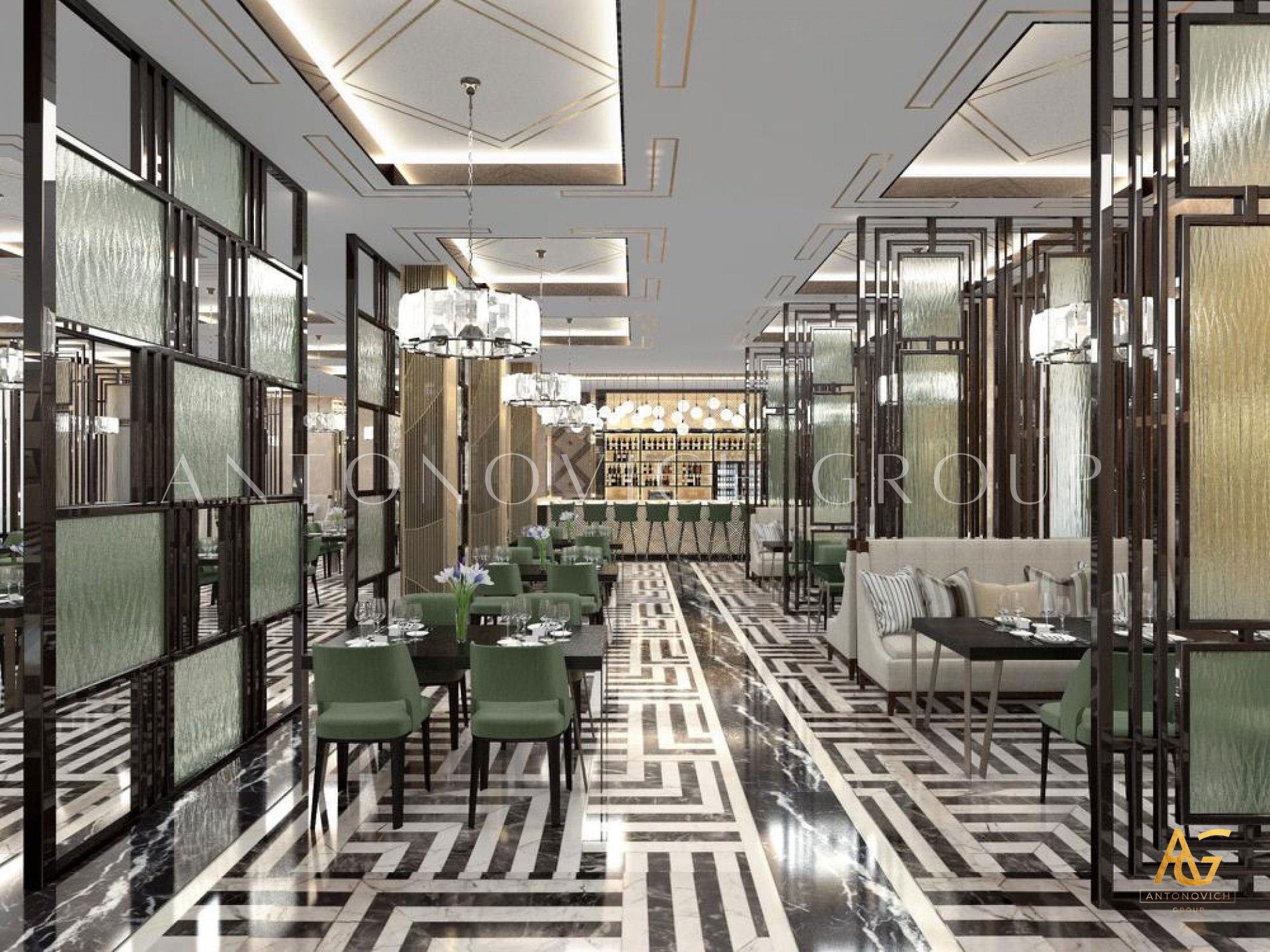 Зелёный давно стал популярным выбором для современного ресторанного интерьера в Дубае. Он привносит природную и в то же время роскошную атмосферу. Антонович Дизайн (Antonovich Design) создал тёплую атмосферу в этом современном выдающемся проекте. Ваши гости оценят роскошный дизайн ресторана в Дубае, потому что он наполнен множеством изысканных деталей. Дизайн, начиная с люстры, поражает. Особо выделяются круговые элементы в интерьере ресторана, аккуратно выполненные, а блеск создаёт необычную атмосферу. Стена за креслами тоже великолепна: массивная, с красивыми квадратными акцентами плитки, которые также работают как окно. Узор повторяется от пола до потолка. Этот роскошный дизайн интерьера ресторана в Дубае очарователен и выразителен. Интерьер уникален. Мы уверены, что ваши гости никогда не заскучают в этом оживлённом ресторане — он остаётся для них местом отдыха и умиротворения. В проект включён творческий дизайн стен: рамки и орнаменты подчёркивают приятную атмосферу пространства. В проекте ресторанный интерьер с зелёной гаммой использует зелёные акценты в декоре, добавляя драматичности и изящества. Кто не влюбится в этот прекрасный ресторан? Дизайн интерьера ресторана в Дубае источает престиж. Люстра выполнена в единственном экземпляре. Множество круговых дизайнов выполнены филигранно — такая деталь редко встречается в других проектах. Детали включают оформление стен ресторана плиткой, которое придаёт драму и красоту. Стены продуманы с точки зрения элегантности и изящества.
