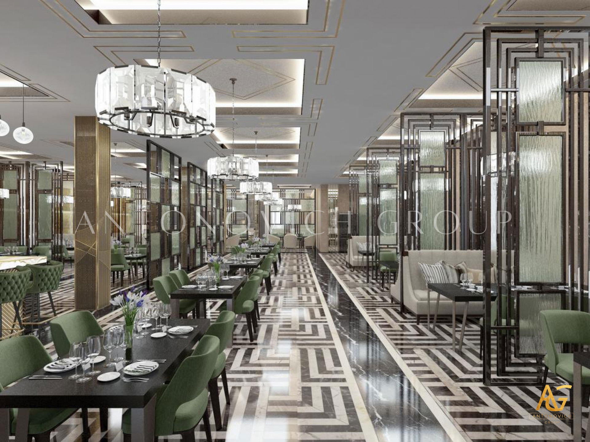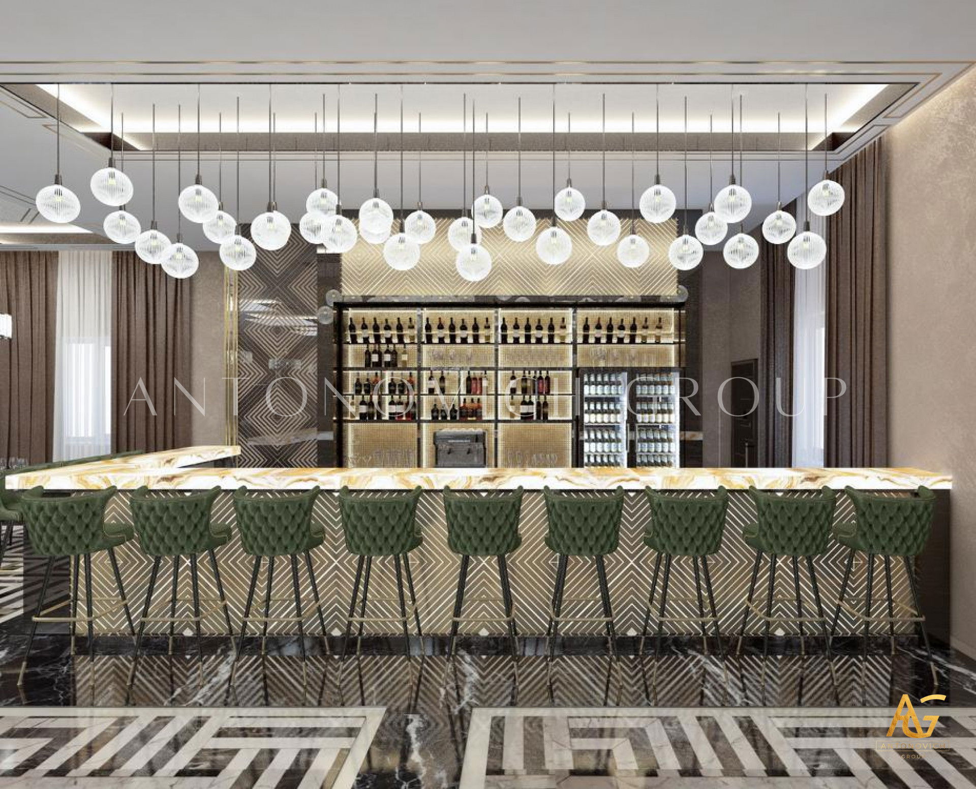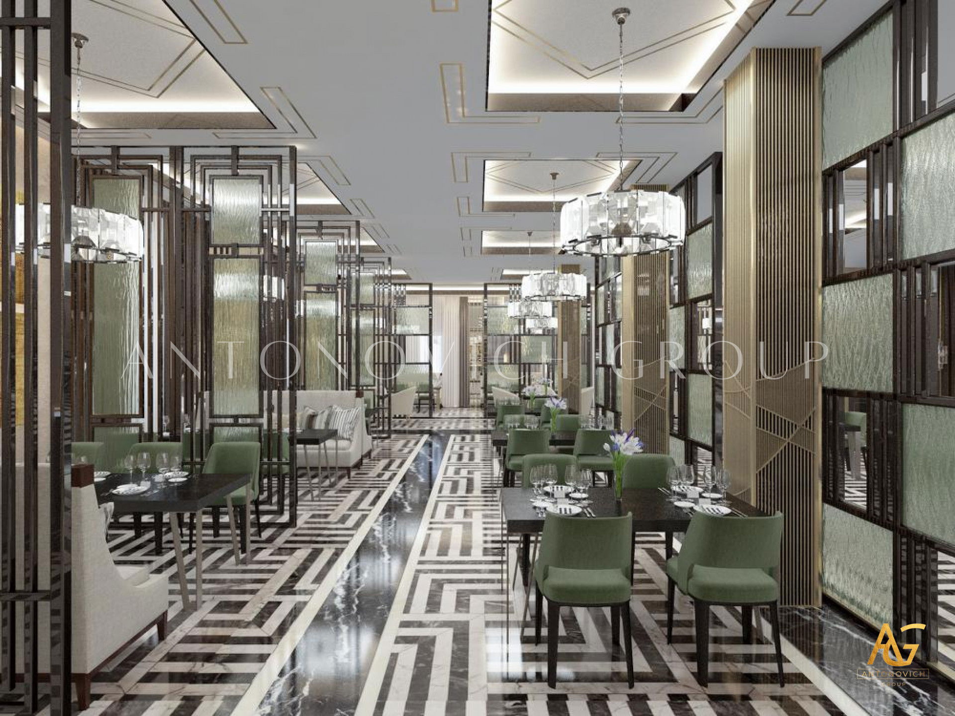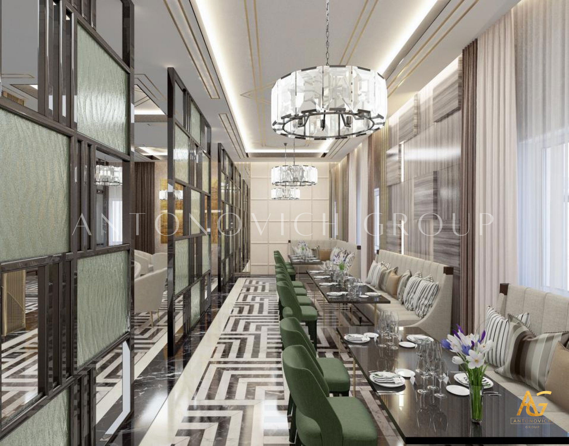Зелёный давно стал популярным выбором для современного ресторанного интерьера в Дубае. Он привносит природную и в то же время роскошную атмосферу. Антонович Дизайн (Antonovich Design) создал тёплую атмосферу в этом современном выдающемся проекте. Ваши гости оценят роскошный дизайн ресторана в Дубае, потому что он наполнен множеством изысканных деталей. Дизайн, начиная с люстры, поражает. Особо выделяются круговые элементы в интерьере ресторана, аккуратно выполненные, а блеск создаёт необычную атмосферу. Стена за креслами тоже великолепна: массивная, с красивыми квадратными акцентами плитки, которые также работают как окно. Узор повторяется от пола до потолка. Этот роскошный дизайн интерьера ресторана в Дубае очарователен и выразителен. Интерьер уникален. Мы уверены, что ваши гости никогда не заскучают в этом оживлённом ресторане — он остаётся для них местом отдыха и умиротворения. В проект включён творческий дизайн стен: рамки и орнаменты подчёркивают приятную атмосферу пространства. В проекте ресторанный интерьер с зелёной гаммой использует зелёные акценты в декоре, добавляя драматичности и изящества. Кто не влюбится в этот прекрасный ресторан? Дизайн интерьера ресторана в Дубае источает престиж. Люстра выполнена в единственном экземпляре. Множество круговых дизайнов выполнены филигранно — такая деталь редко встречается в других проектах. Детали включают оформление стен ресторана плиткой, которое придаёт драму и красоту. Стены продуманы с точки зрения элегантности и изящества.