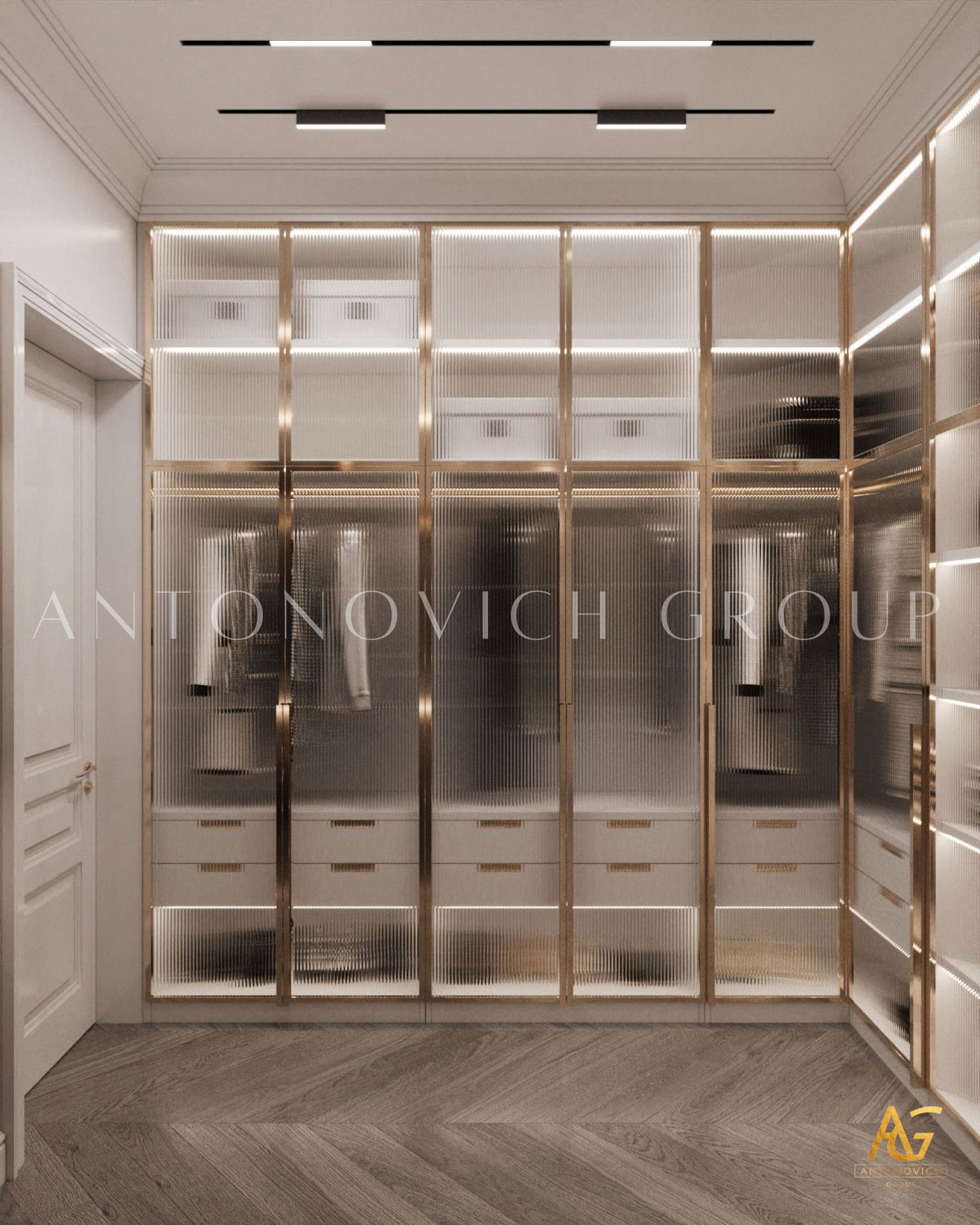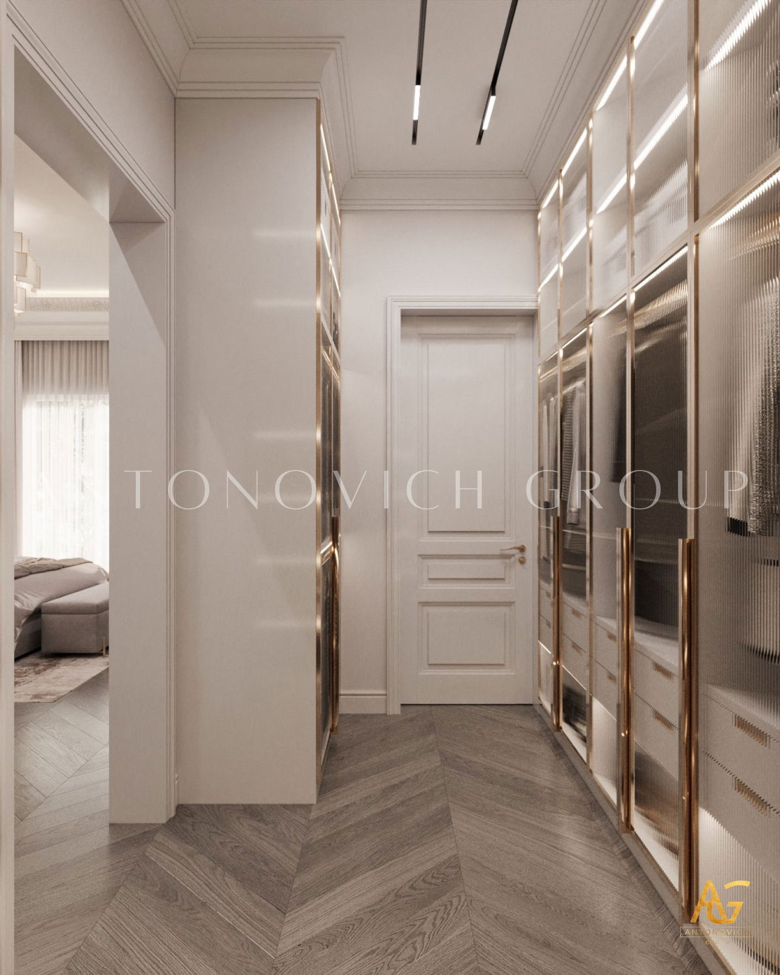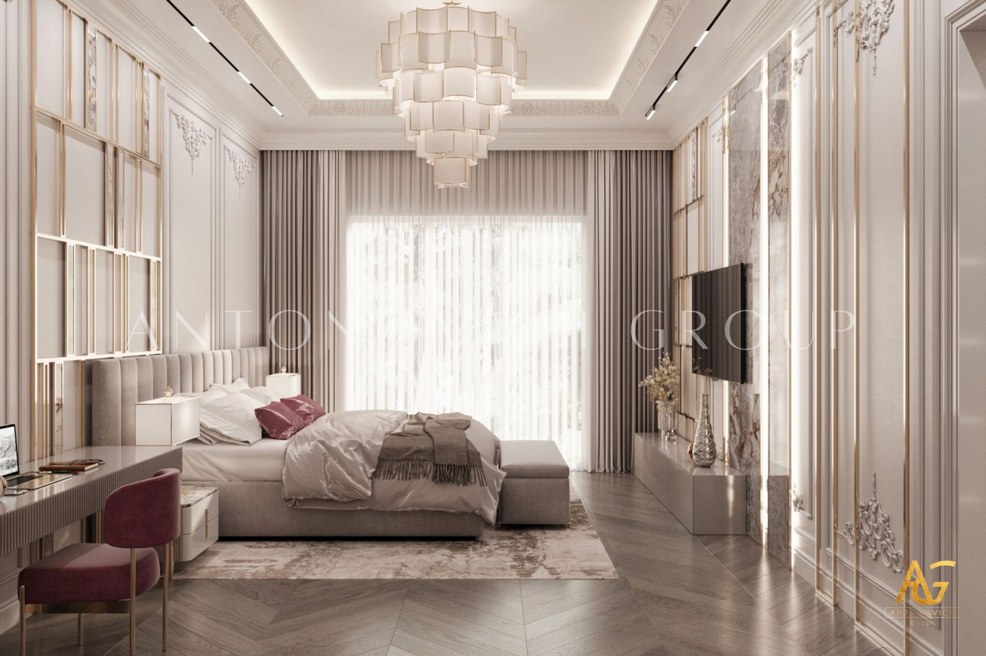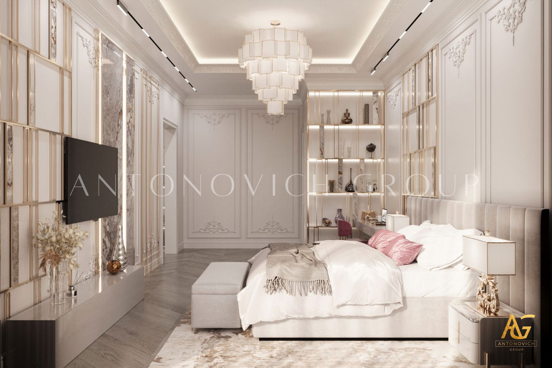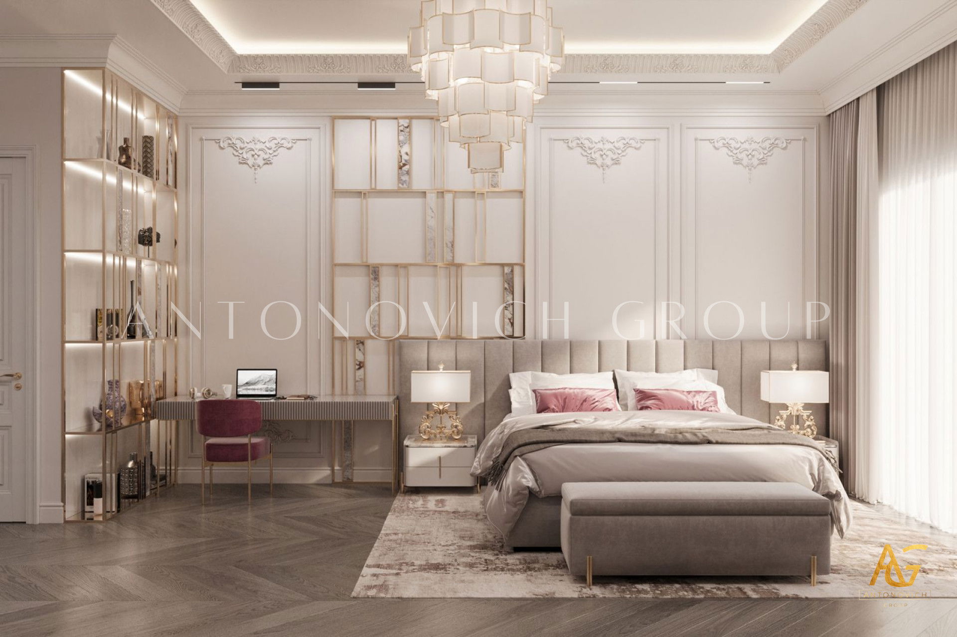 Этот интерьер демонстрирует роскошный декор спальни и проект как пример декор спальни в розово-золотой гамме. Такая стилистика придаёт комнате экстравагантность и гламур. Жизнь в Дубае означает, что вы на вершине мира — вы заслуживаете такую спальню. Гламурный золотой акцент с премиальной отделкой создаёт величественную атмосферу. Его роскошная отделка спальни видна в деталях: розово-кремовое постельное бельё, тщательно продуманная планировка роскошной спальни и изысканные материалы.