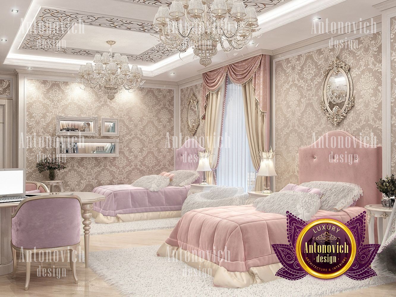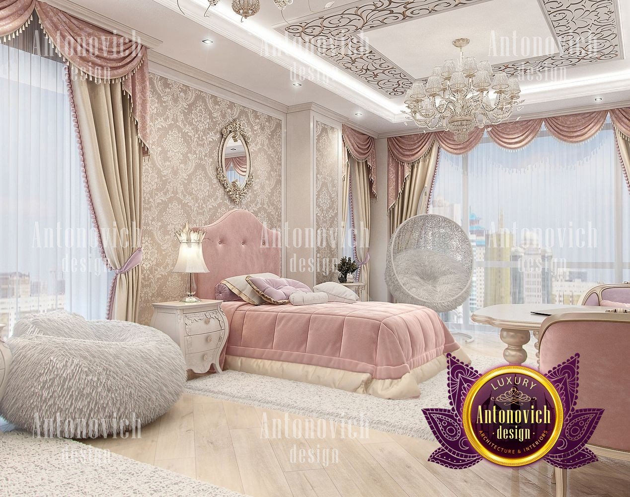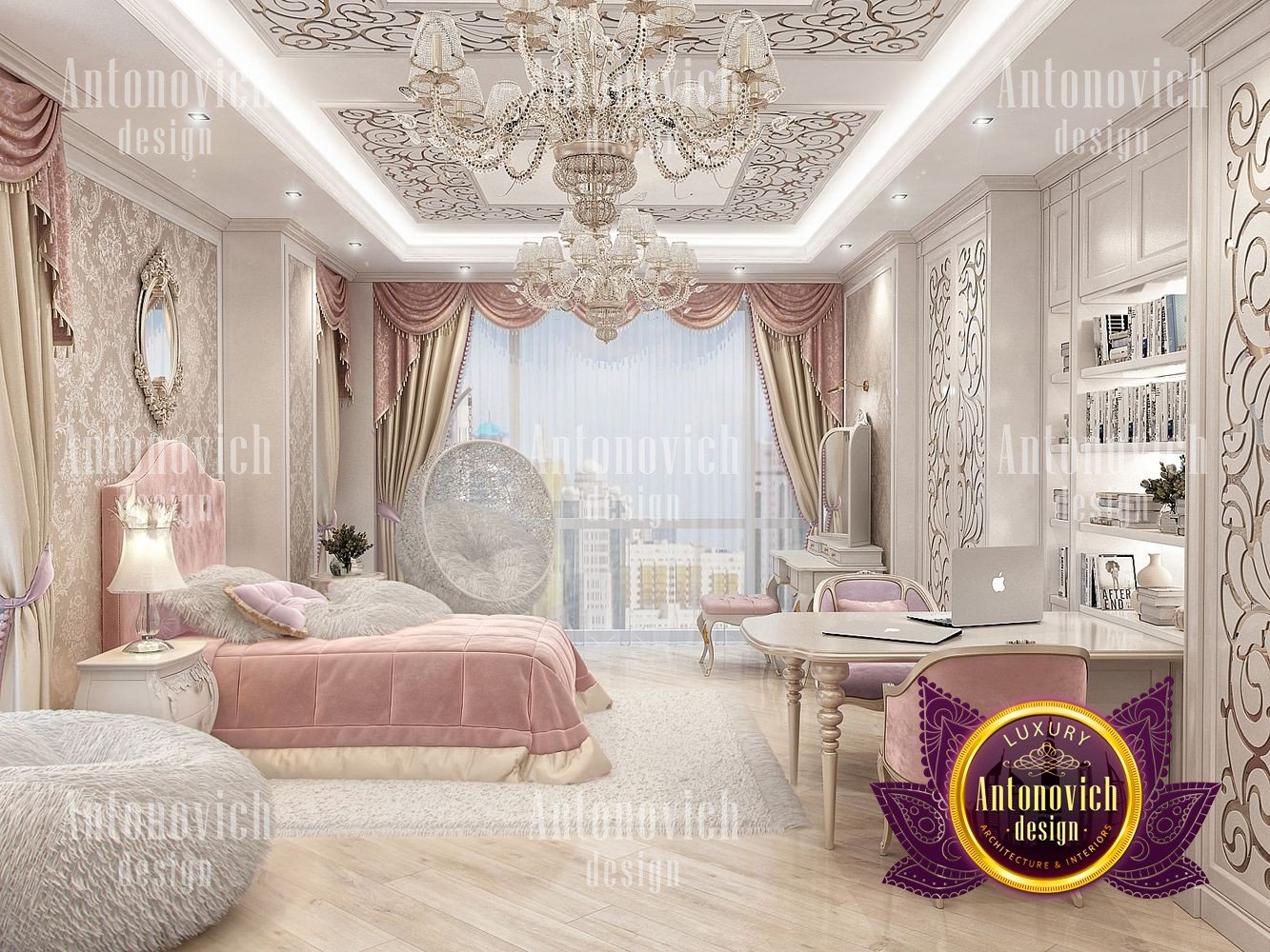 Чтобы окунуться в сказку, в мир детских фантазий, в оазис нежности и тепла. Мы предлагаем близкое знакомство с новым проектом детской комнаты для маленькой принцессы пяти лет. В этом чудесном возрасте все верят в чудеса, сказки и множество прекрасного. Эти мечты дизайнеры студии Антонович Дизайн (Antonovich Design) искусно перенесли в интерьер детской спальни. Предлагаем начать путешествие по этому сказочному пространству с оформления окна. Это восхитительный пример того, какими яркими и элегантными могут быть шторы в классическом стиле. Шелк приятного розово-лилового оттенка с красивыми волнами драпировки опускается до пола. Он удерживается мягкими держателями на двух уровнях. Мягкий ламбрекен, а также аккуратная бахрома прекрасно дополняют композицию. Сверху два больших банта завершают ансамбль, который обрамляет снежно-белую прозрачную тюль. На этом элегантном фоне превосходно смотрится небольшой мягкий диван. Сегодня итальянские мебельные фабрики предлагают роскошные коллекции мебели, особенно для детских комнат. В обивке используются натуральные ткани с тематическими орнаментами, а декор мебели идеально соответствует сказочному настрою в этой комнате, который продолжается удобной кроватью с балдахином. Декор кровати гармонирует с остальной мебелью. Романтический балдахин из белого полупрозрачного шелка увенчан красивым лиловым венком. Этот элемент подчёркивает нежный возраст юной хозяйки комнаты. Потолок и стены оформлены респектабельно и аристократично в лучших традициях классического стиля.
