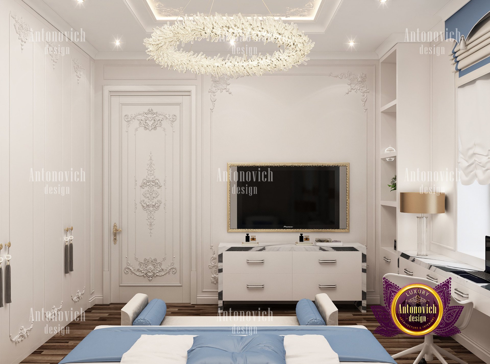 Интерьер спальни выполнен в чисто‑белой гамме стен и потолков с утончёнными декоративными акцентами. Чтобы получить лучший результат при создании дизайна спальни в Дубае, Антонович Дизайн разработала изящную схему потолка с подсветкой и продуманную систему освещения. В центре композиции — современная хрустальная люстра в подвесном круглом исполнении. Для достижения гармонии и уюта использованы акцентные оттенки синего и тёмно‑бежевого. Комплект кровати отличается простой, но благородной формой: видно изящное изголовье кровати, еле заметные детали в подушках и скамье у изножья. Набор художественных ламп размещён по обеим сторонам кровати, а рабочий стол украшен аккуратными декоративными элементами.