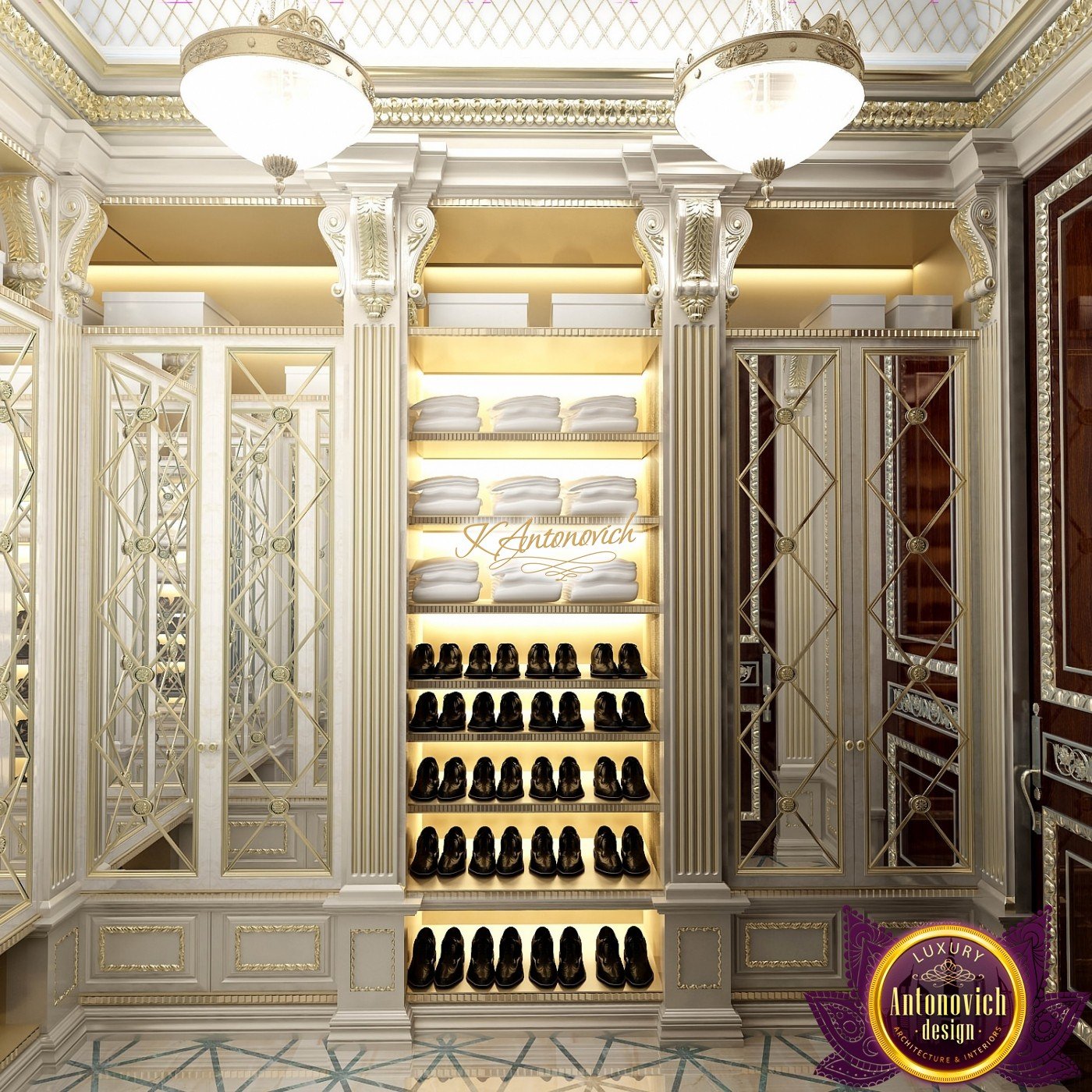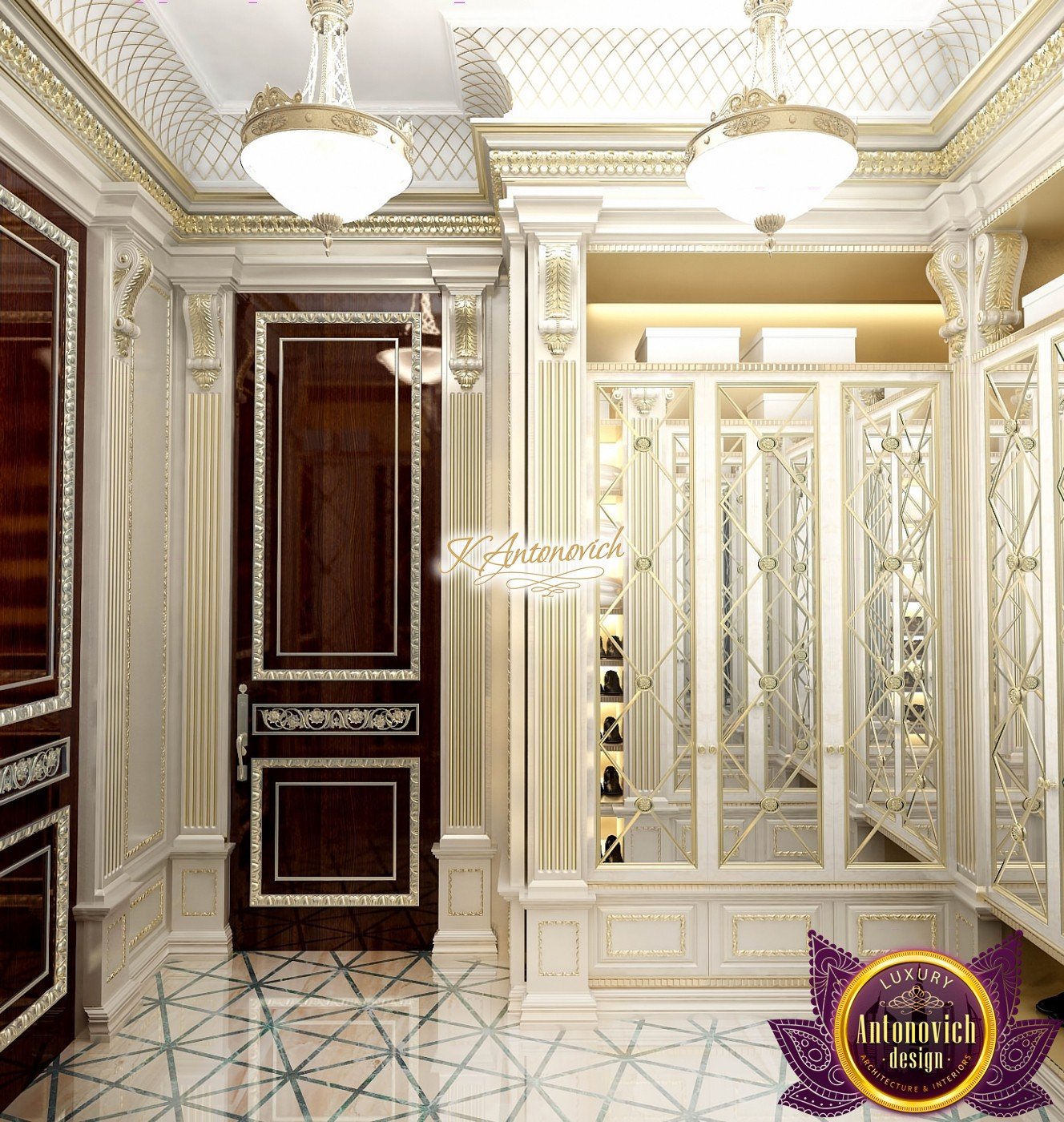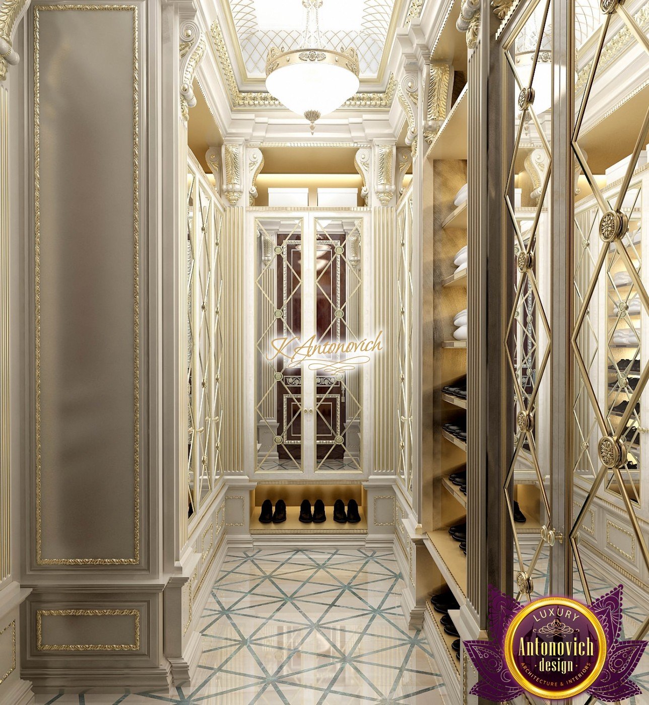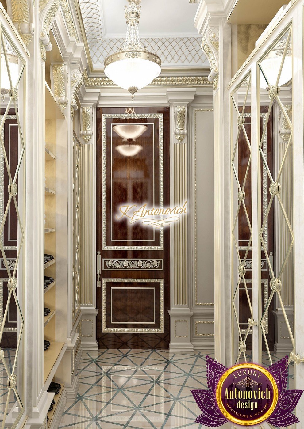 Идеальный пример того, как организовать небольшое пространство и создать достаточно комфортную и невероятно роскошную гардеробную. Это роскошный дизайн гардеробной, сочетающий функциональность и утончённую эстетику. Такой дизайн гардеробной демонстрирует, как интерьер может сочетать функциональность и элитную эстетику. В проекте использован дизайн маленькой гардеробной комнаты, опирающийся на классический стиль с элегантными акцентами ар-деко: гардеробная в стиле ар-деко стала основой проекта. За фасадами роскошной мебели скрыты встроенные системы хранения гардеробной и современные приёмы освещения. Открытые полки оснащены внутренней LED-подсветкой, что делает пребывание в комнате и выбор одежды или обуви очень удобными. Особое внимание уделено освещению гардеробной с LED-подсветкой. Мебель для гардеробной с резьбой и позолоченной отделкой украшает интерьер; фасады шкафов декорированы элегантными пилястрами с резьбой и позолотой. Для визуального расширения пространства использованы декоративные фасетированные зеркальные панели — зеркальные фасады для гардеробной. Две изящные люстры обеспечивают достаточный уровень света; люстры для гардеробной выбирают с учётом масштаба помещения. Для оформления пола предложена мраморная плитка для пола гардеробной из натурального камня. Декор потолка также способствует визуальному увеличению объёма; арочная ниша с позолотой украшена изящными золотыми орнаментами и отделана роскошной лепниной — интерьер гардеробной с лепниной.