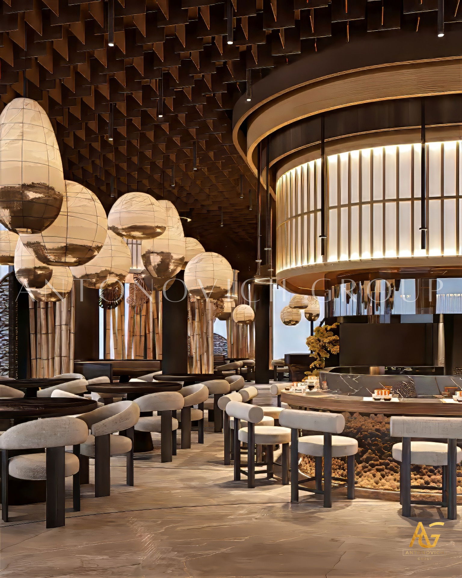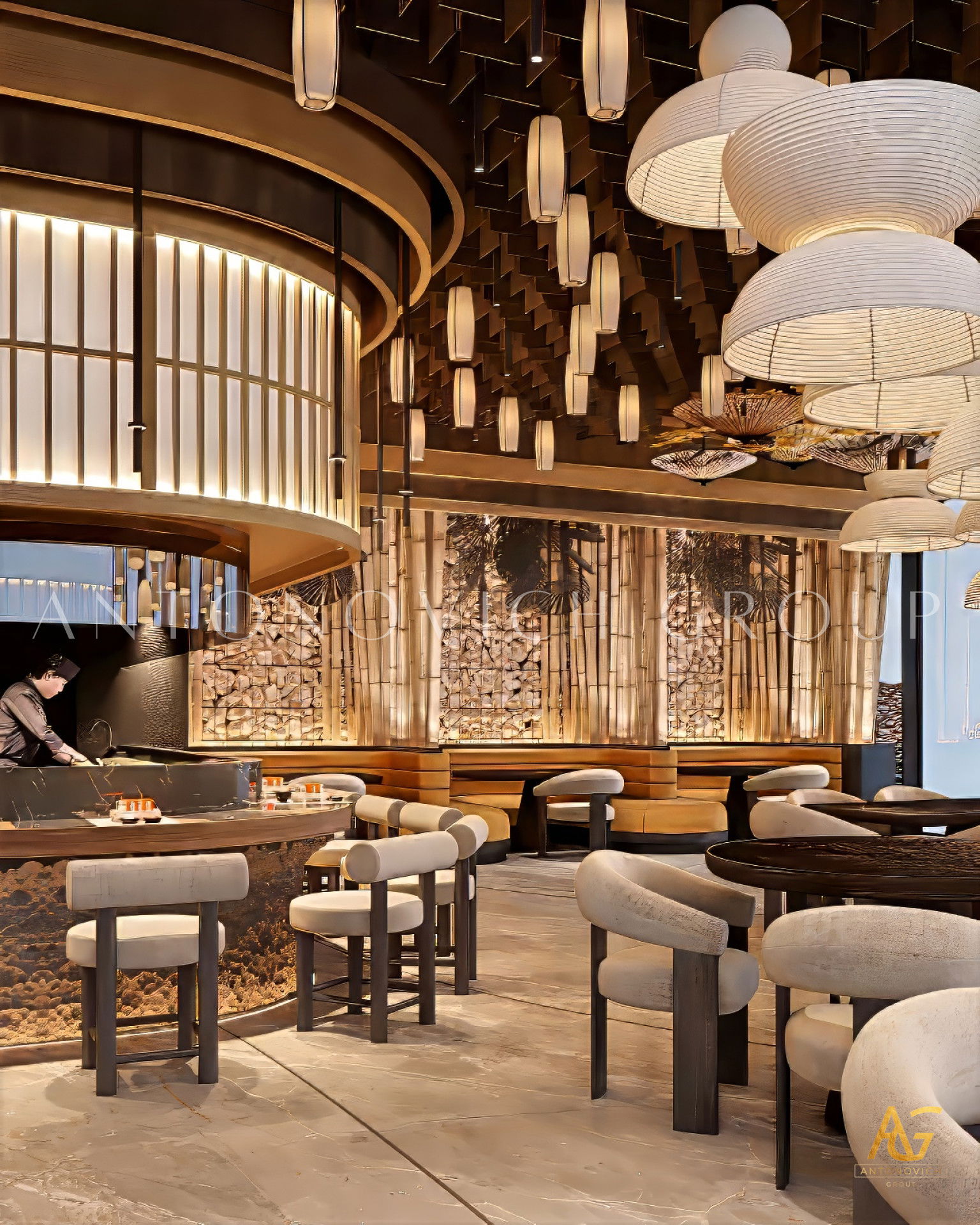 - Освещение играет ключевую роль: комбинируйте естественный и искусственный свет. Подумайте об управляемом решении — освещение для китайского ресторана должно меняться по зонам и времени суток, создавая интимную атмосферу для поздних ужинов и более яркий свет для дневных смен.
