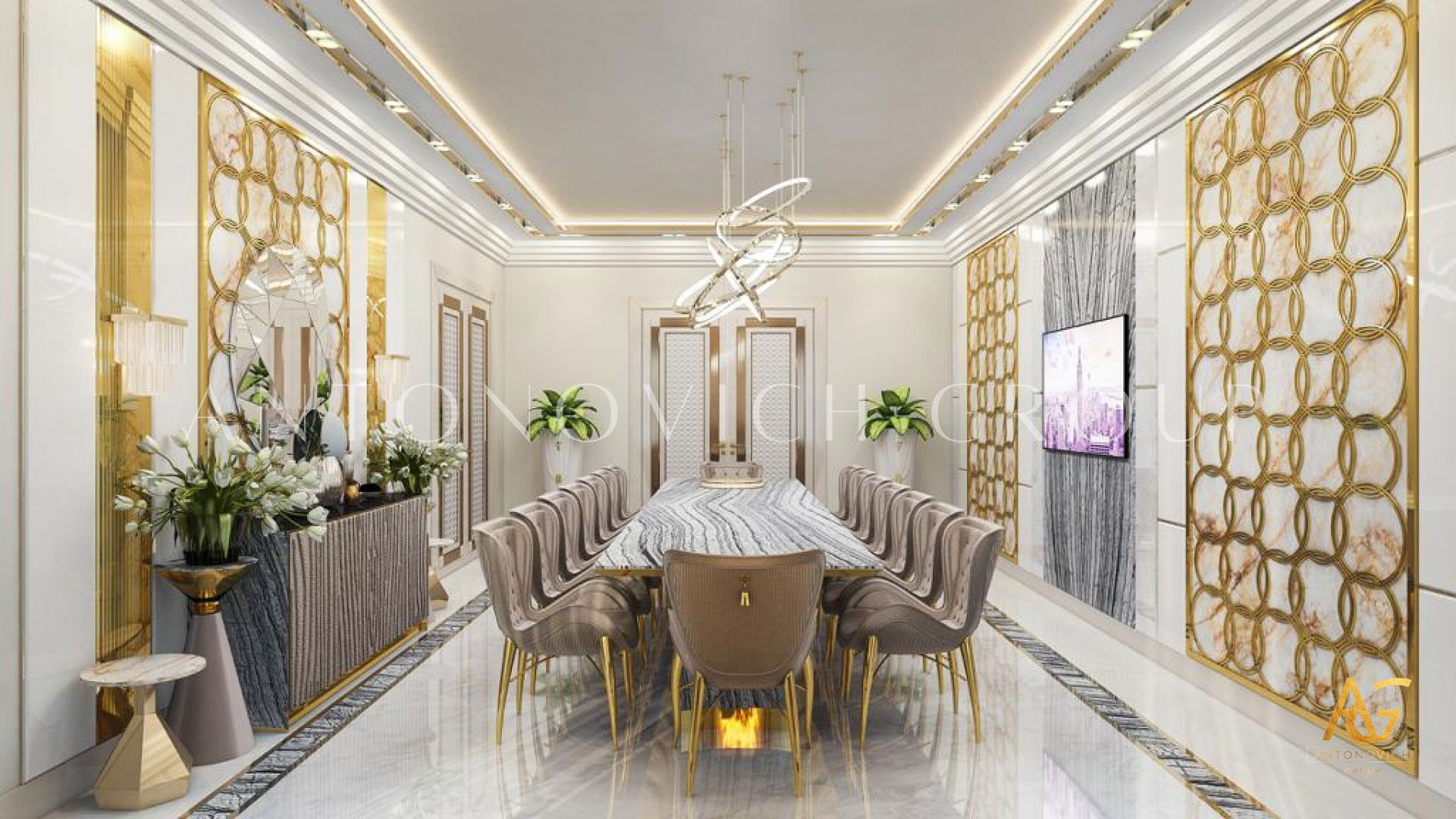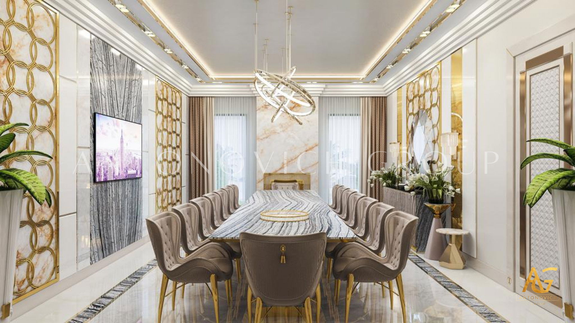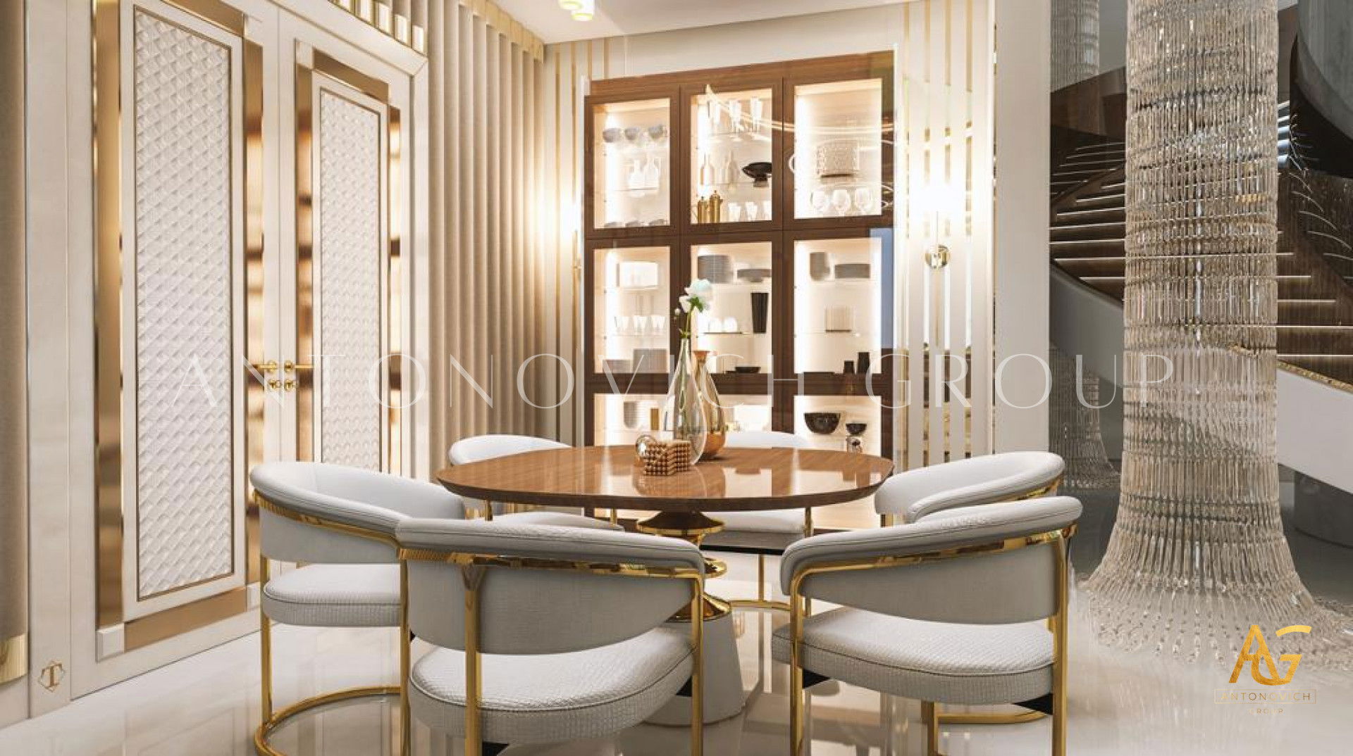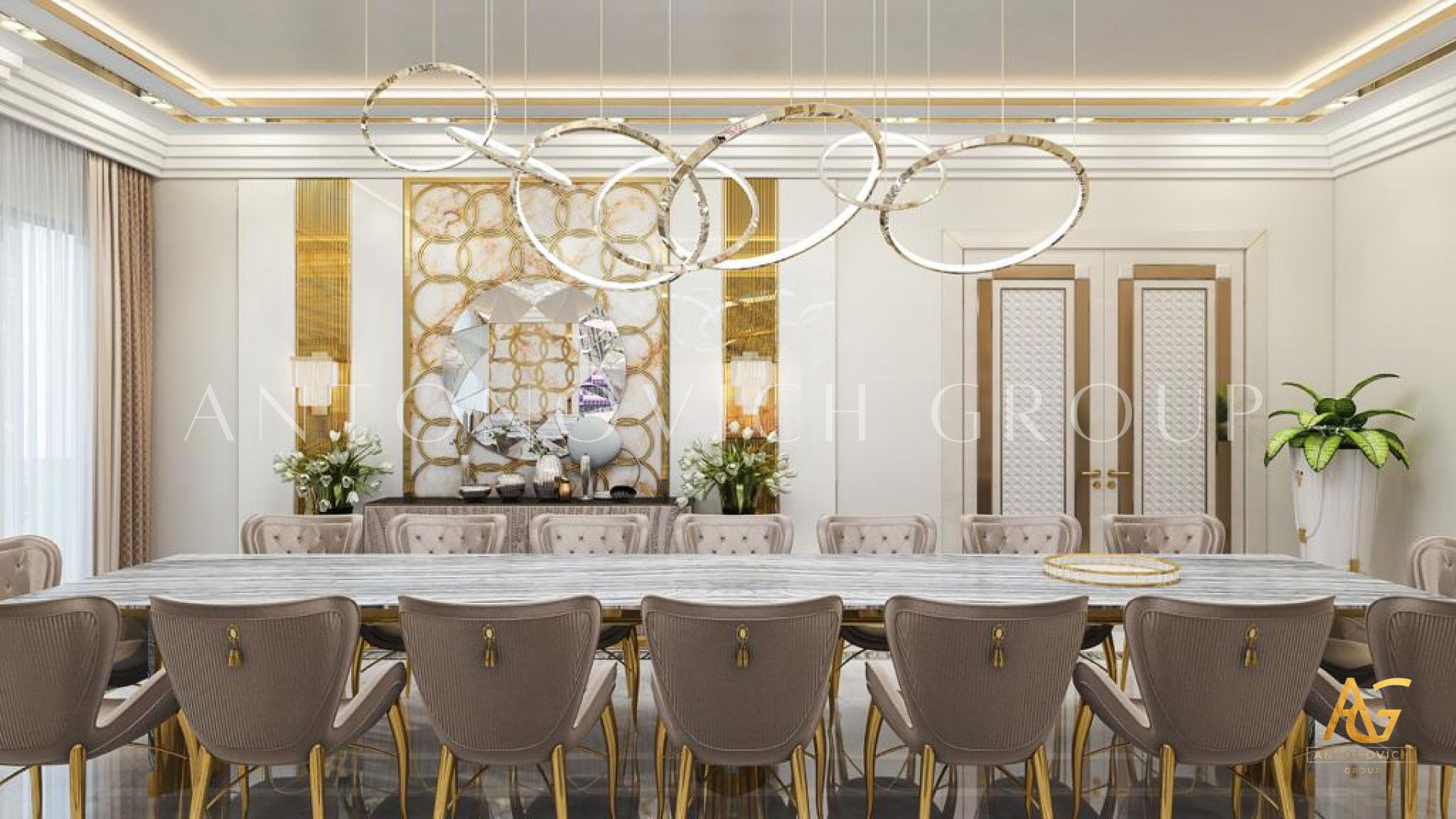 Золотистые оттенки и продуманное освещение придают интерьеру правильный премиальный характер. Освещение — один из ключевых приёмов, который подчёркивает современность и роскошь. С круглыми формами и актуальными форм-факторами обеденная группа в проекте от ведущих студий очень современна. Помещение просторное и подходит для роскошной резиденции. При планировании следует учитывать размеры вашего дома и назначение пространства. Антонович Дизайн помогает с выбором подходящего решения и его точной подгонкой под планировку.