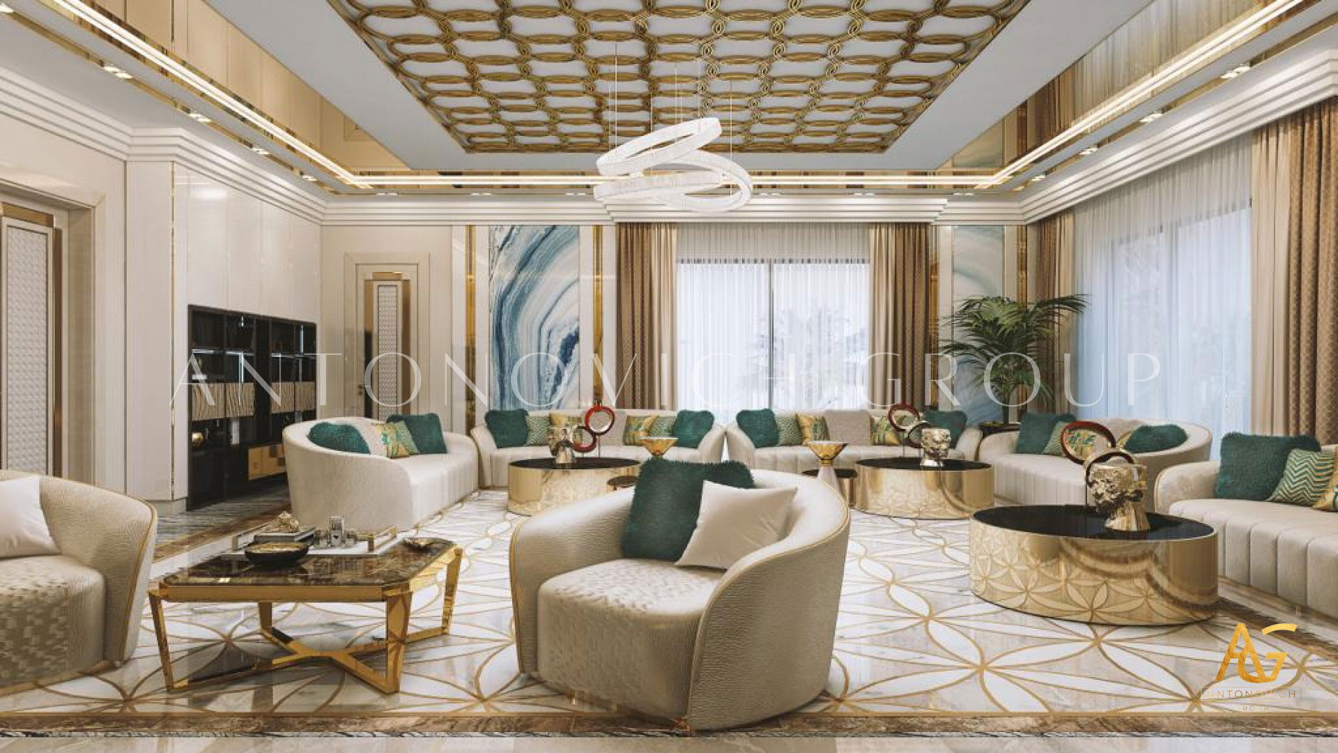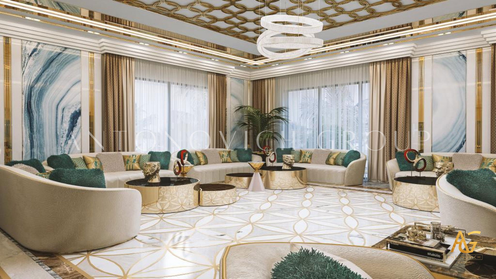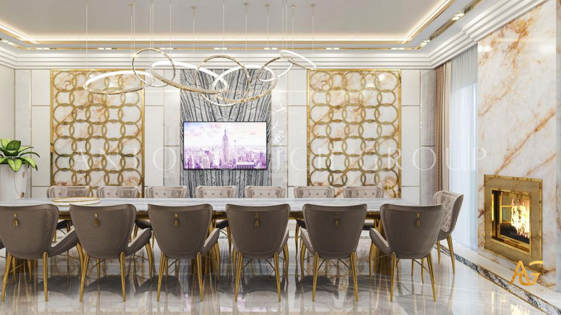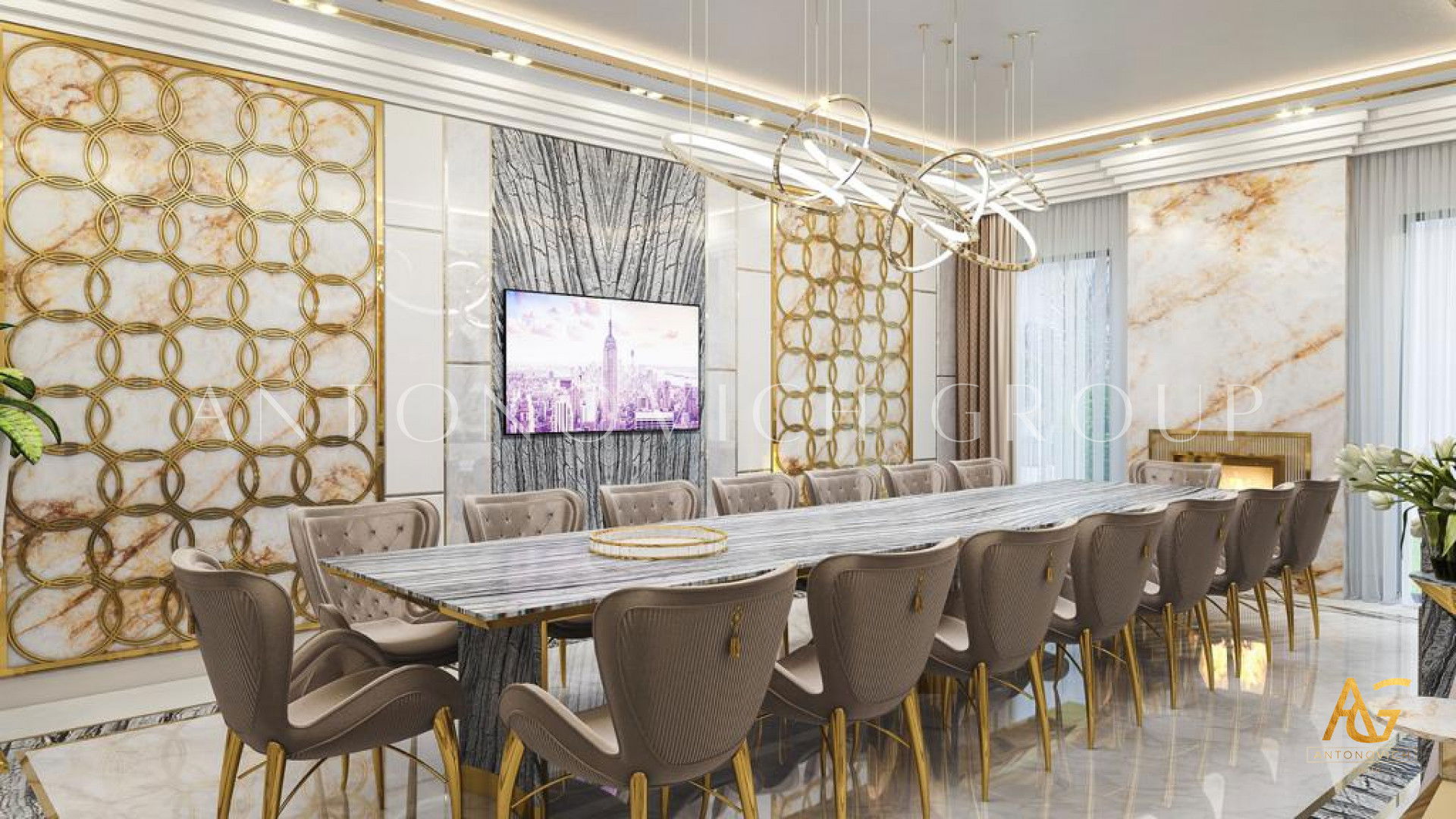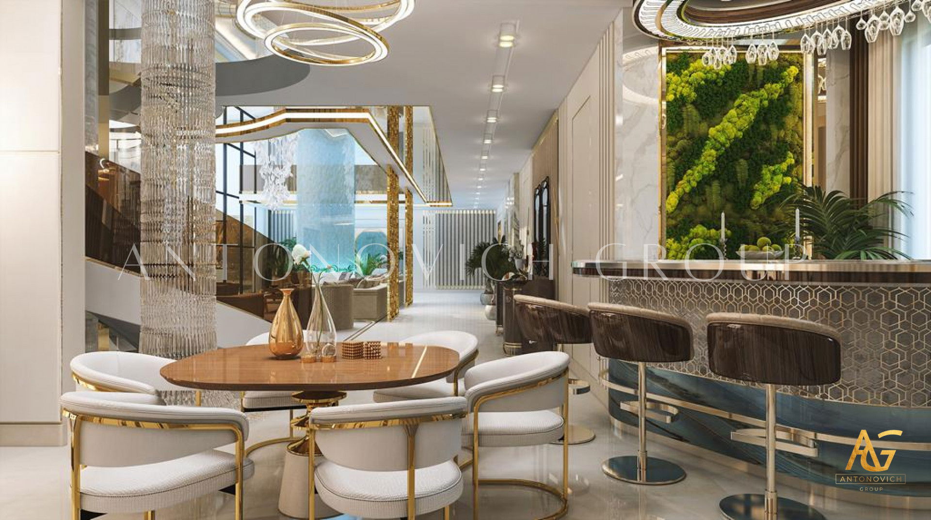 Золотистые оттенки и продуманное освещение придают интерьеру правильный премиальный характер. Освещение — один из ключевых приёмов, который подчёркивает современность и роскошь. С круглыми формами и актуальными форм-факторами обеденная группа в проекте от ведущих студий очень современна. Помещение просторное и подходит для роскошной резиденции. При планировании следует учитывать размеры вашего дома и назначение пространства. Антонович Дизайн помогает с выбором подходящего решения и его точной подгонкой под планировку.