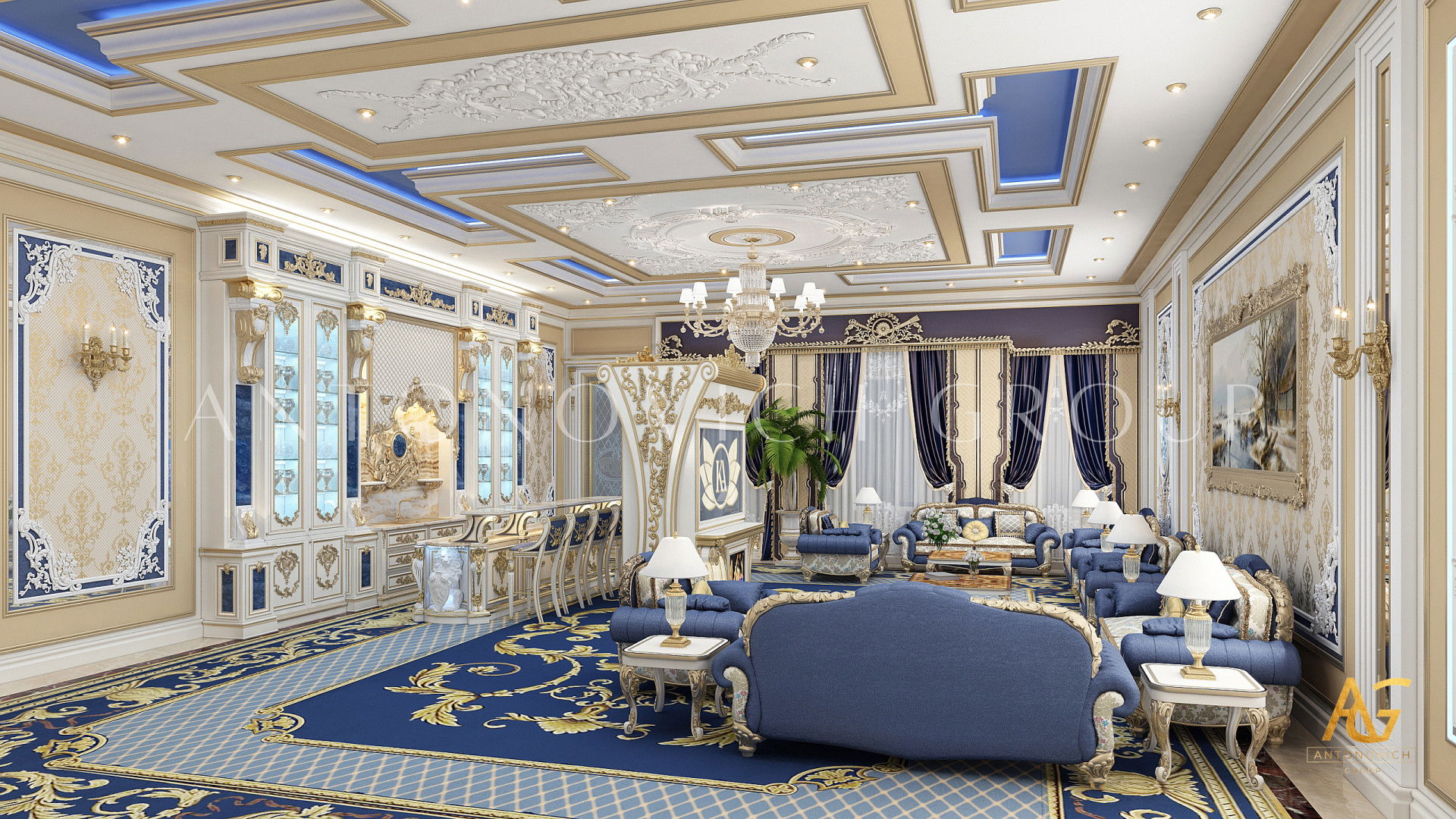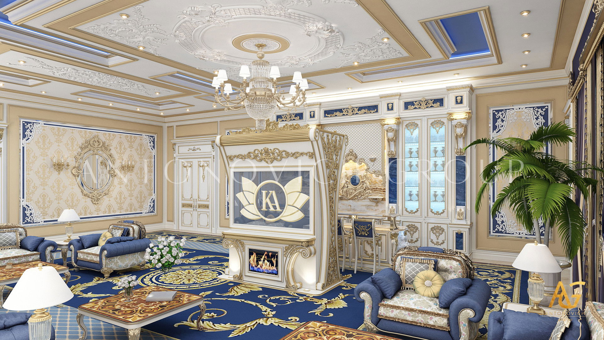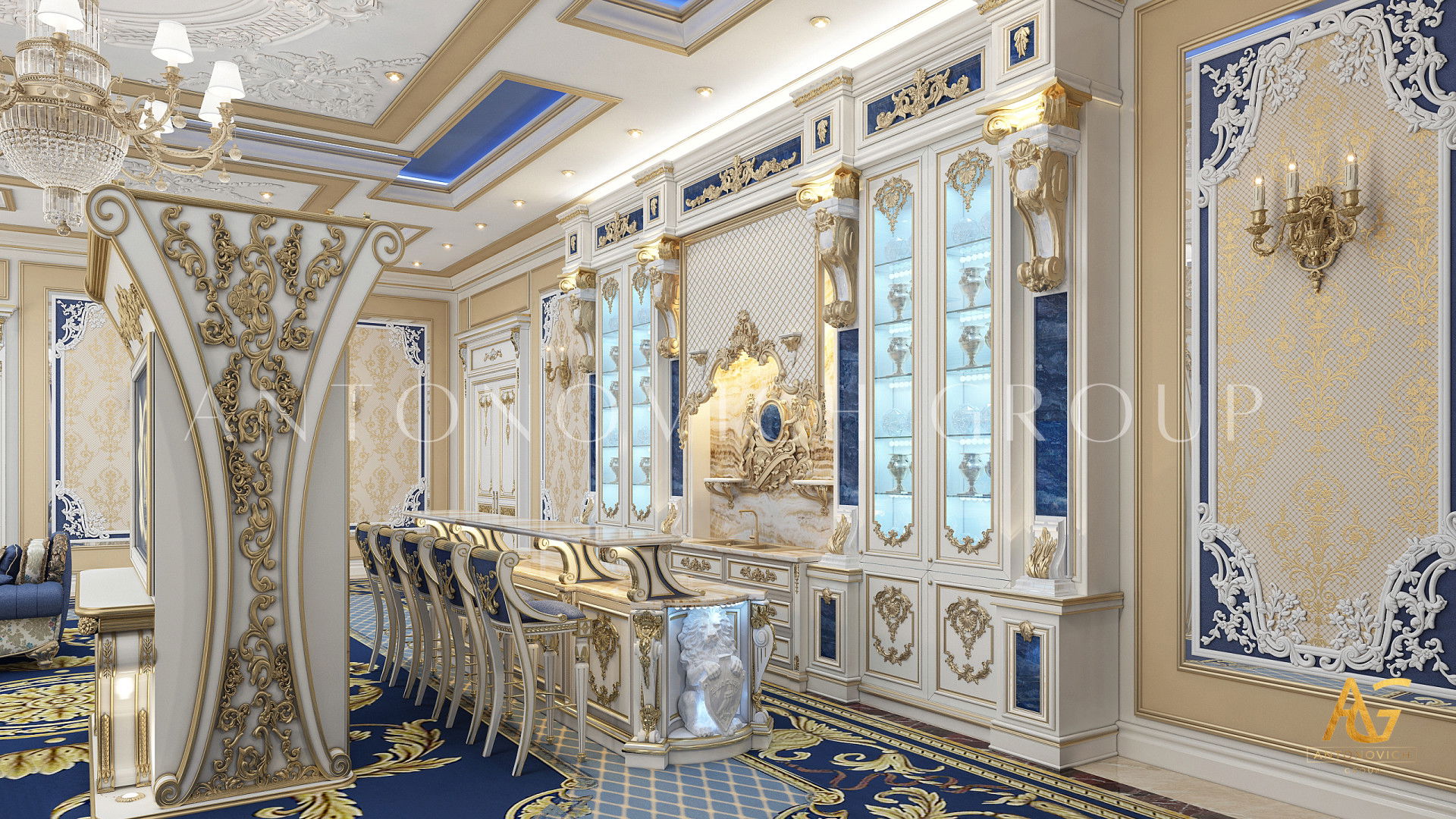 Великолепный и изысканный дизайн арабского мажлиса от архитектурно-дизайнерской компании Антонович Дизайн (Antonovich Design) вдохновляет и радует взгляд. Во всём чувствуется индивидуальность — это девиз интерьера арабского мажлиса. Профессионалы международной известности студии Антонович Дизайн наполнят дом гармонией, красивыми образами и впечатляющими сценами. В таком уютном пространстве ваша жизнь станет ярче и наполнится палитрой оттенков. Главная часть — его индивидуальность и уникальность. Стиль арабского мажлиса дарит лёгкое естественное очарование, которое приносит покой и расслабление. В красивом пространстве используют дорогую модную мебель, мебель для арабского мажлиса, богато декорированную изящной резьбой и эксклюзивные ткани для мажлиса. По Корану в арабском интерьере отсутствуют живопись и скульптура, поэтому в дизайне доминируют разнообразные сложные узоры. Присутствуют геометрические рисунки, переплетённые с текстом. Узорчатые геометрические орнаменты в мажлисе подчёркивают художественную идею. Волшебство потолка захватывает дух — всё продумано до последней детали. Изящные люстры как неотъемлемые элементы декора привлекают восхищённые взгляды гостей. Освещение и люстры для мажлиса создают особую атмосферу. Роскошный декор арабского мажлиса подчёркивает статус и утончённый вкус. Чистые плавные линии с изысканными узорами не только визуально увеличивают пространство, но и придают комнате особую выразительность. Посмотрите на напольное покрытие: мраморный пол в мажлисе — совершенно натуральный материал, экологичен. Поверхность мраморной плитки гладкая и блестящая. Её полировка создаёт особые драматические оттенки. Благодаря красивым рисункам напольное покрытие выглядит ещё более утончённым и элегантным. Завершающий штрих интерьера мажлиса — красивые элегантные шторы для арабского мажлиса, которые придают помещению благородство и шарм.