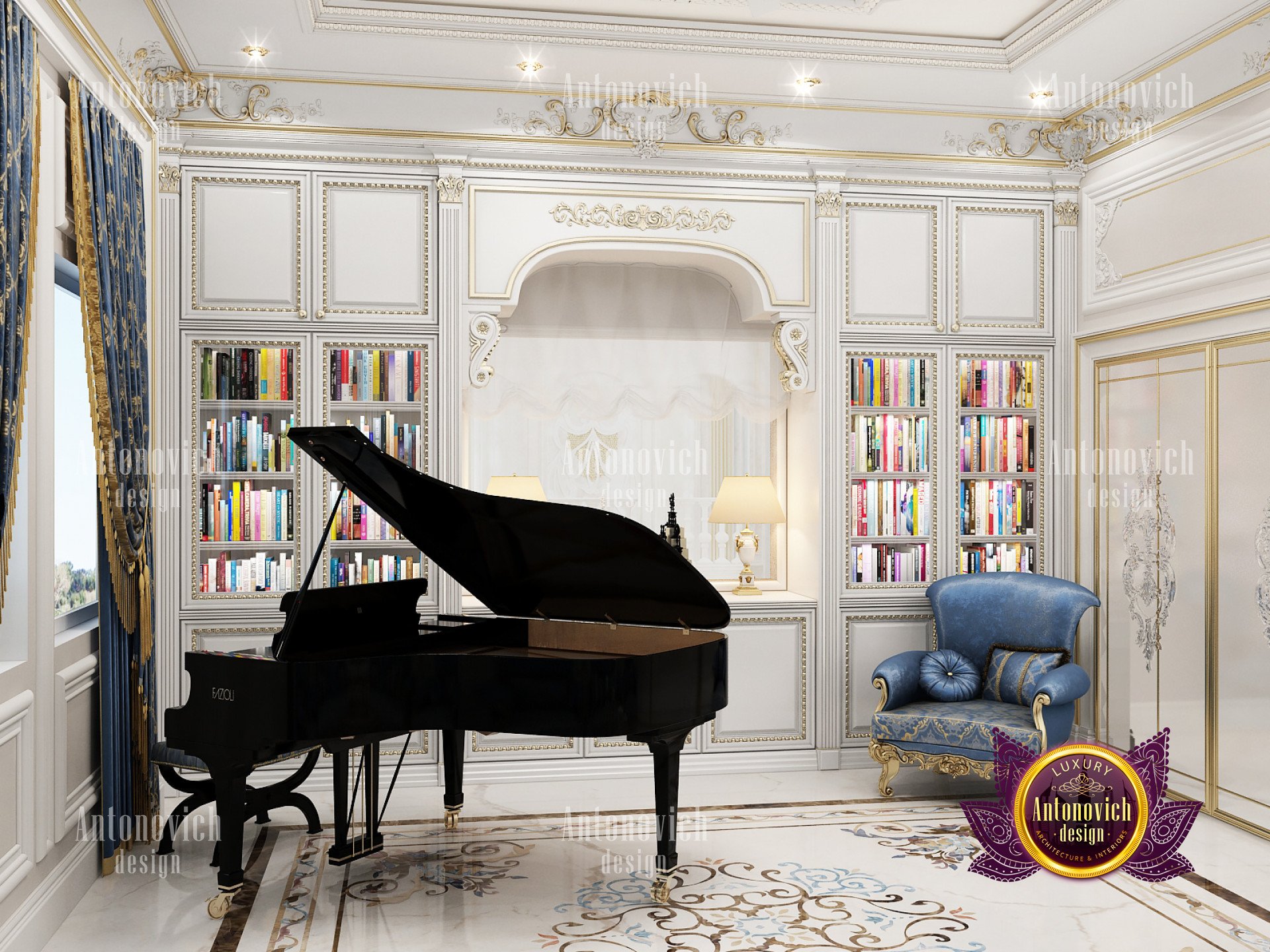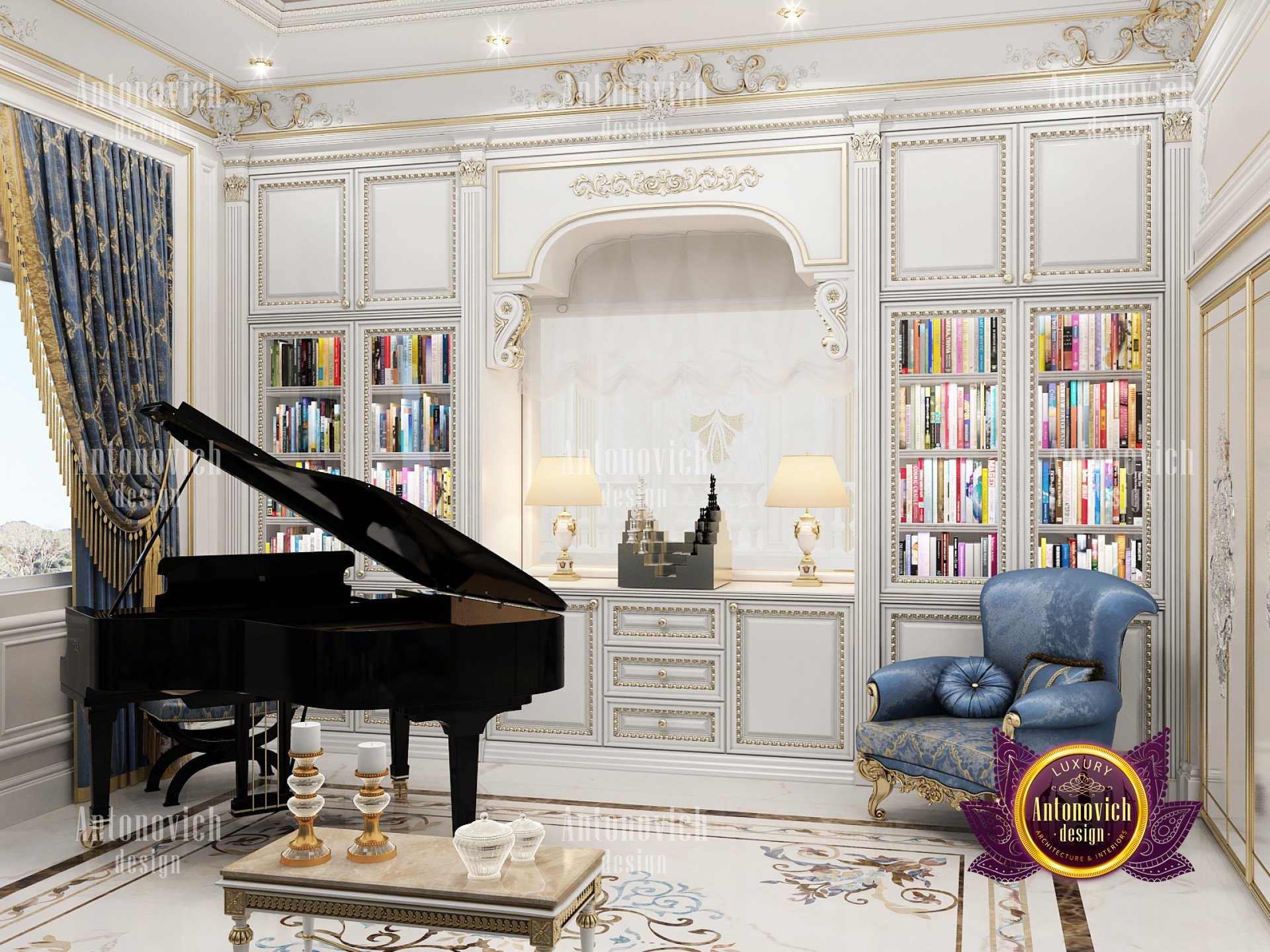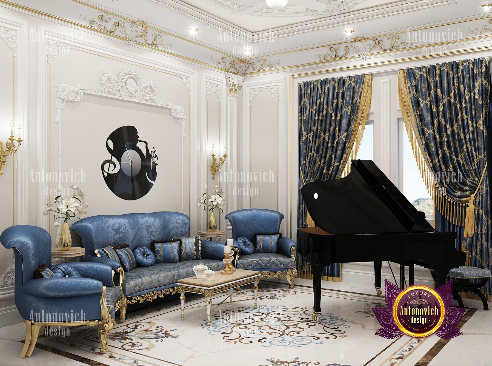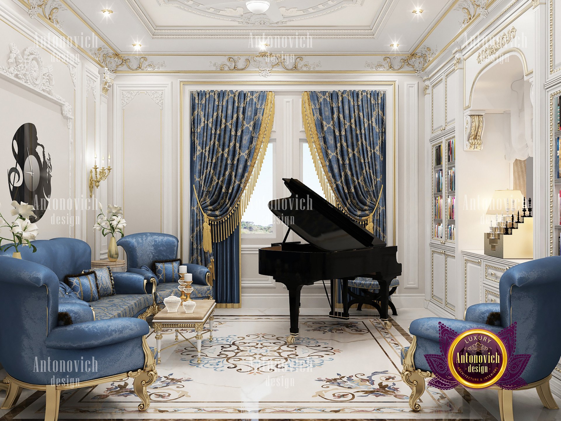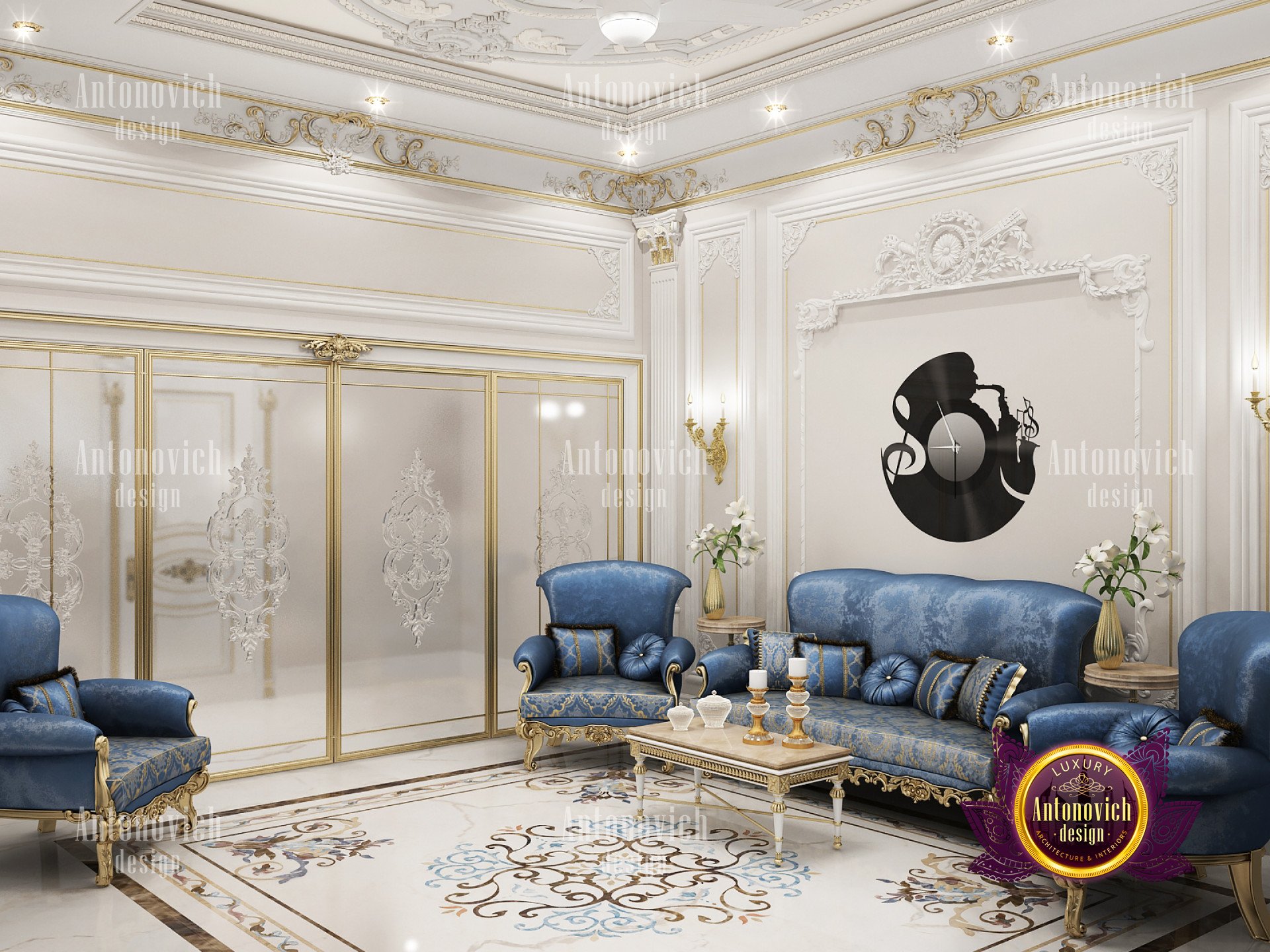 Синие и белые акцентные цвета заметно преображают роскошный дизайн. Такие решения создают роскошный дизайн гостиной, заметный в каждой детали. Одной из привлекательных черт этого пышного проекта в Дубае является впечатляющая мебель. Сегодня в тренде классический дизайн гостиной из благородного дерева. Узорные элементы на стенах превосходно дополняют идеи для гостиной в классическом стиле. Антонович Дизайн (Antonovich Design) создал интерьер, где покой и функциональность сосуществуют — пример продуманного дизайн гостиной для семьи. Даже люстра выполнена так, чтобы подчеркнуть роскошный интерьер гостиной в Дубае.