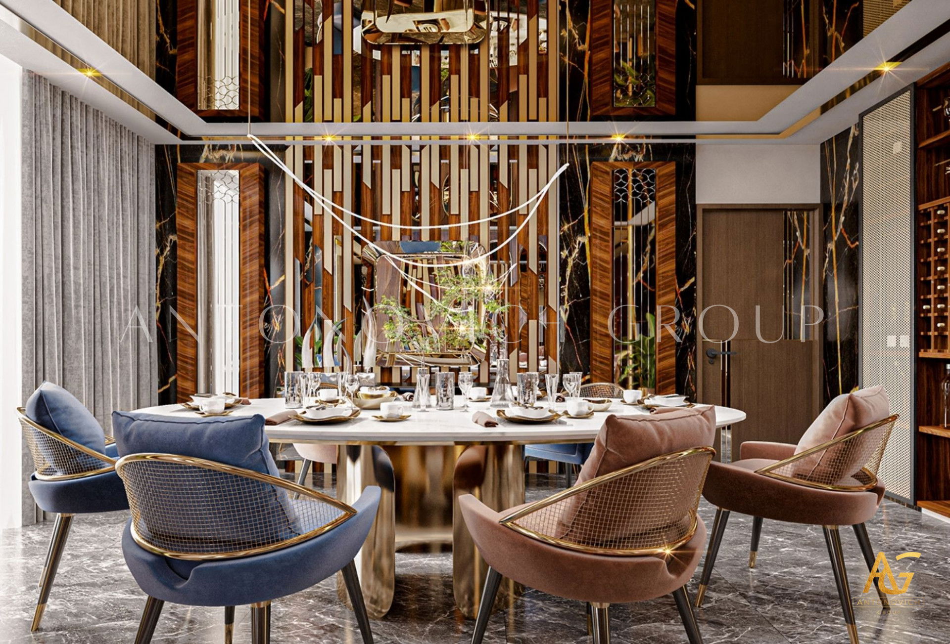 Роскошный дизайн столовой не обязательно сводится к вечной эстетике, золоту и викторианской роскоши. При грамотном исполнении даже современный дизайн столовой с деревянным столом или столом из камня и нейтральные тона в интерьере столовой — от черного до серого — способны выглядеть притягательно. Освещение завершает эту тонкую головоломку: сияющая люстра, каскадная подвесная система с хрусталём или авторская люстра, которая моментально становится центром внимания. Всё упирается в размер и форму интерьера; если столовая и кухня объединены и пространство ограничено, круглый обеденный стол для маленькой столовой — лучший выбор.