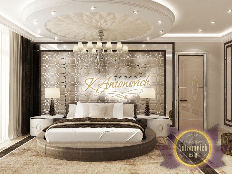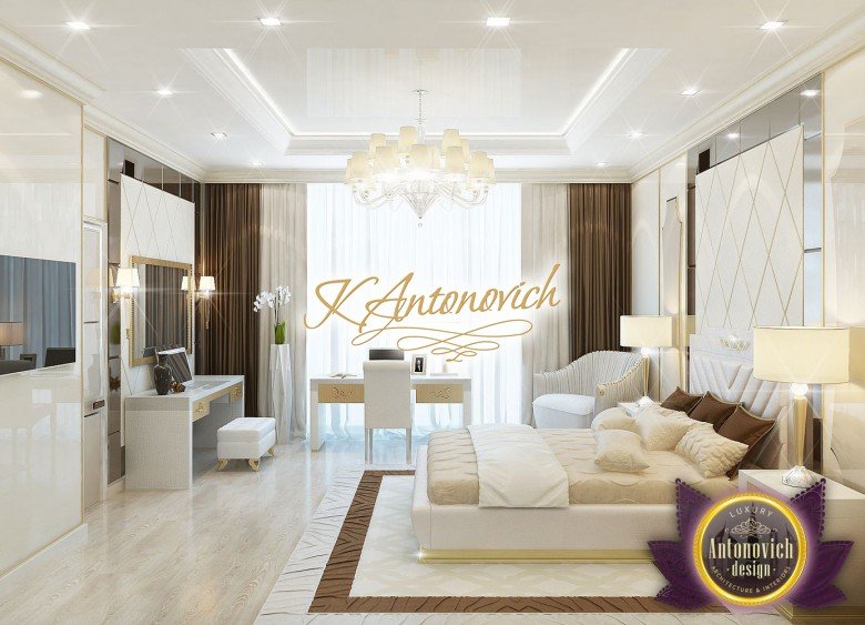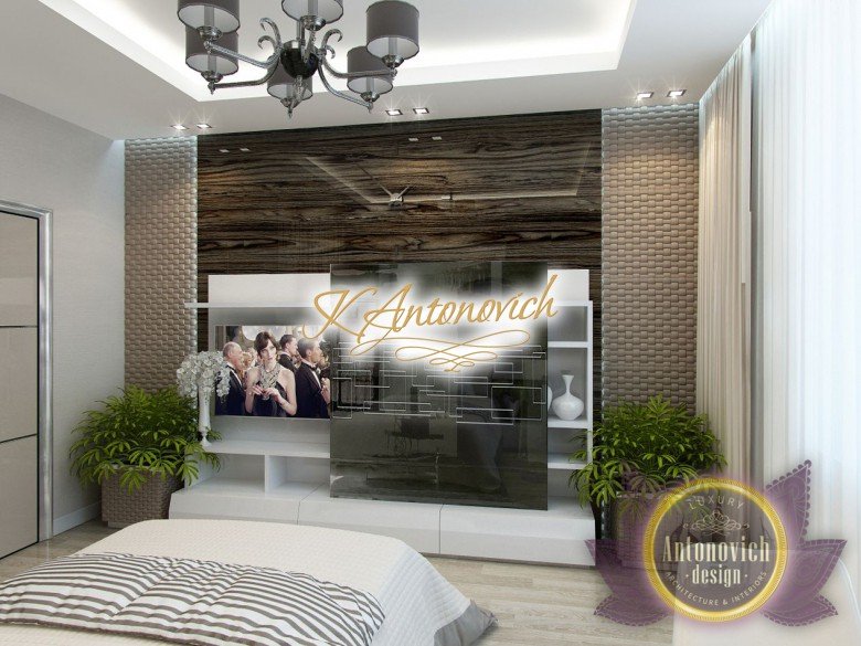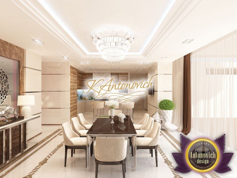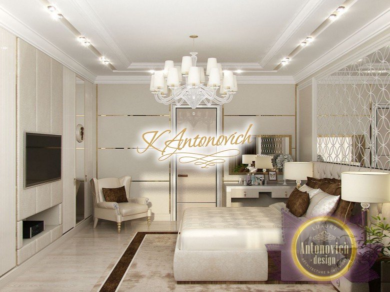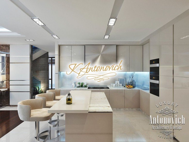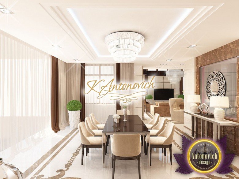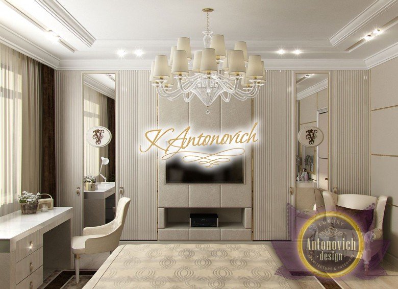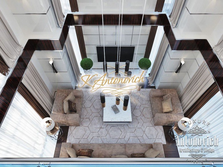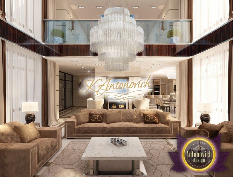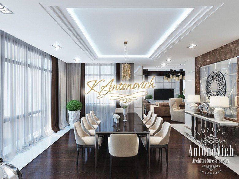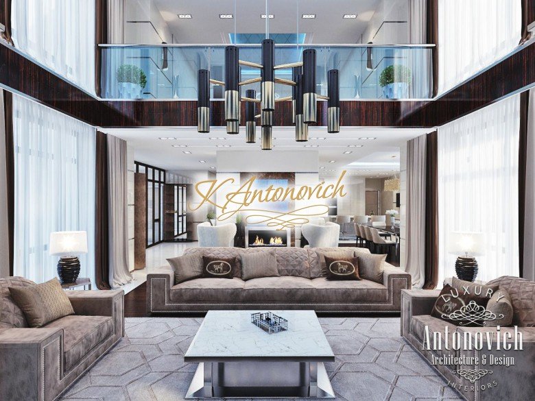 Антонович Дизайн (Antonovich Design) черпала вдохновение из множества собственных вариантов внутреннего оформления для этого проекта. Этот проект — вилла современного стиля. Пространство сочетает изысканность и комфорт: декоративный потолок с карнизами, занавеси от пола до потолка с белыми ламбрекенами наверху и крупная мебель. Тёмный деревянный пуф с точёными ножками гармонирует с диванами. Открытые стеллажи, поднимающиеся до потолка, усиливают атмосферу сдержанной роскоши, которая пронизывает весь интерьер. Антонович Дизайн остановилась на мягких приглушённых оттенках, поскольку семье важно мгновенно расслабляться, входя в дом после насыщенного дня. Хотя базовая мебель и аксессуары преобразуют дом в уютное пространство, небольшие акценты оживляют оформление: роскошные элементы сидения, пушистые подушки и декоративные корзины делают комнату более комфортной.