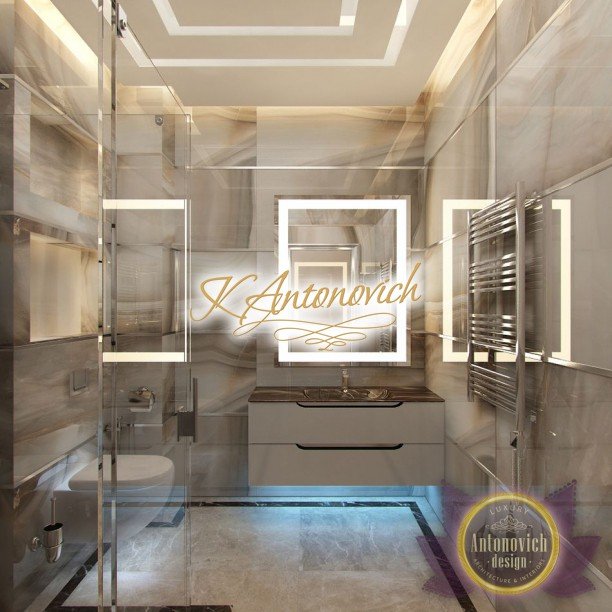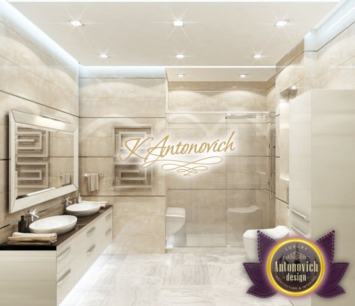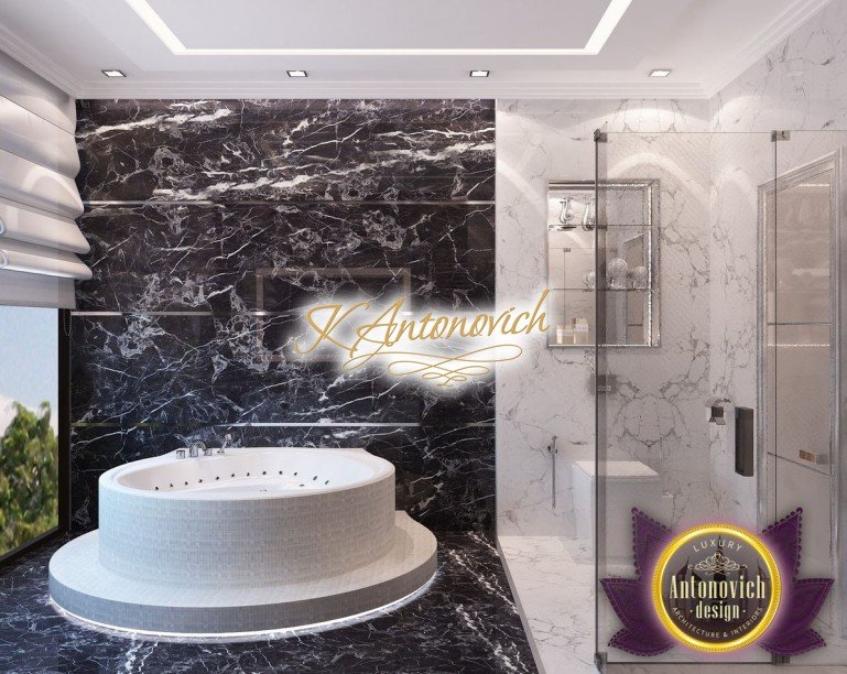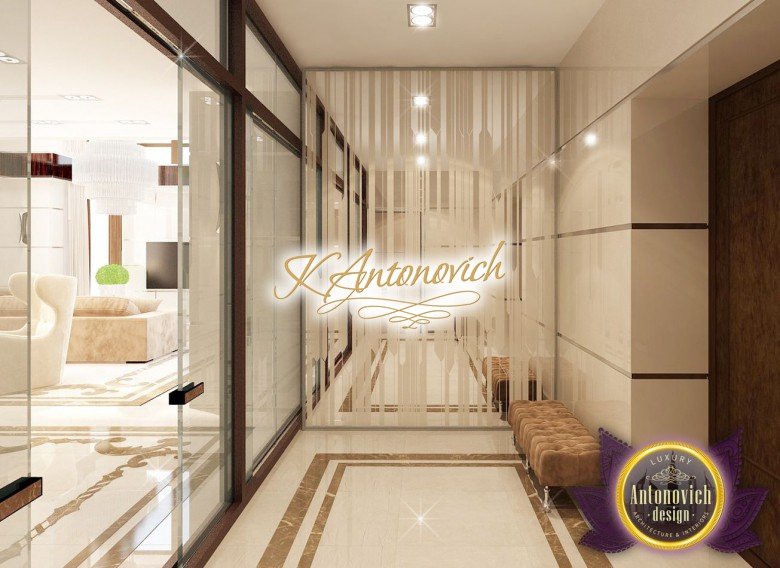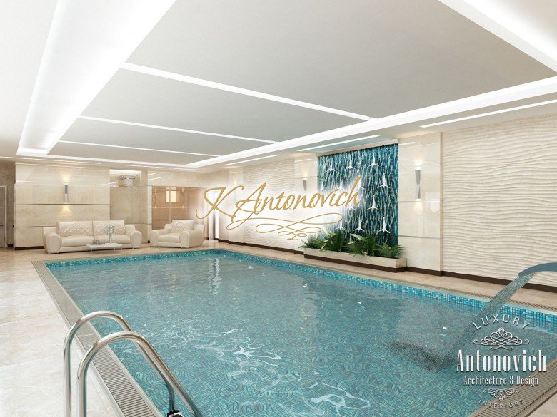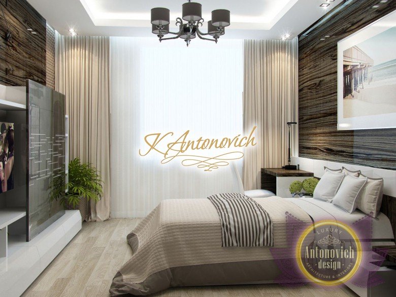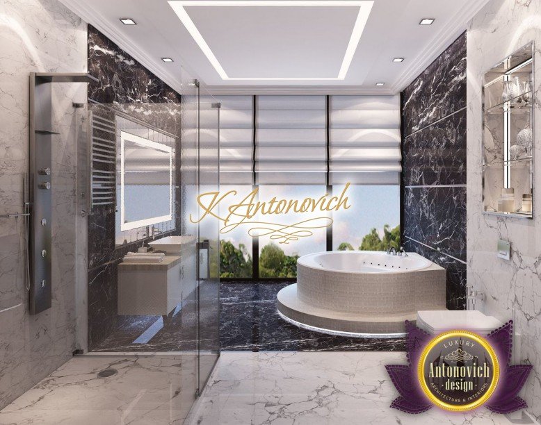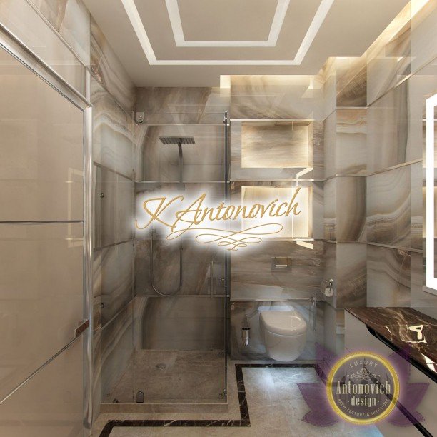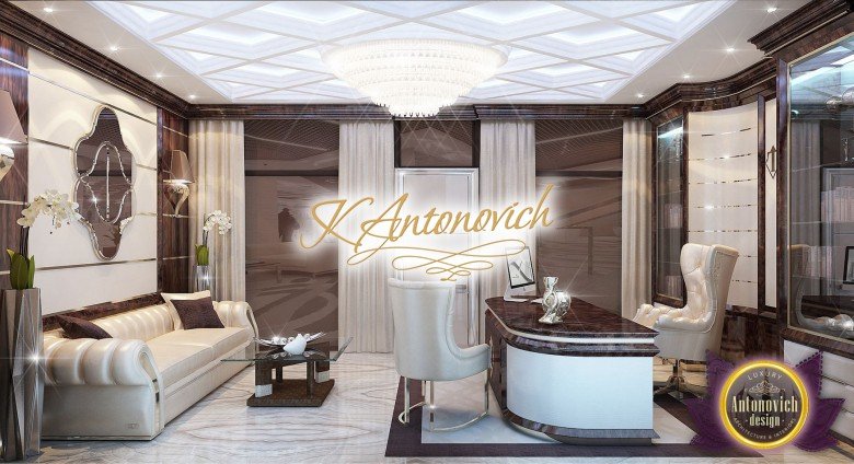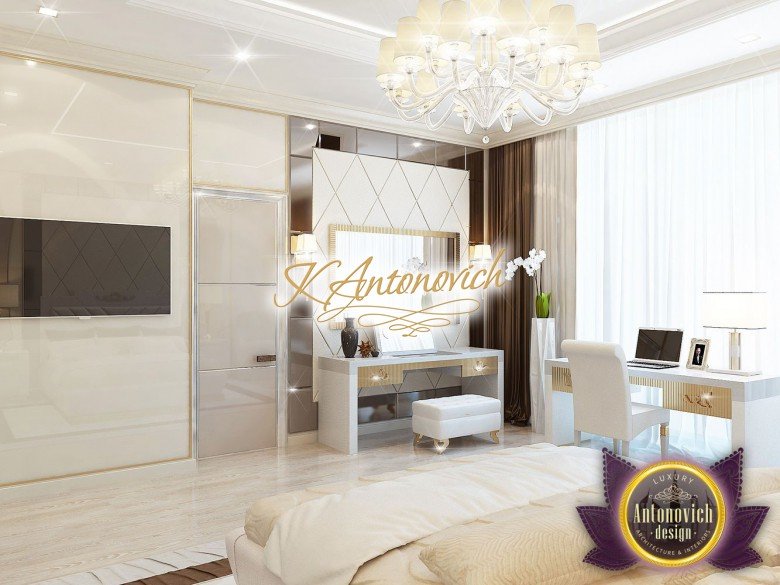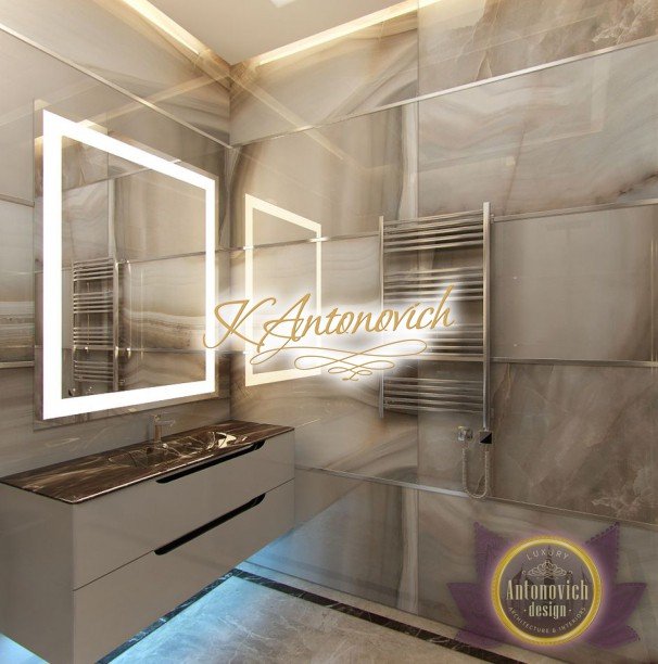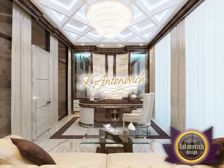 Антонович Дизайн (Antonovich Design) черпала вдохновение из множества собственных вариантов внутреннего оформления для этого проекта. Этот проект — вилла современного стиля. Пространство сочетает изысканность и комфорт: декоративный потолок с карнизами, занавеси от пола до потолка с белыми ламбрекенами наверху и крупная мебель. Тёмный деревянный пуф с точёными ножками гармонирует с диванами. Открытые стеллажи, поднимающиеся до потолка, усиливают атмосферу сдержанной роскоши, которая пронизывает весь интерьер. Антонович Дизайн остановилась на мягких приглушённых оттенках, поскольку семье важно мгновенно расслабляться, входя в дом после насыщенного дня. Хотя базовая мебель и аксессуары преобразуют дом в уютное пространство, небольшие акценты оживляют оформление: роскошные элементы сидения, пушистые подушки и декоративные корзины делают комнату более комфортной.
