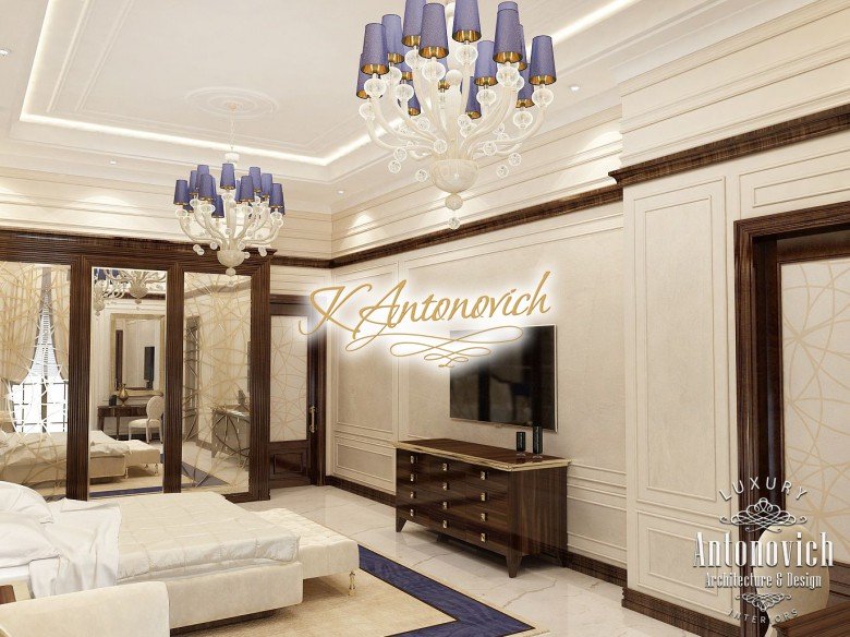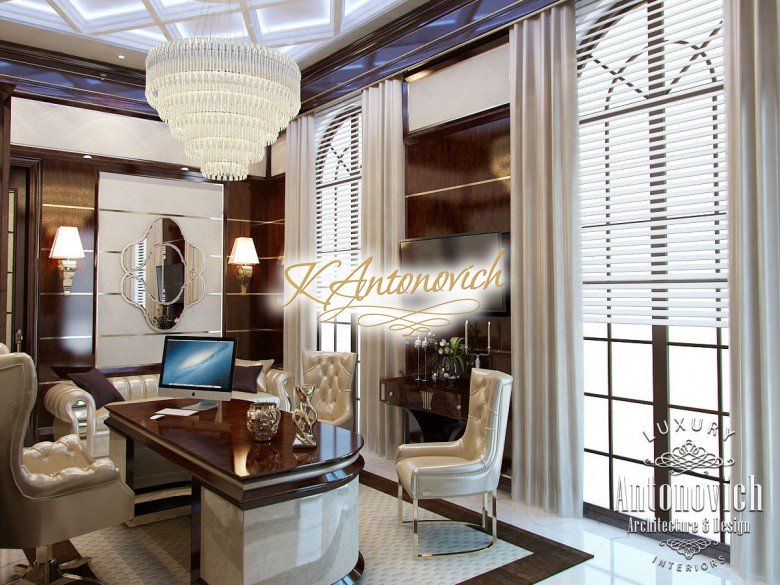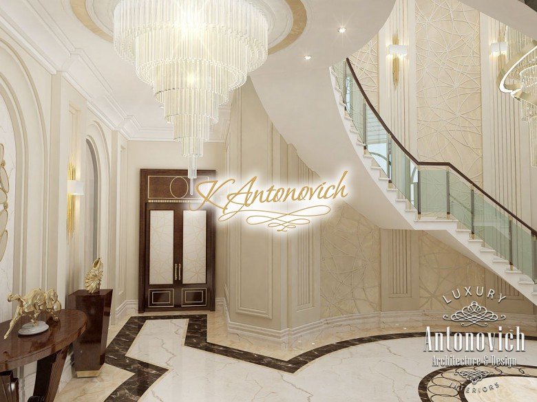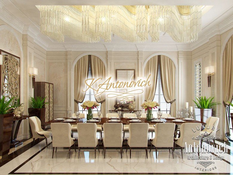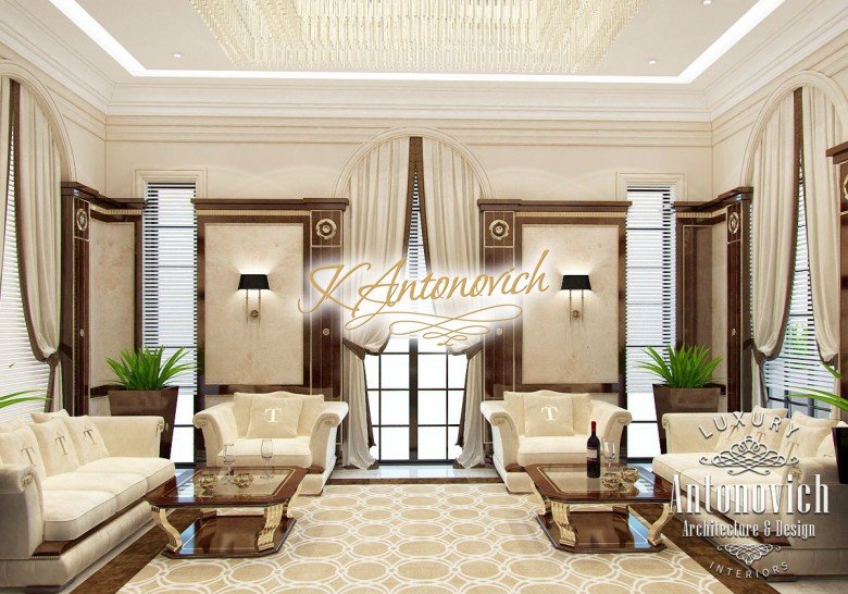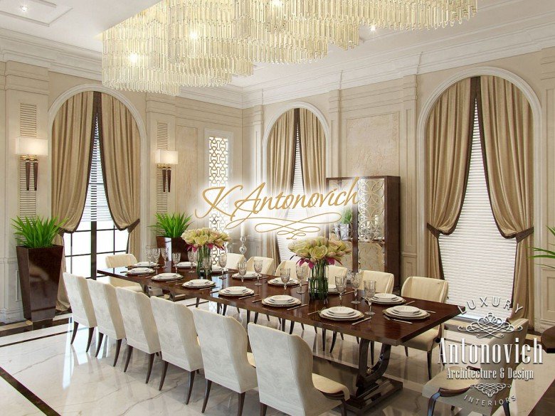 Интерьер виллы в Дубае подчёркивает архитектурную планировку дома. В этом проекте дизайн интерьера виллы в Дубае подчёркнут через масштабные решения: просторная гостиная простирается на всю высоту здания, лестница в интерьере холла выступает главным украшением. Сам дизайн виллы в Дубае подчёркивает масштаб пространства. Дизайнеры усиливают образ повторяющимися мотивами отделки пола и потолка. В проекте гармонично сочетаются современный и классический стили — сочетание классики и модерна придаёт интерьеру свежесть. Лёгкая гамма оттенков наполняет пространство ощущением свежести, что продолжается в интерьере гостиной. Кремово-молочная палитра разбавлена акцентами из темного дерева ценных пород — отделка темным деревом придаёт глубину. Гостиная с арочными окнами украшена кремовыми шелковыми шторами. В проекте использованы кремовые шелковые шторы для арочных окон, а освещение для праздничной атмосферы стало основой торжества. В целом интерьеры гостиной и столовой характеризуются сдержанностью в духе английской классики. Спальня в духе английской классики отражает сочетание традиций и современных технологий. Уникальные дизайнерские решения наполняют пространство стильным романтическим шармом, а дизайн домашнего кинотеатра для виллы и столовая и гостиная открытой планировки подчёркивают гостеприимство владельцев.