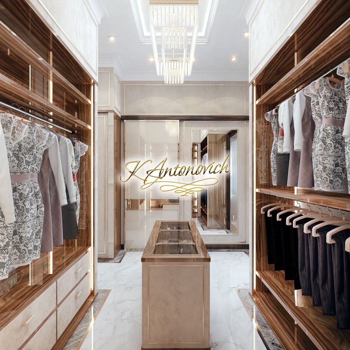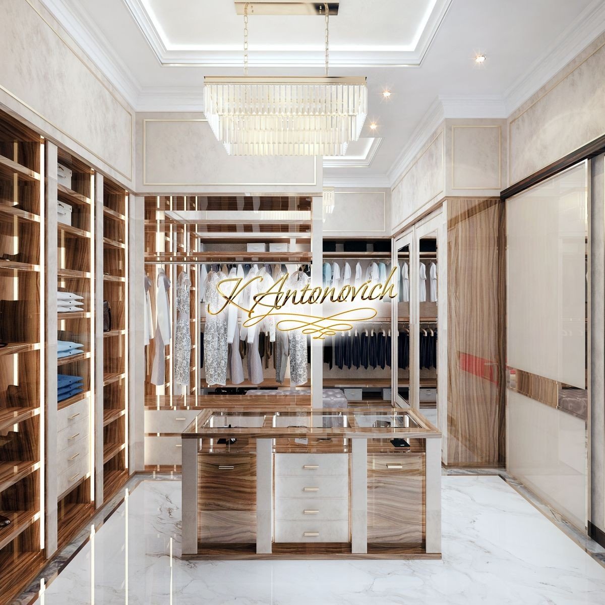 Organize your closet with us. Luxury Antonovich Design provides you not only the top quality materials but also the most high-tech designs. We also have a rotating cabinet where you can see all of your shoes, or ties, and it will rotate and you can just pick whatever you need.