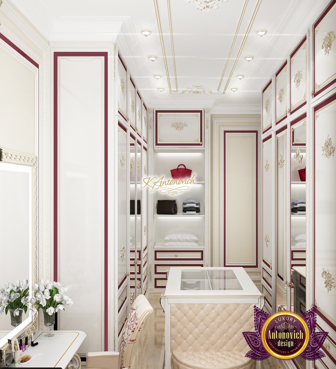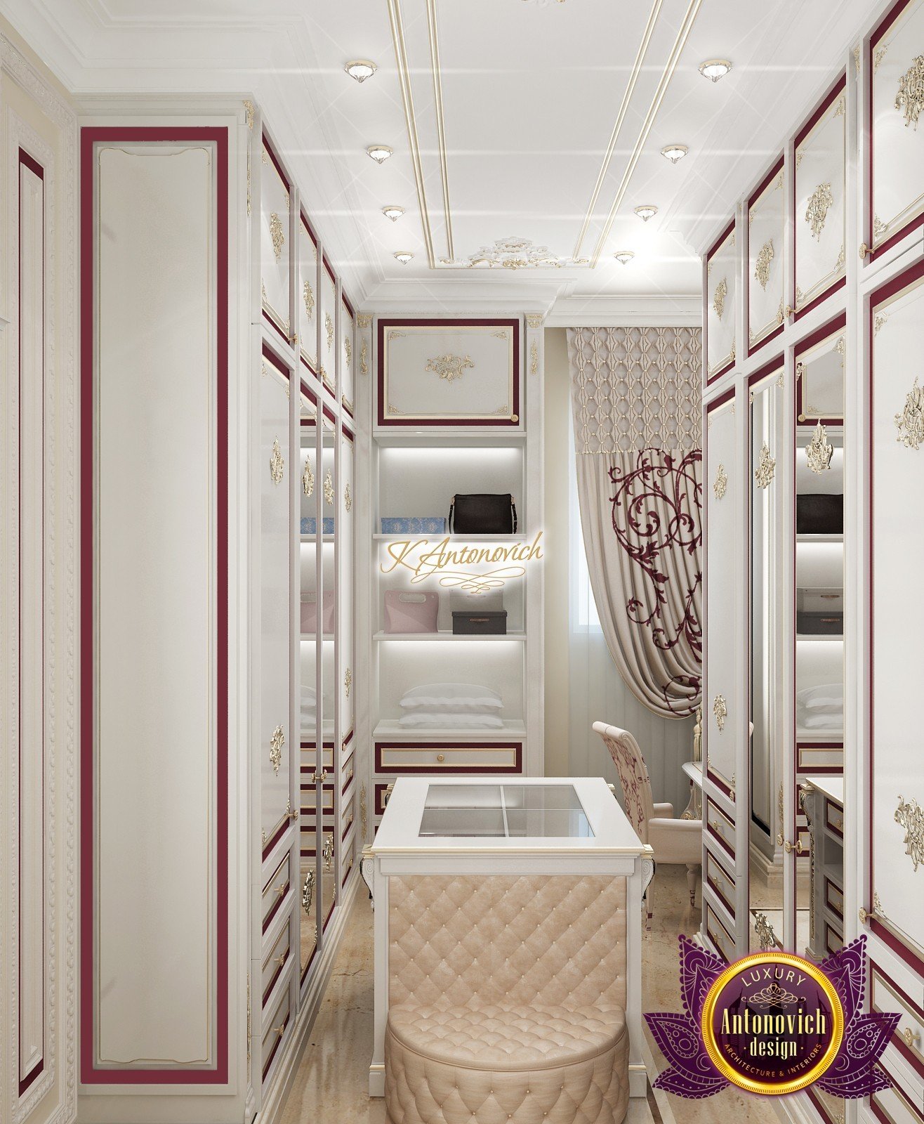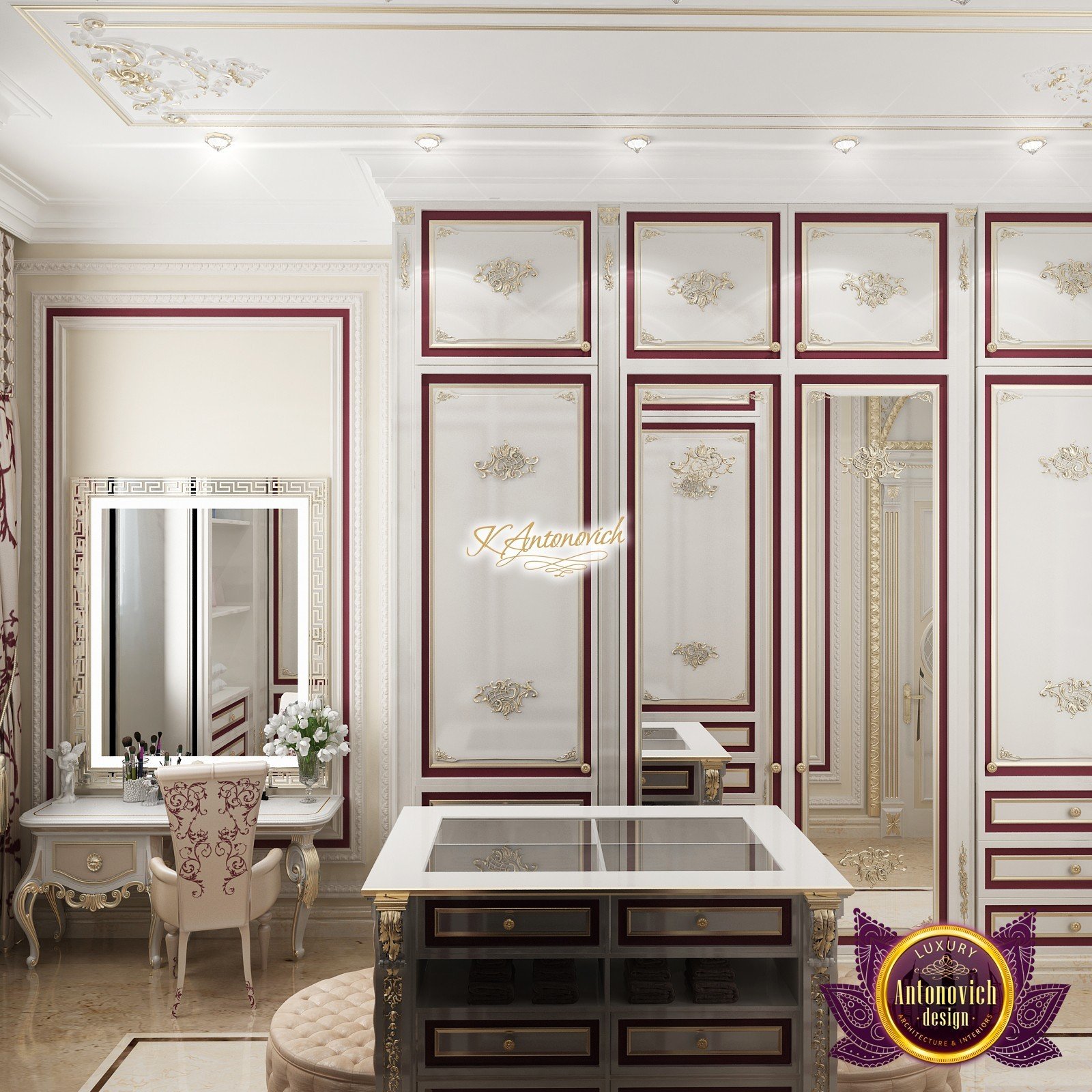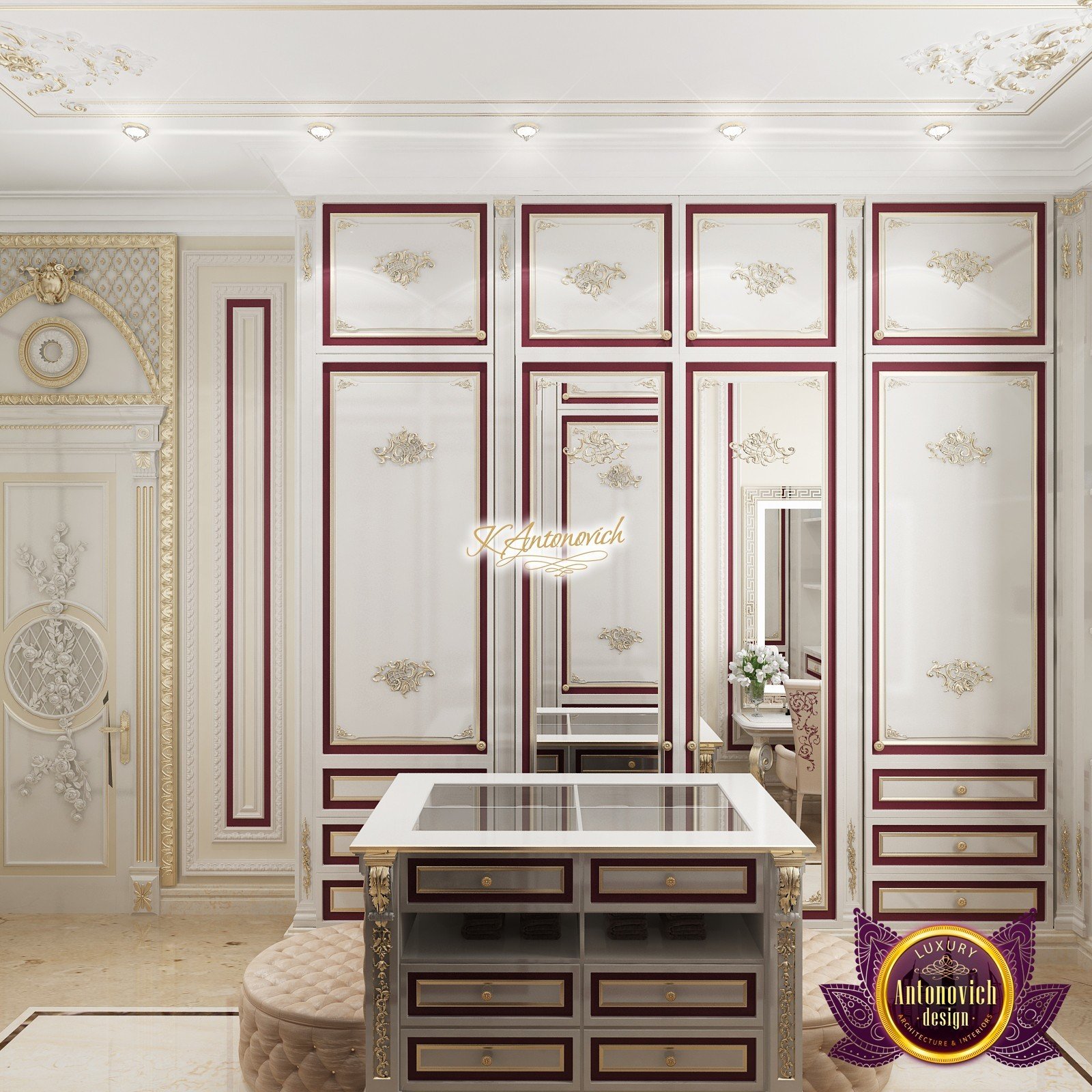 The Antonovich Chic dressing room is the result of a neoclassical combination of the classic Victorian era with a Greek Corinthian column and entablature. The white background wall amplifies the red and gold borders of the cabinets and dressers. The shades in the room help matching outfits easier; the white background serves as a blank paper to where you can combine everything unlimitedly based on the wideness of your imagination. The pristine appearance of the room was achieved with the aid of lights carefully placed in specified areas to give you a clear and crisp image of your reflection on the mirror and also, to heighten the dramatic effect on the drapes and furniture.