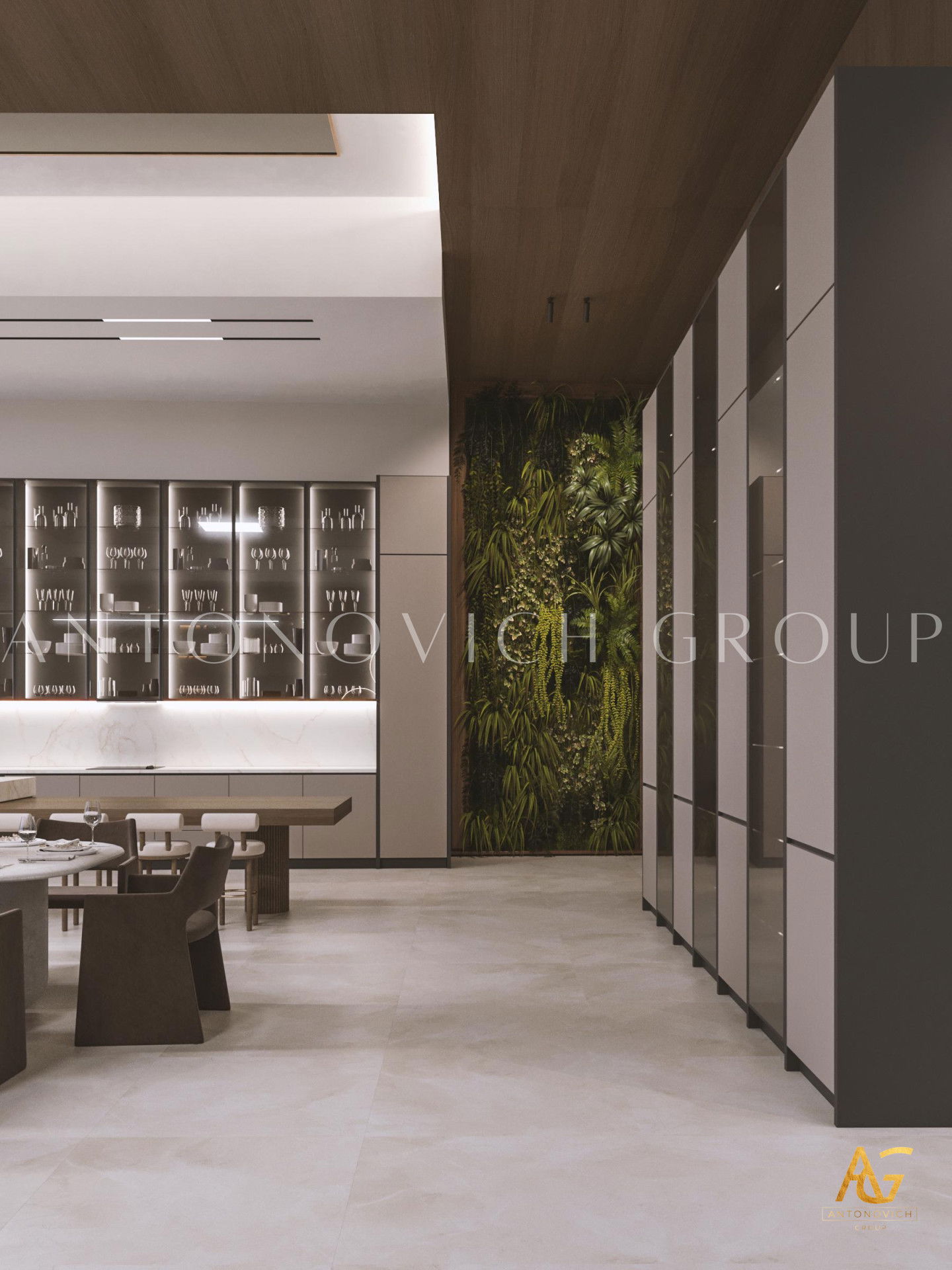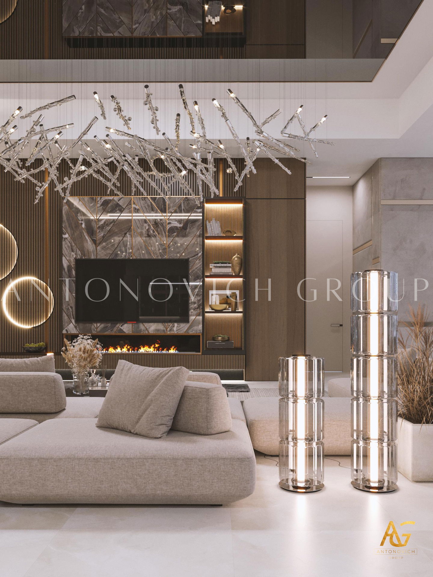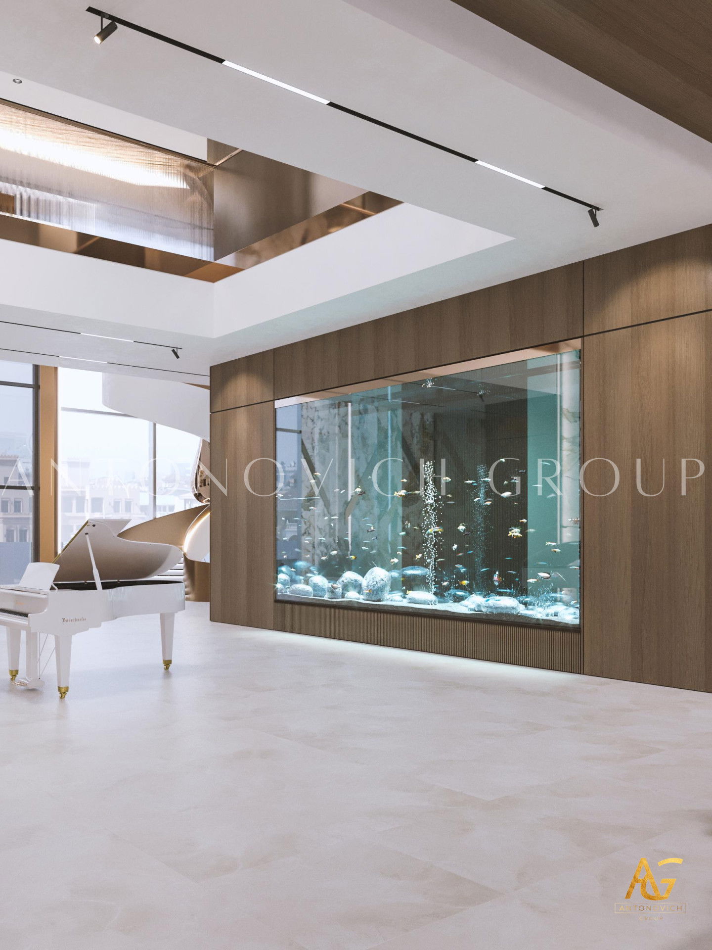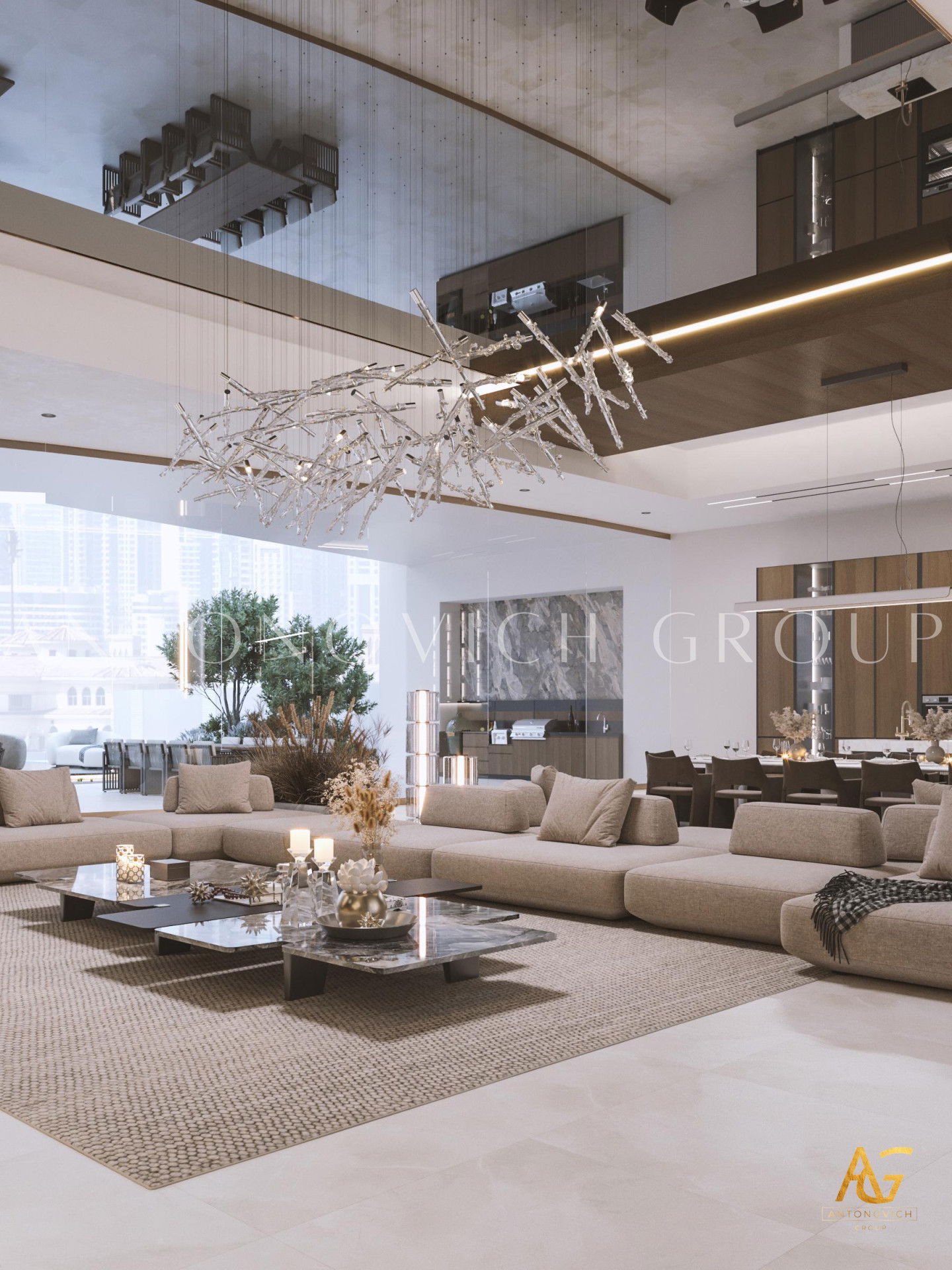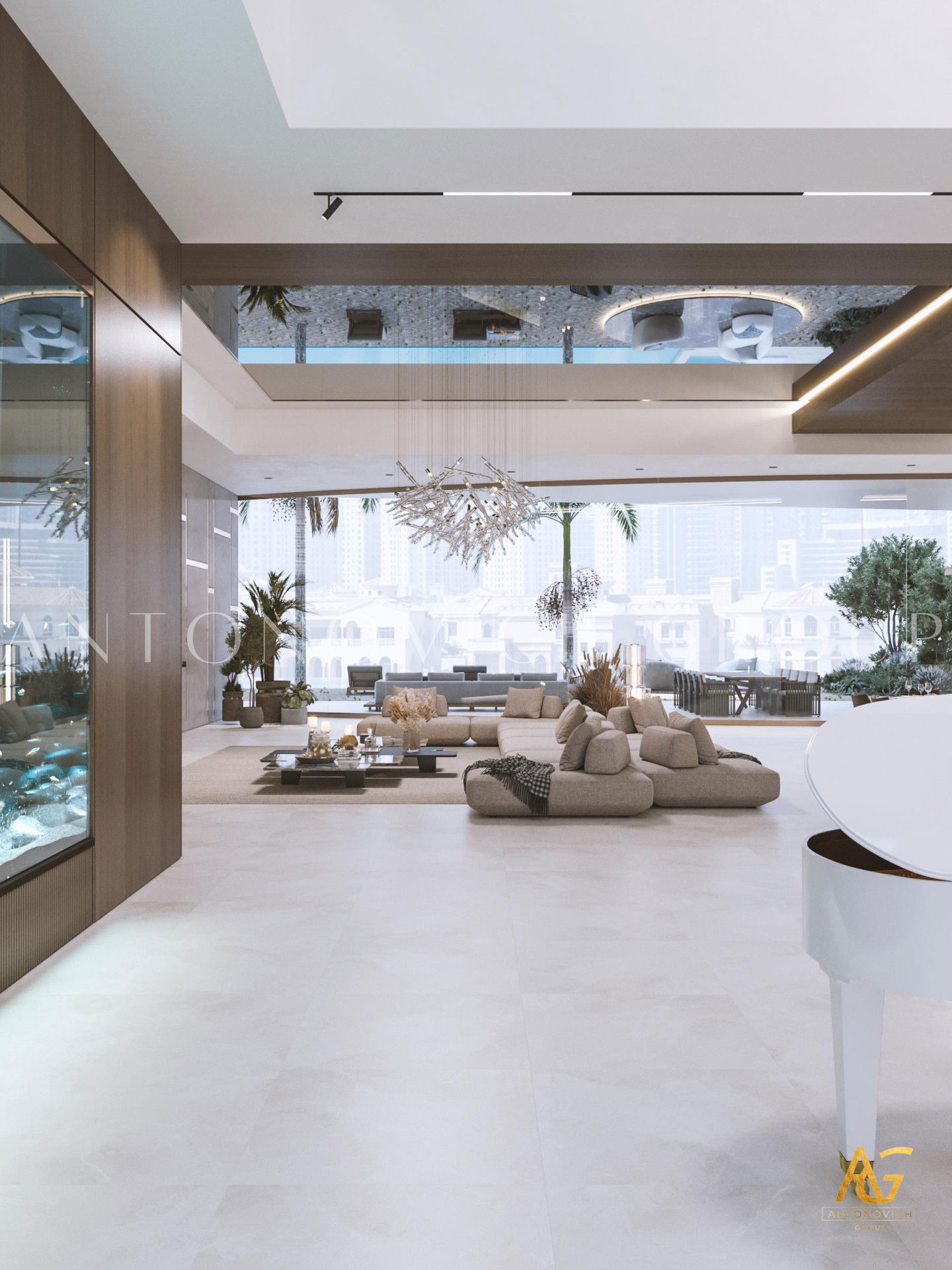 Graceful labyrinth of luxury and comfort. It was such a wonderful association formed by contemplation on luxury living room interior of luxury apartment in Dubai. The apartment design combines the motives of contemporary style and Art Deco. Interior Designers, as always, have created a unique beauty of the interior with bright and unique character. The space is organized in a way that creates a wonderful feeling of infinity of luxury and warmth of home comfort. Living room design is closely related with the kitchen design, dining room design and hall design. As all of these areas are a single entity. Interior designers Dubai offered to place dining room area at the large panoramic windows. And the owners of apartment and their guests can enjoy the contemplation of the beautiful panorama from the window during the meals. A large table is surrounded by upholstered chairs with high backs. Warm and cozy looks oval fluffy carpet, on which there is a dining table and chairs. Living room design today is a deep and multi-faceted process that includes several areas. Ceiling design combines in a single unit a cozy living room space. Curls of niches are delineated with lines of blue lights. The warmth of home is provided with a modern fireplace, which also became a way to distinguish between the living room and kitchen area. Upholstered furniture in milky velvet, against which look charming silk pillows look juicy and bright. The highlight of the interior has become a large aquarium on the partition from the cozy kitchen side.