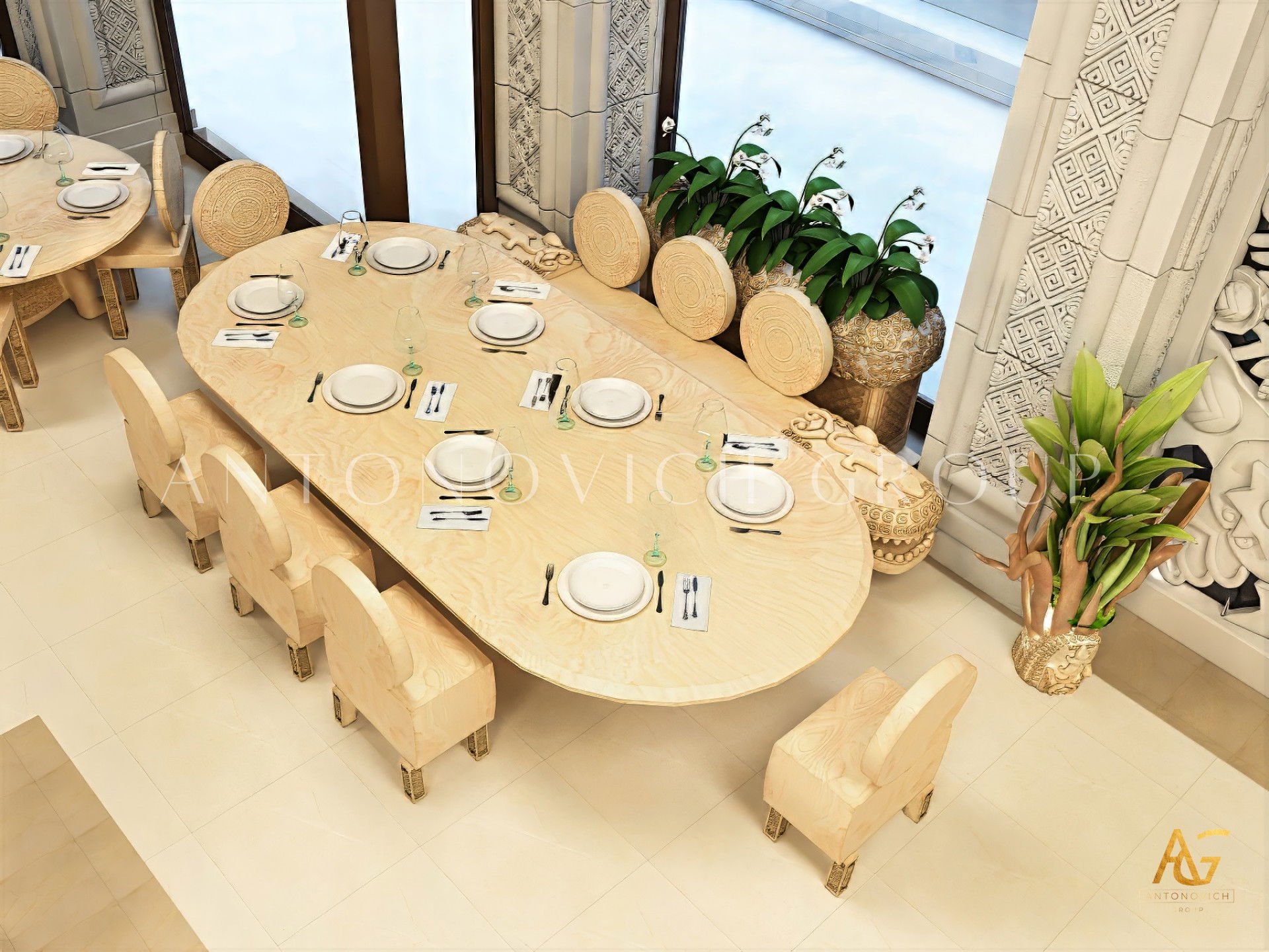 Antonovich Group brings out that the cutting-edge room design always features the most beautiful tones. With the use of dark hues, coloring merges over the opulent area. Various brown tones were employed to highlight the quality of the interior design. This stunning brown luxury Restaurant Interior Design emits a refined air. Everything youll need for a profitable Restaurant design is included in the premium interior design. The modern walls suit the chairs and tables. The brown highlights are stunning, and the sumptuous touches are plenty. The upscale interior design is perfect for a gender-neutral theme that will appeal to individuals of all ages.
