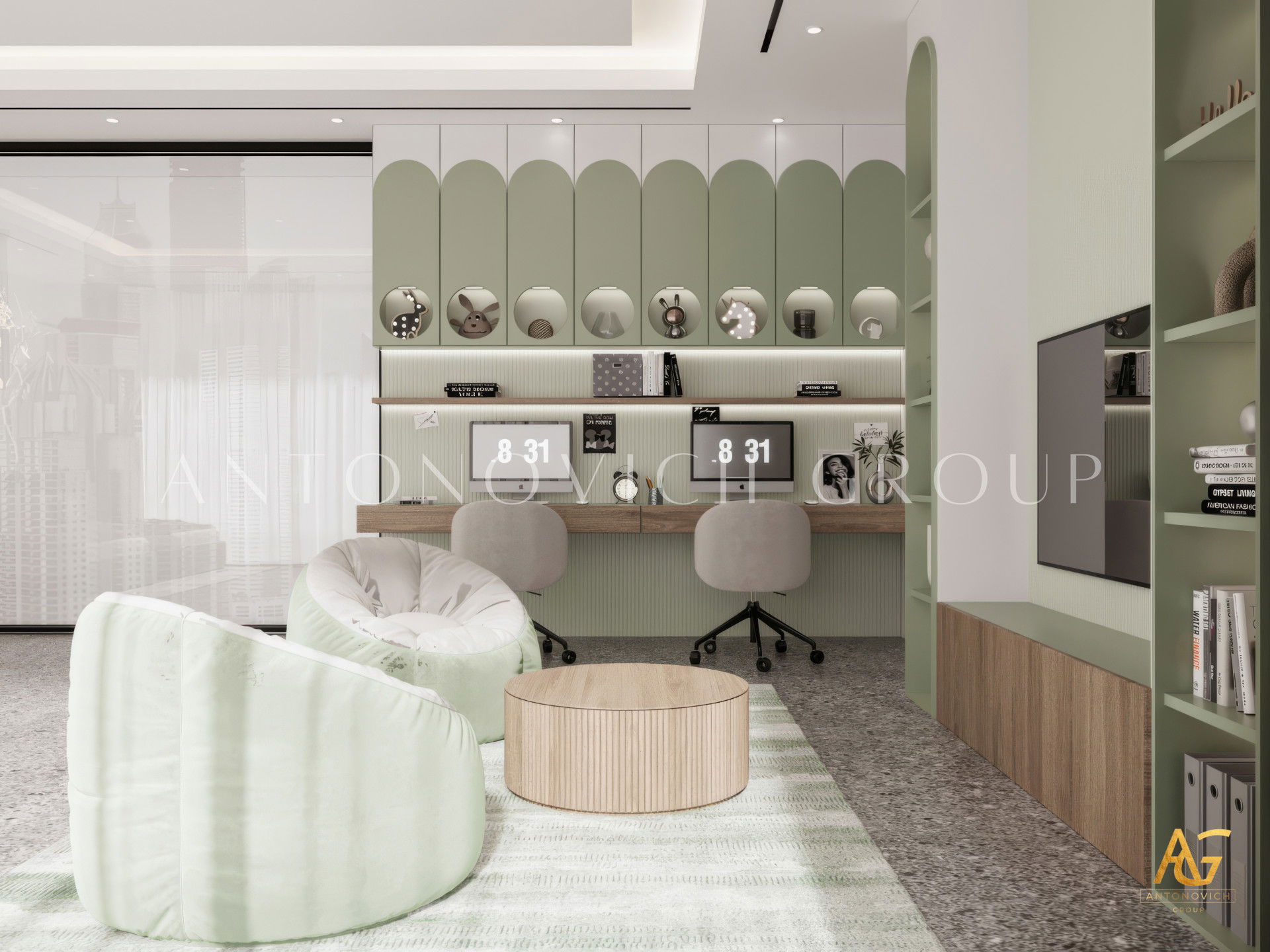 Through innovative space planning solutions, Antonovich Group maximizes every square meter to ensure efficient use of space. Smart storage systems, built-in wardrobes, and multifunctional furniture—such as study desks and bunk beds—allow for a clutter-free and organized environment. This thoughtful planning ensures that the room remains adaptable as children grow, maintaining both comfort and aesthetic appeal.