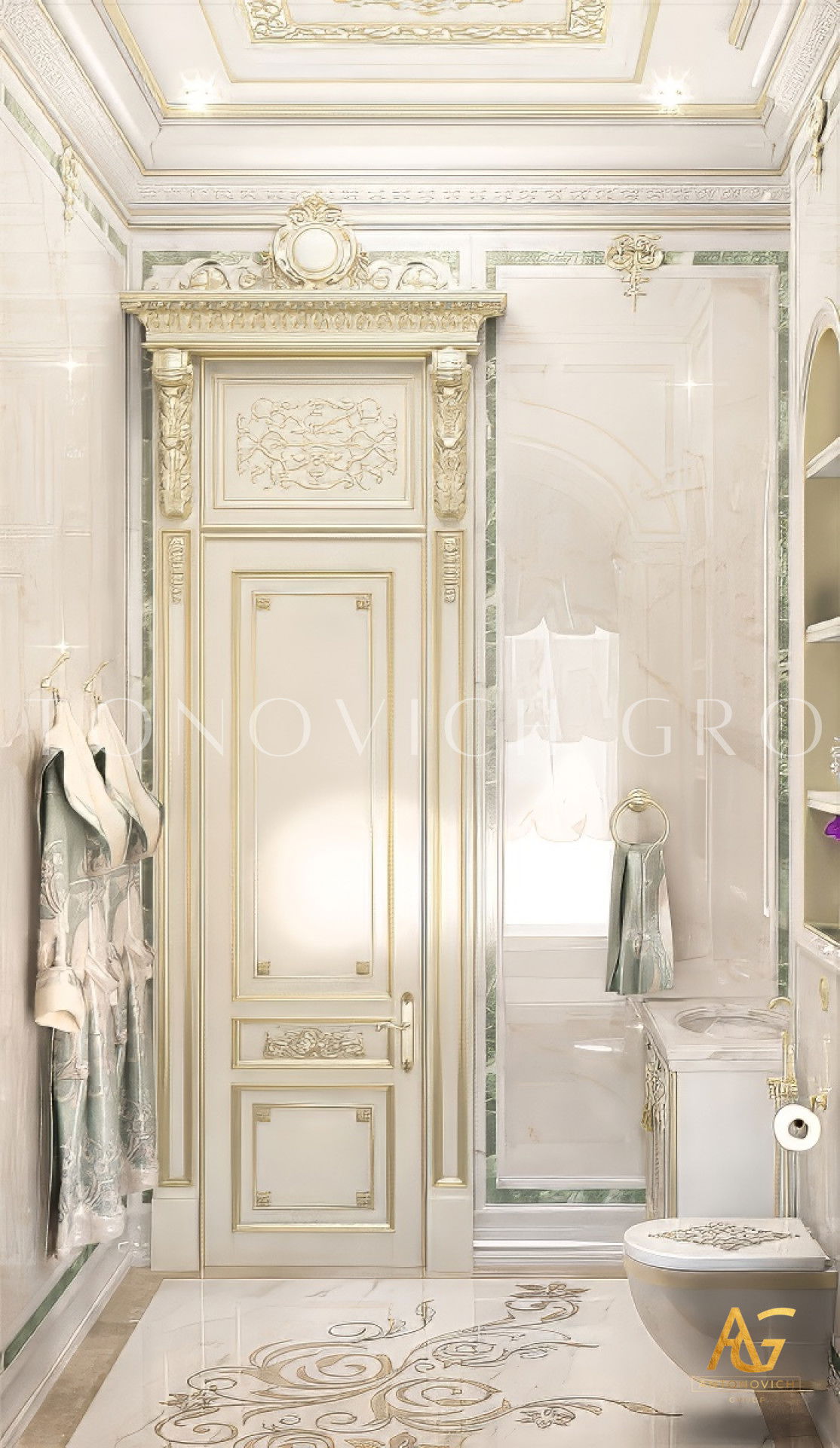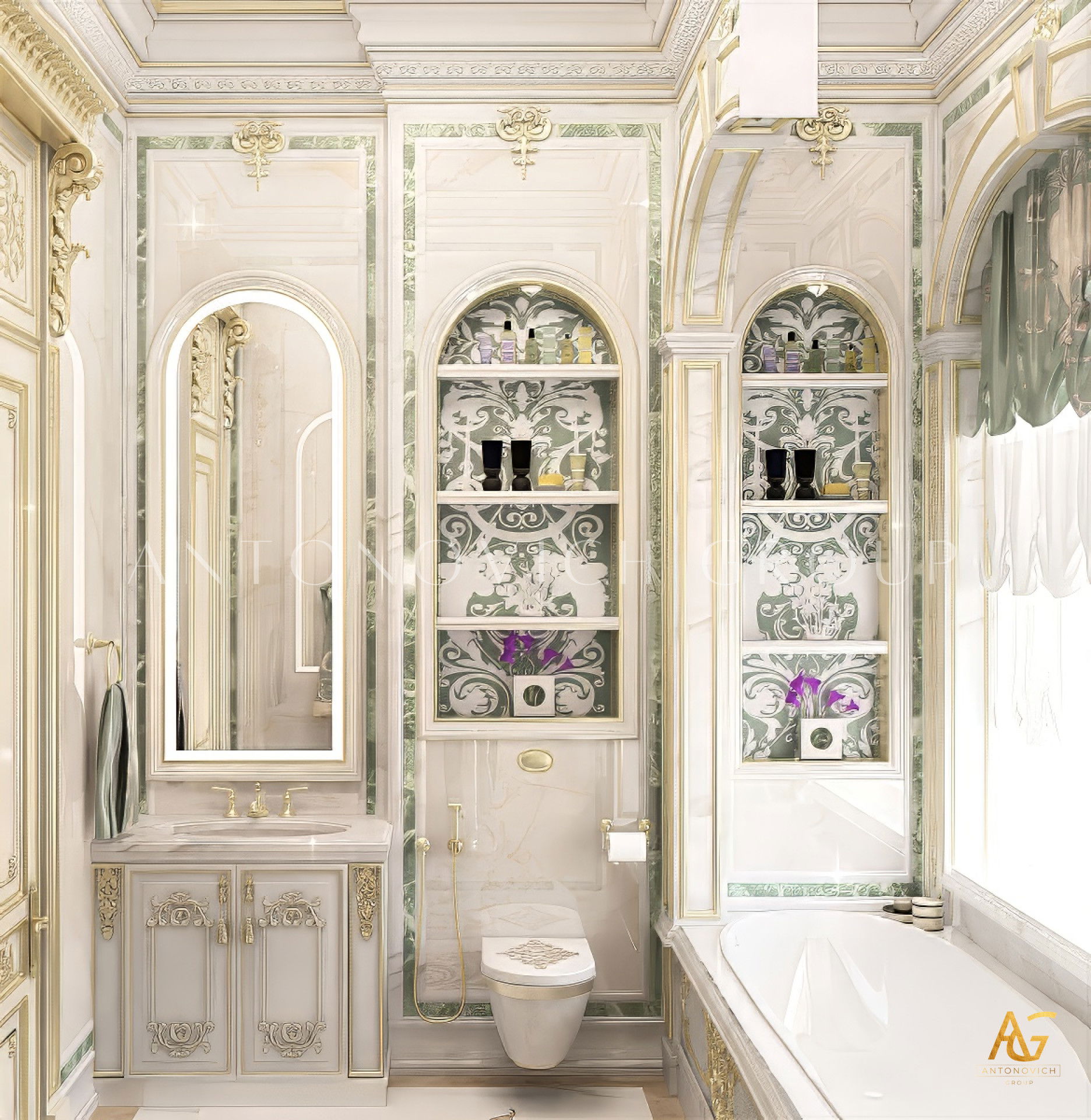 Luxury Antonovich Design has produced a large and luxurious interior design that is finished with marble and white in their latest masterpiece. The toilet and cabinets were carefully placed, and the furniture selection is incredibly opulent, with one-of-a-kind accents. The wonderful decor is obvious in the rooms completion. The aristocratic interior design is enhanced by the gold lines and furniture. If youre looking for some inspiration for your next bathroom interior design project, look no further.