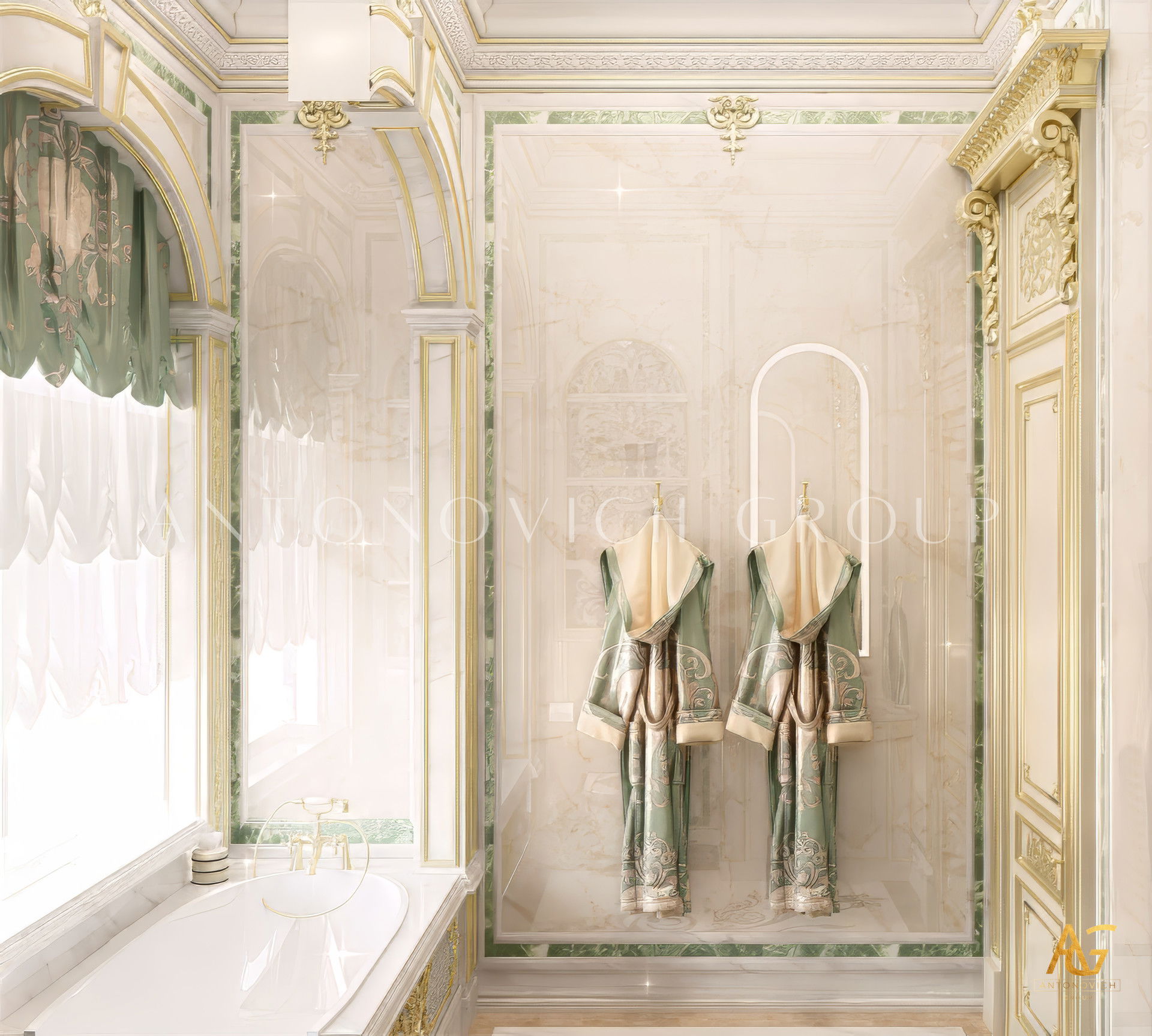 Designed for comfort and extravagance, this bathroom interior is created! The magnificent gold lines, with its clean and attractive pillows, is a sight to behold. The rooms gold line embellishments add to its uniqueness. When it comes to bathroom interior design, Luxury Antonovich Designs works are all luxurious. From the mirror and cabinet rack to the luxurious walls of the rooms, this interior design is finished with luxury materials. Luxury Antonovich Designs furniture was also a beautiful invention.