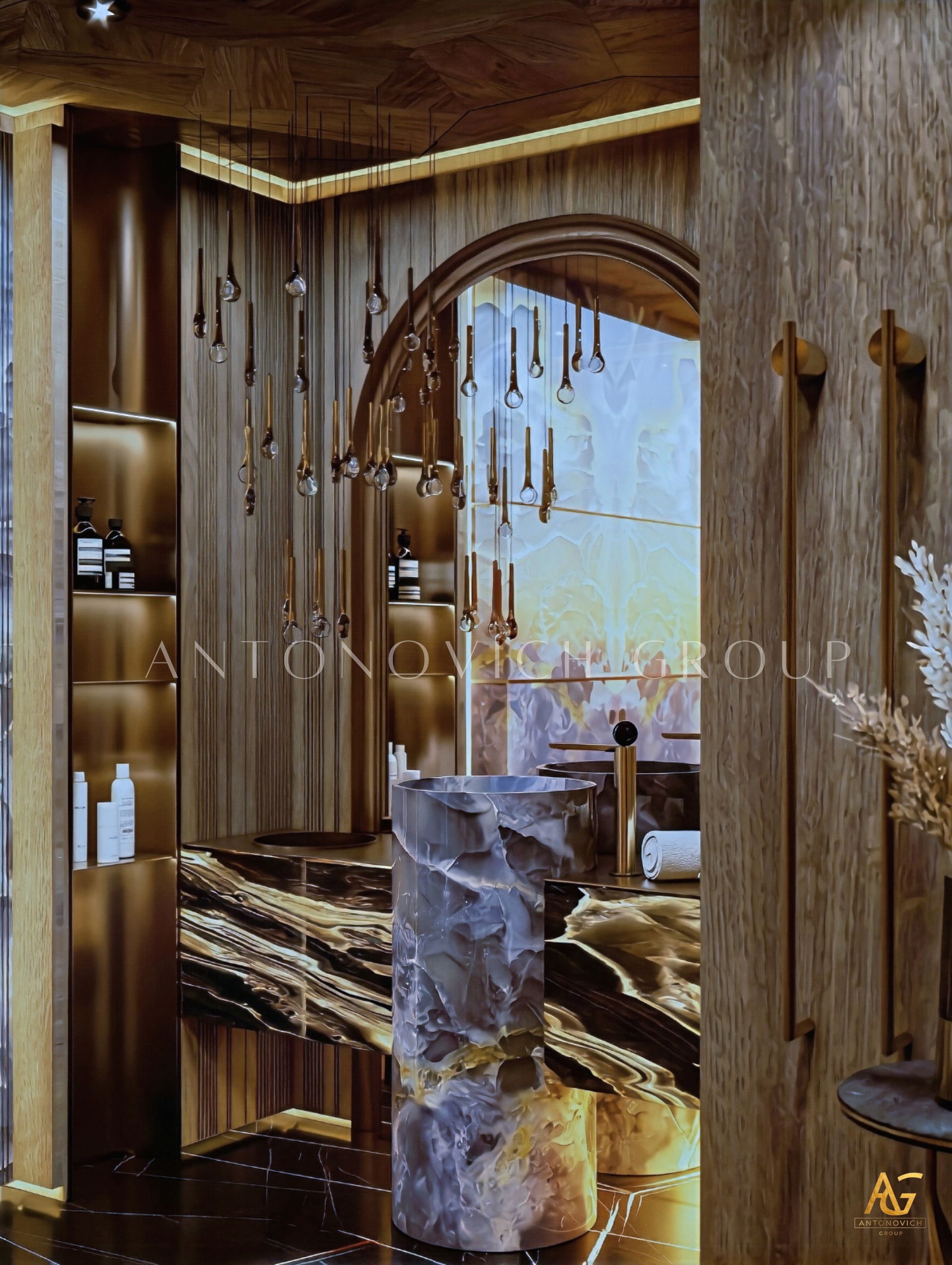 Custom joinery is a defining feature of Antonovich Group’s bathroom interiors. Bespoke vanity units, storage cabinets, and shelving are designed to complement the overall interior concept. These custom solutions enhance both aesthetics and functionality, ensuring a seamless and luxurious finish.