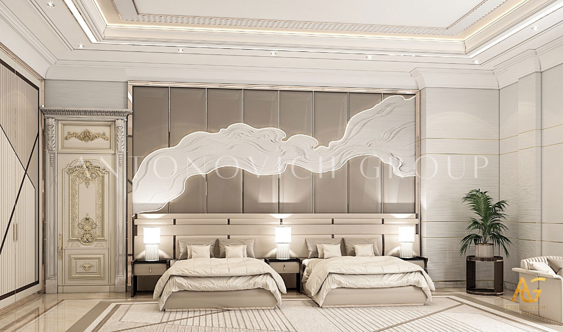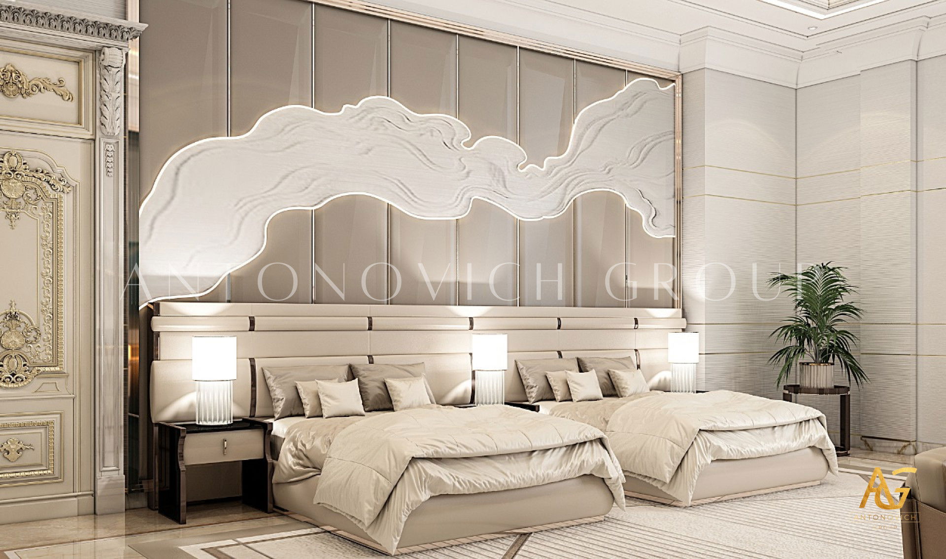 This twin bed indeed creates a very appealing mood towards the bedroom interior as it has the most stylish design which has been very suitable with the luxurious concept of the bedroom. To have a twin bedroom is one of the greatest settings that Luxury Antonovich Design is recommending, most especially for residential properties that require a numerous number of bedrooms. Having a twin bedroom maximizes the space and creates a very functional design for every luxury mansion interior design in Dubai. Consistency in style is another important factor to consider in achieving the best twin bedroom interior design in Dubai. In this twin bedroom interior design Dubai, Luxury Antonovich Design has been selected a set of neutral hues which has been very well highlighted with the most attractive and creative details of decoration. A set of different artistic wall panels has been installed that creates the bedroom extra exquisite and stylish. With its perfect coziness, this twin bedroom interior design Dubai is most likely a luxury hotel bedroom.