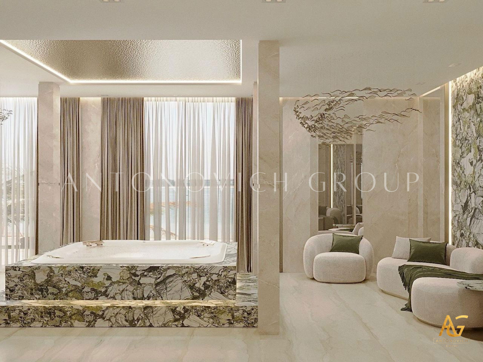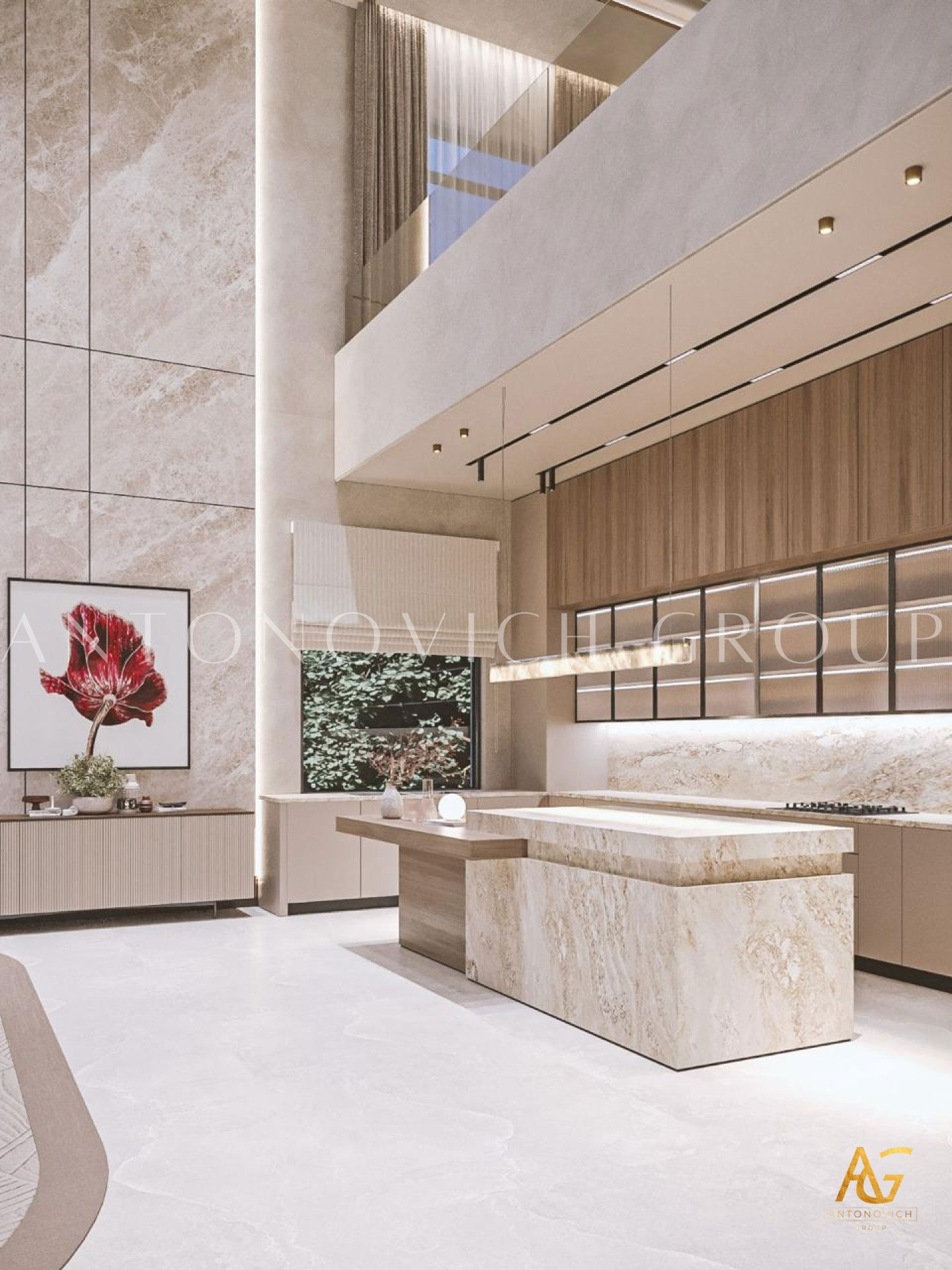 The villa’s interiors showcase Antonovich Group’s hallmark of luxury design. The grand entrance hall immediately sets the tone with bespoke chandeliers, premium marble flooring, and a sense of openness that reflects modern elegance. The living room is crafted as a welcoming yet sophisticated space, blending custom-made furniture with rich textures, decorative finishes, and carefully planned lighting.