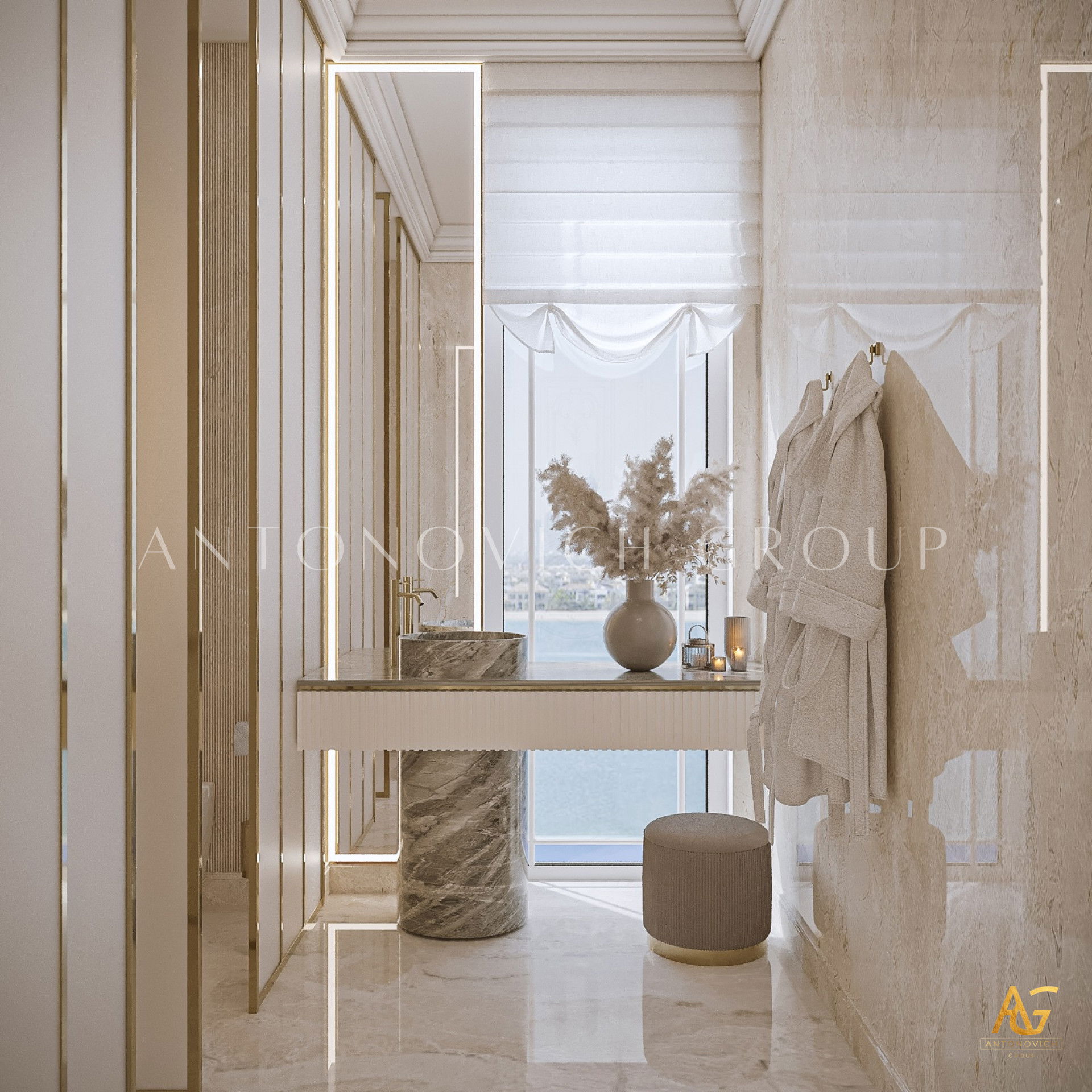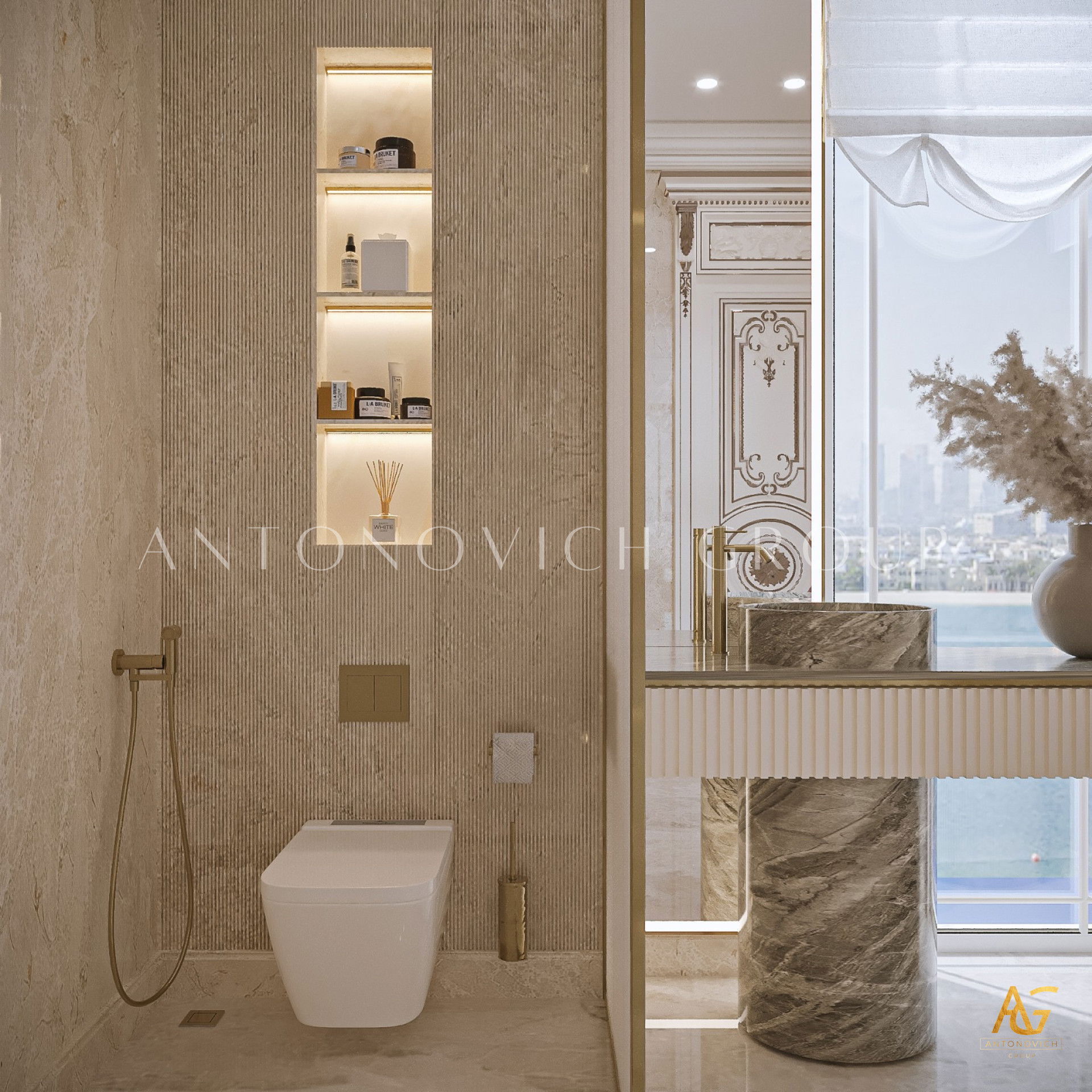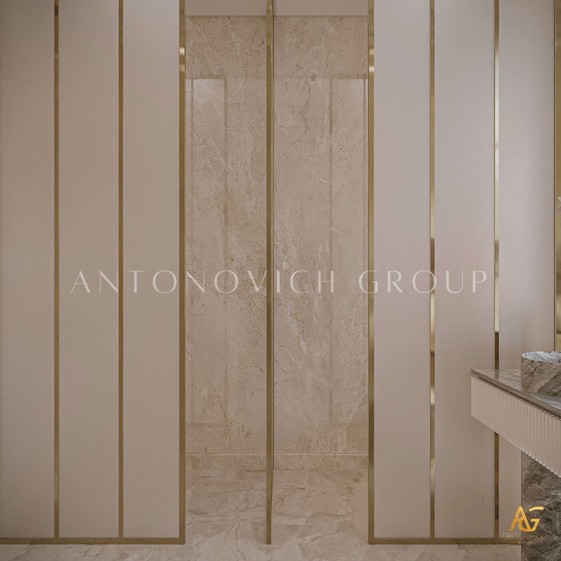 The design of the bathroom in blue tones became a wonderful decoration of the third floor of the elite house. These are interesting and creative solutions for the design of a small bathroom. Interior designers of the studio Luxury Antonovich design created a very bright and elegant image and also stressed the respectability of this house. The stylish design of the bathroom is filled with the mood of the sea breeze and the blue lagoon.In the interior looks great such a luxurious element of the ceiling decor as stained glass. Exquisite ornaments of stained glass frame the elegant crystal chandelier. Beautiful bathroom design impresses with bright solutions in the decor of the walls. One of the walls is decorated with a magnificent mosaic panel in blue tones depicting birds in paradise on the branches of trees.This is an aesthetically perfect image of the interior of the bathroom which, despite its rich decoration, corresponds the principles of convenience and functionality. An unusual design of the bathroom is complemented by a beautiful decor of natural onyx in the form of stripes on the walls and on the floor.To visually expand the space, interior designers use a mirror panel with a facet in addition to the mirror near the washbasins. Neat lines of golden mosaic, which outline all the main elements of the interior decor make more elegant the interior.The design of a bathroom in a private house is a real gem among bathroom designs.