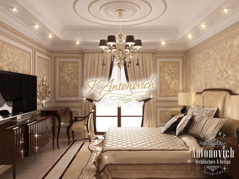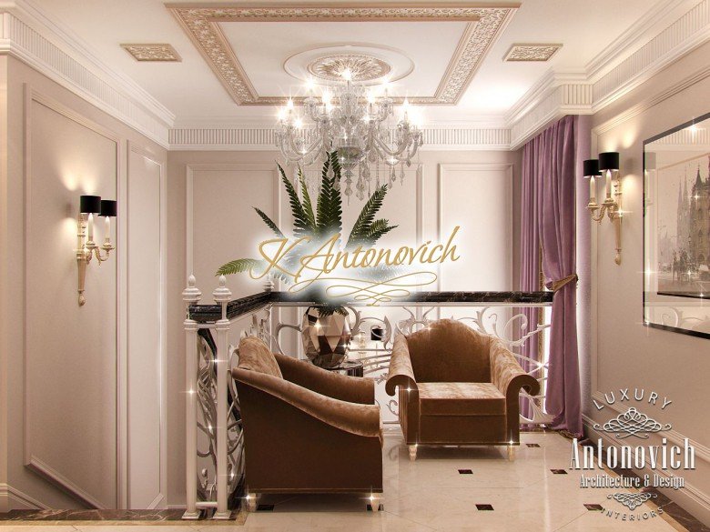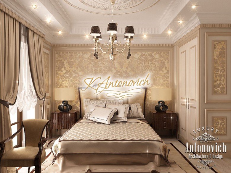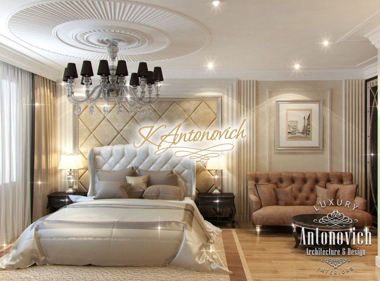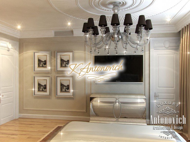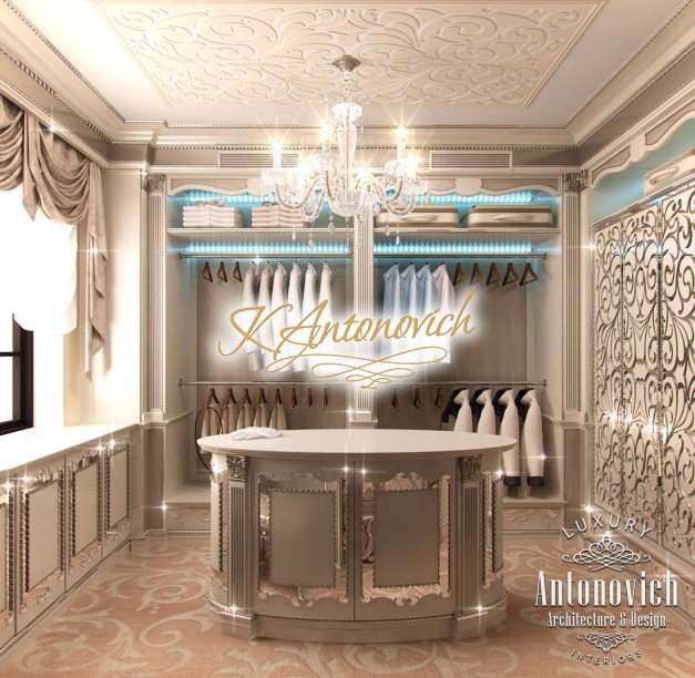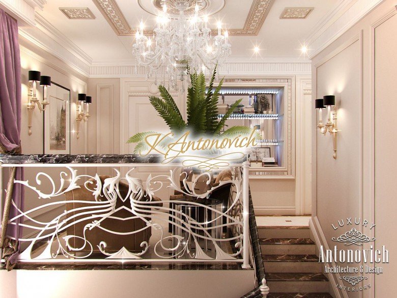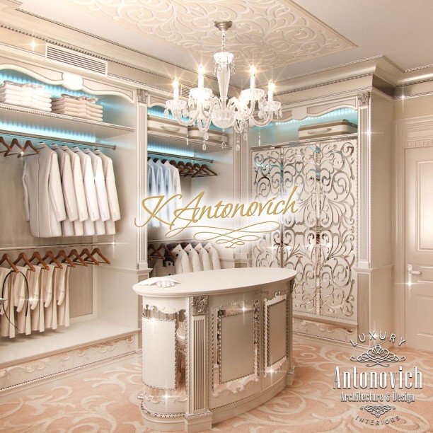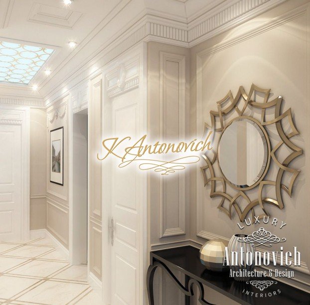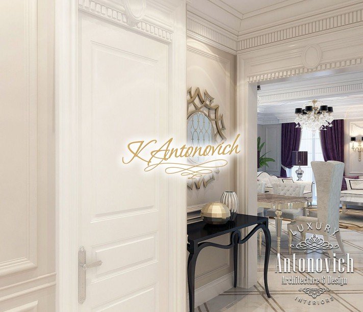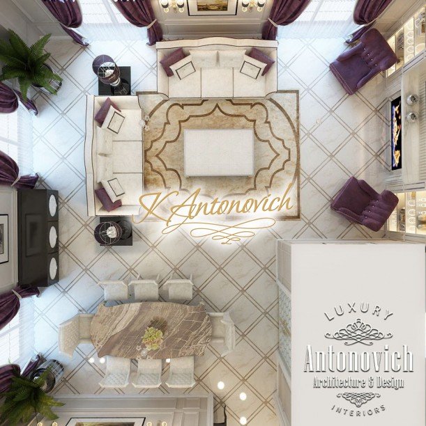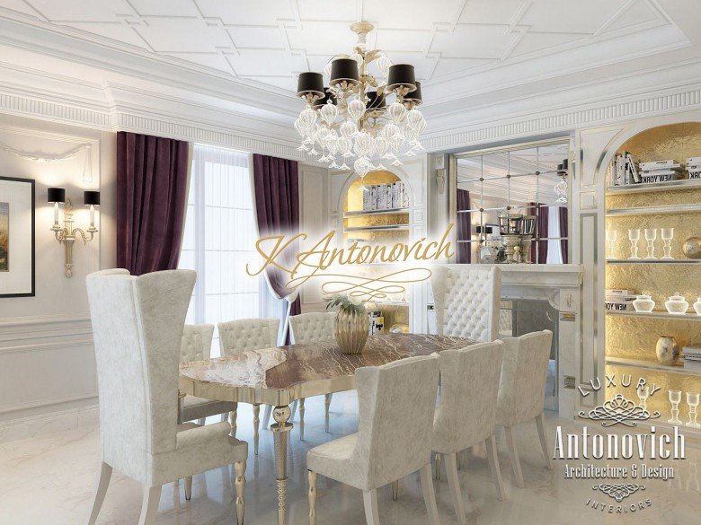 This modern villa reflects brand-new trends of the villa interior design. This style can be described as a modern classics. And in works of Luxury Antonovich Design, it acquires unique and beautiful features. A living room interior, which is combined with a dining area, has a bright image. The basis of the color range is light and milky-white. On this background, luxurious velvet curtains of eggplant hue look stunning. All furniture is upholstered in soft silk velvet of white color. Sofas and armchairs for emphasis are decorated with inserts of dark silk shade. The main way of zoning the interior space has become a modern villa ceiling decor. Large rectangular niches with decorative geometric patterns define the living and dining area. In the center of each slot, the interior is decorated with an elegant chandelier and additional lighting lines. In the dining area, the modern fireplace is complemented by mirror panels that visually expand the space. The interior design of the modern villa exudes nobility and elegance. On the walls, lamps and paintings look stylish and expressive. The light expanse of marble floor blends with a natural carpet in the living room. All these moments of elegance and sophistication continue in each room. Two comfortable bedrooms have a gentle image. The interior designers have added a few elegant notes in a bathroom and a dressing room.