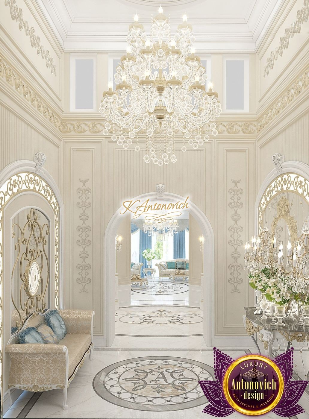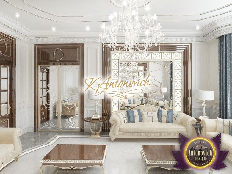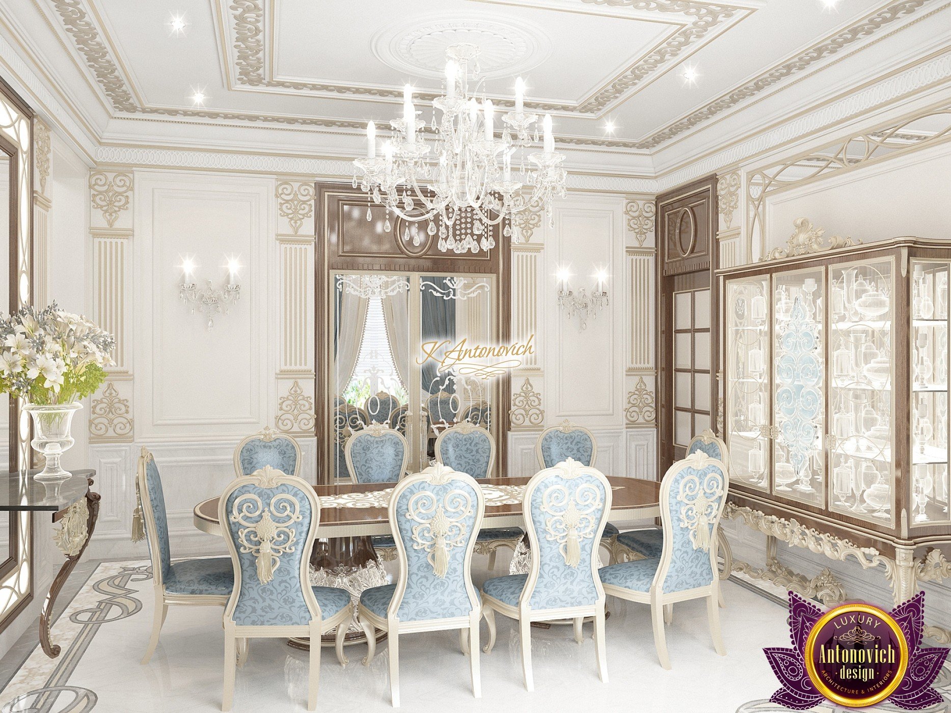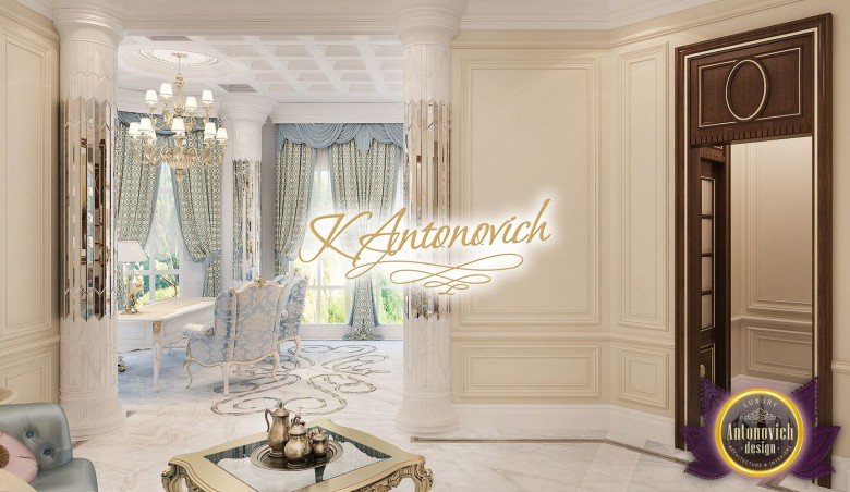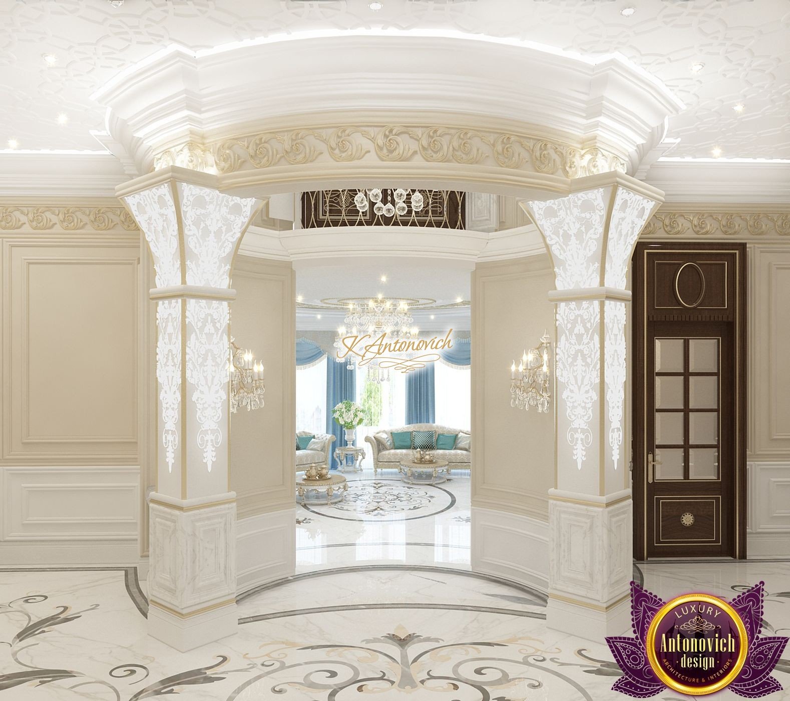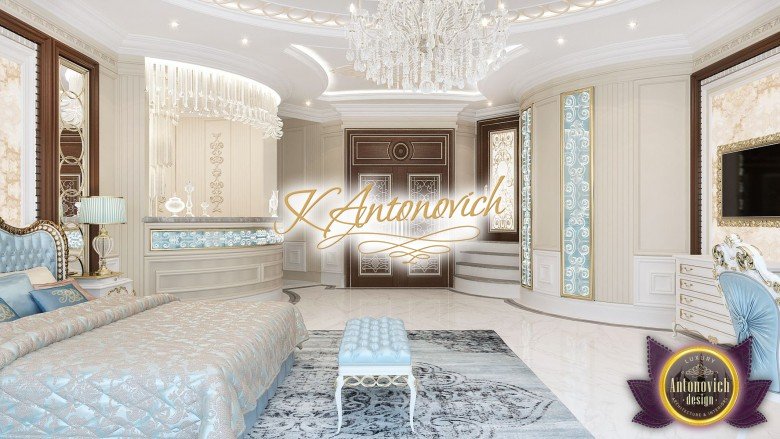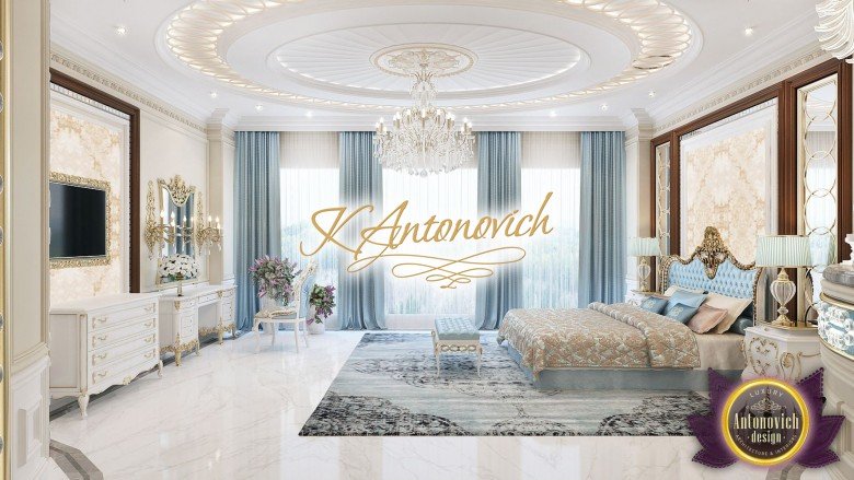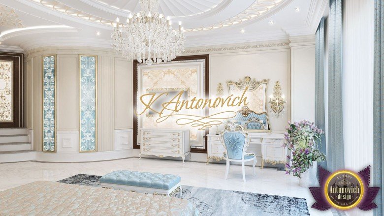 house interior has a very bright and easy nature. The first floor of the house - it is an open space, were very harmoniously combined living and dining hall. To visually zoning the interior, authors of the project proposed an original decor floors and ceiling. Floors made of white marble are multilevel. The dining room is elevated on a podium. And from the hall to the living room, you can go down by the semicircular marble steps. Blue curtains of silk became an excellent way to complement the interior expressiveness in the shining snow-white tones. The interior of the hall and dining room, interior designers offered an interesting way to expand the space. Such a method are frequently used in simple house plans. By using mirrors, which are opposite each other, it turns a beautiful illusion of infinity of the luxury interior. The luxury villa is full of romantic festive atmosphere and gives very pleasant emotions.