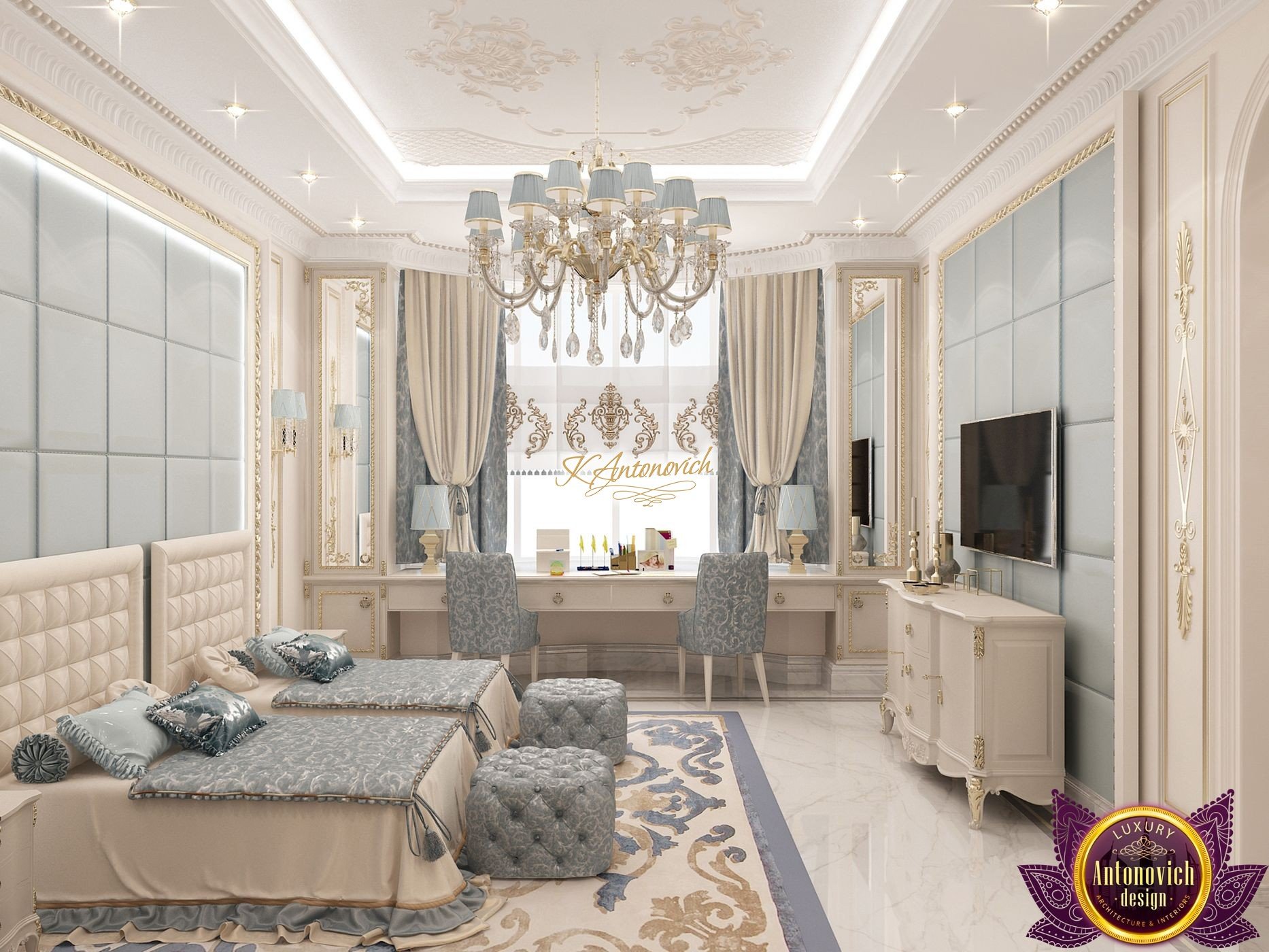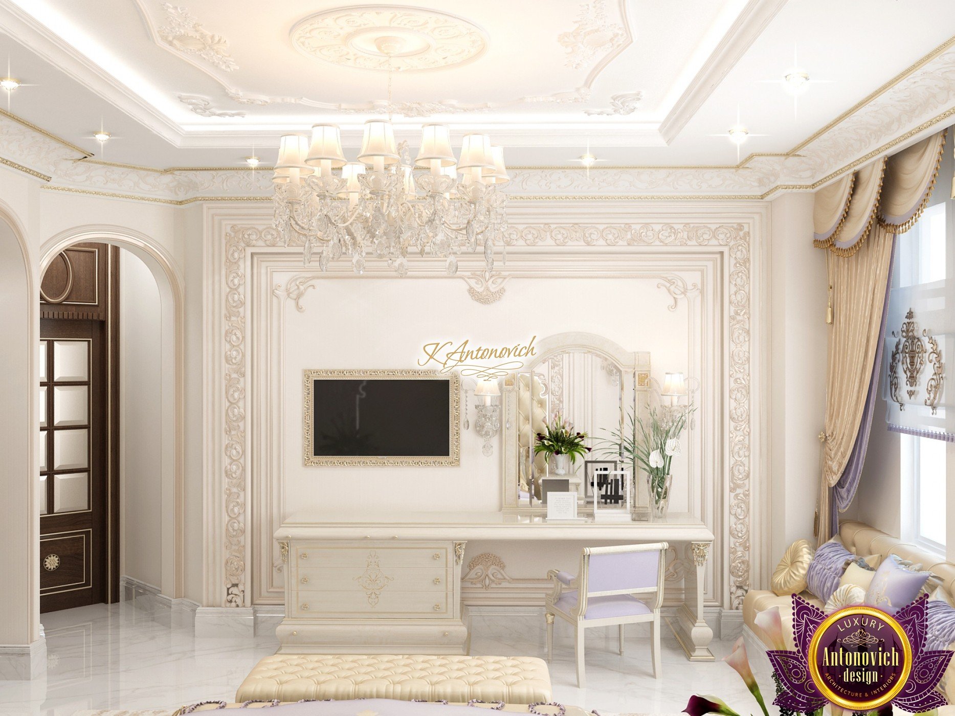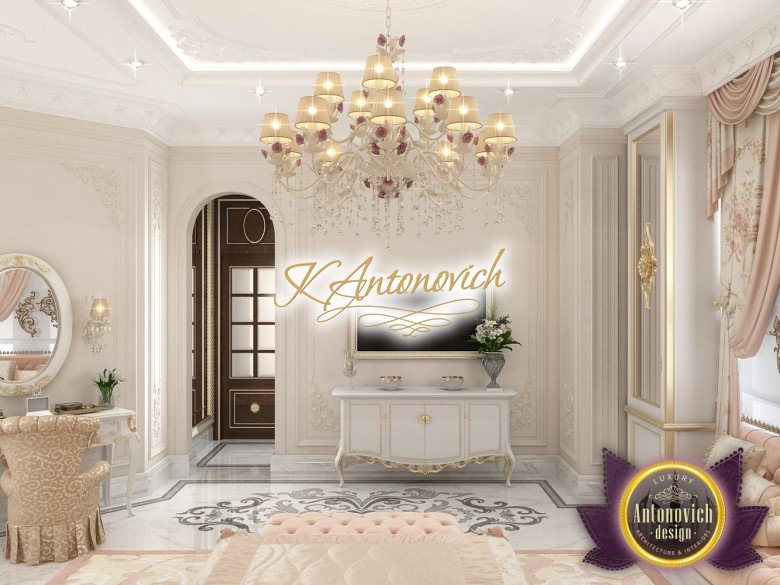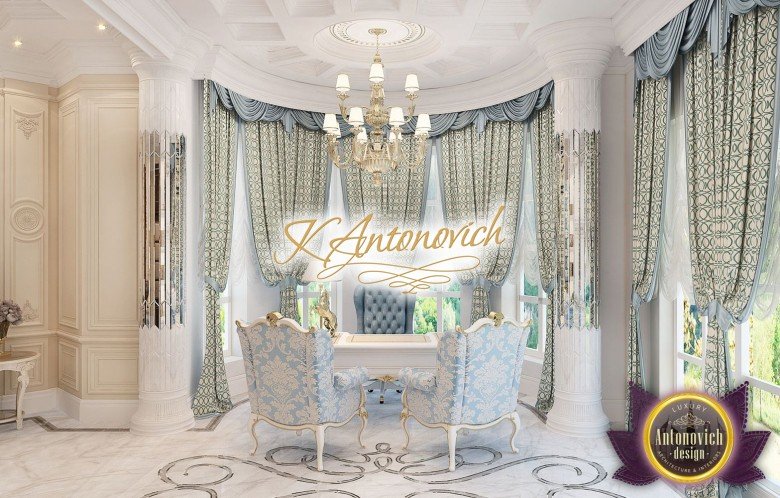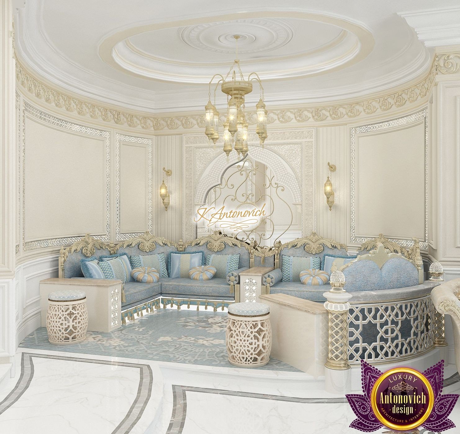 house interior has a very bright and easy nature. The first floor of the house - it is an open space, were very harmoniously combined living and dining hall. To visually zoning the interior, authors of the project proposed an original decor floors and ceiling. Floors made of white marble are multilevel. The dining room is elevated on a podium. And from the hall to the living room, you can go down by the semicircular marble steps. Blue curtains of silk became an excellent way to complement the interior expressiveness in the shining snow-white tones. The interior of the hall and dining room, interior designers offered an interesting way to expand the space. Such a method are frequently used in simple house plans. By using mirrors, which are opposite each other, it turns a beautiful illusion of infinity of the luxury interior. The luxury villa is full of romantic festive atmosphere and gives very pleasant emotions.