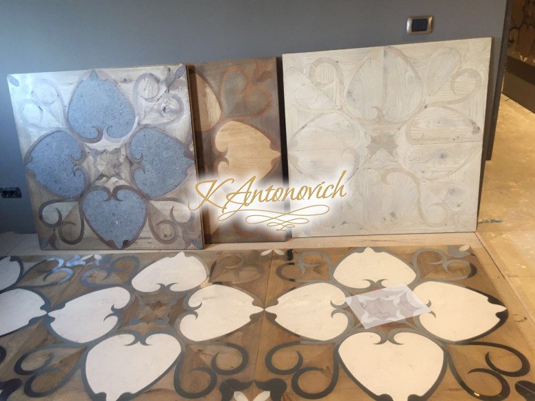 Laying of floors from natural wood with carved patterns and parquet
